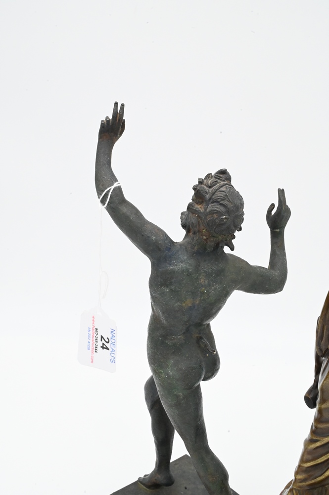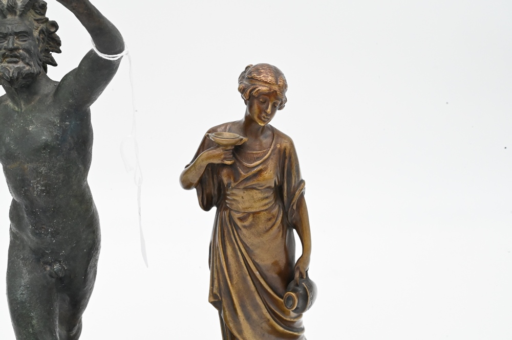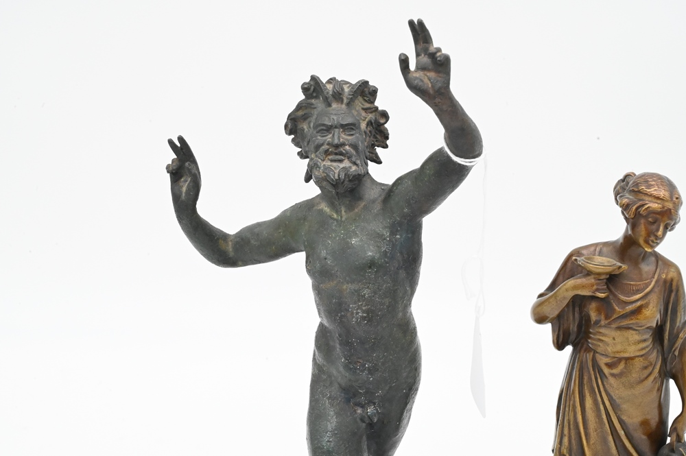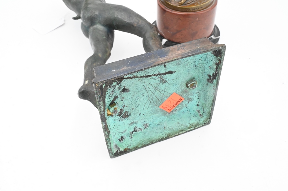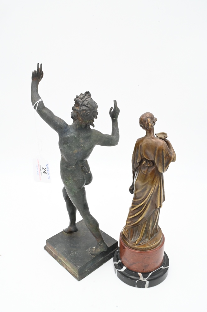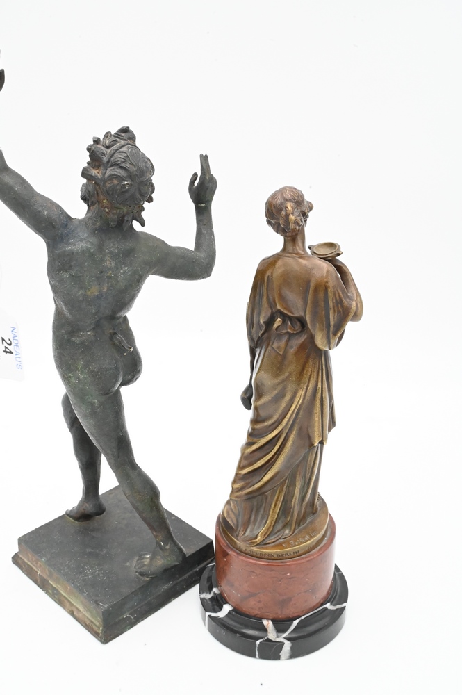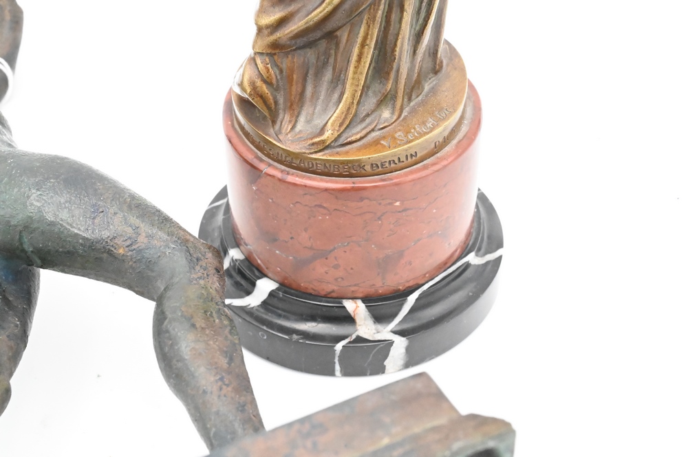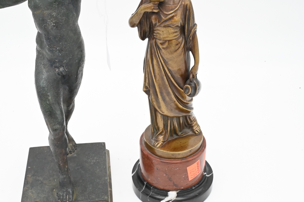 Two Bronze Figures, to include Seifert standing figure on marble base, along with a bronze of a Roman nude male figure; height 13 inches.