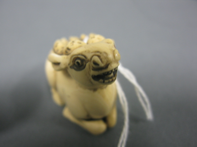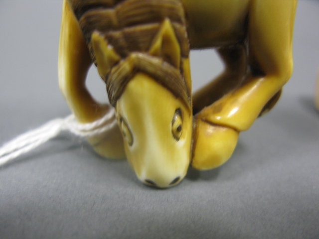 Two carved ivory netsukes one of a deer sitting and one of a horse.
