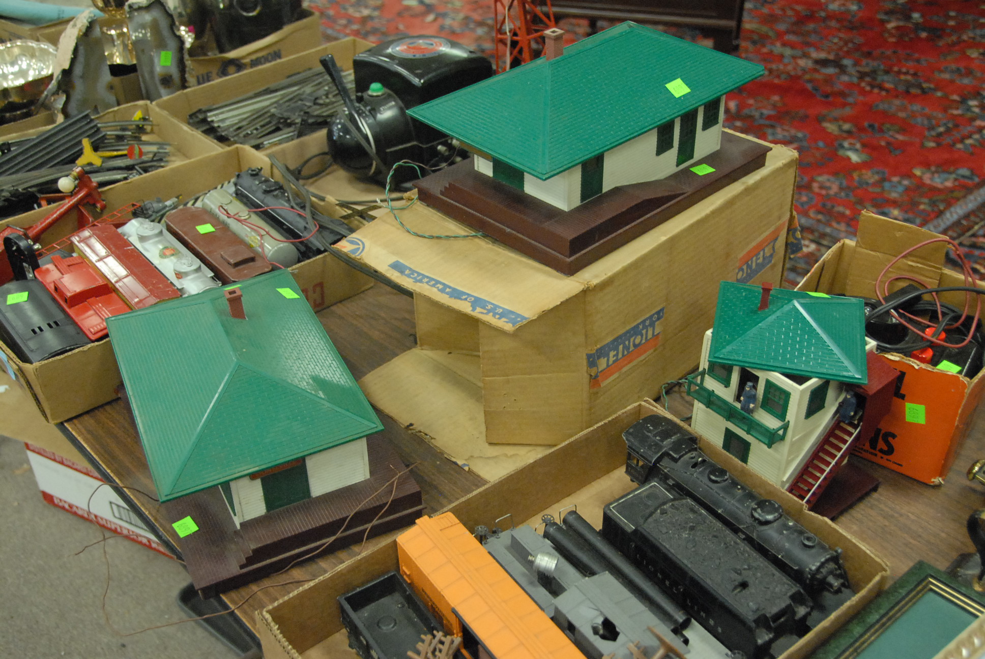 Two Lionel train sets including two transformers and three buildings one building having original box.
