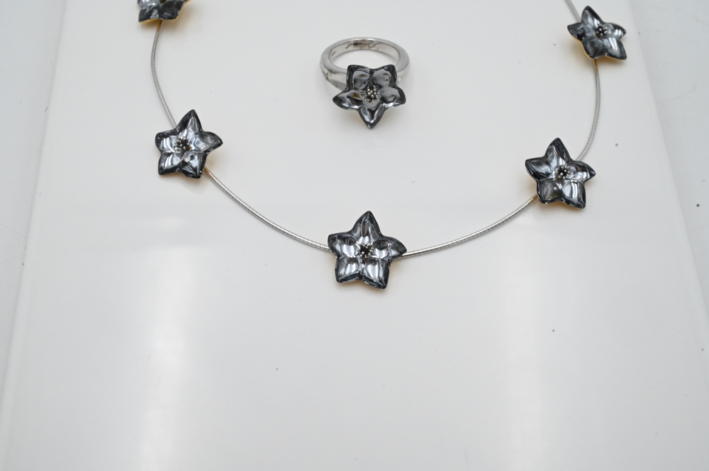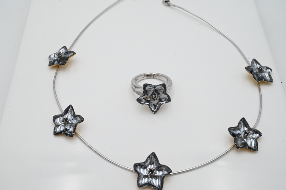 Two Piece Baccarat Silver Lot, to include necklace and ring, mounted with crystal stars, 16 inches.