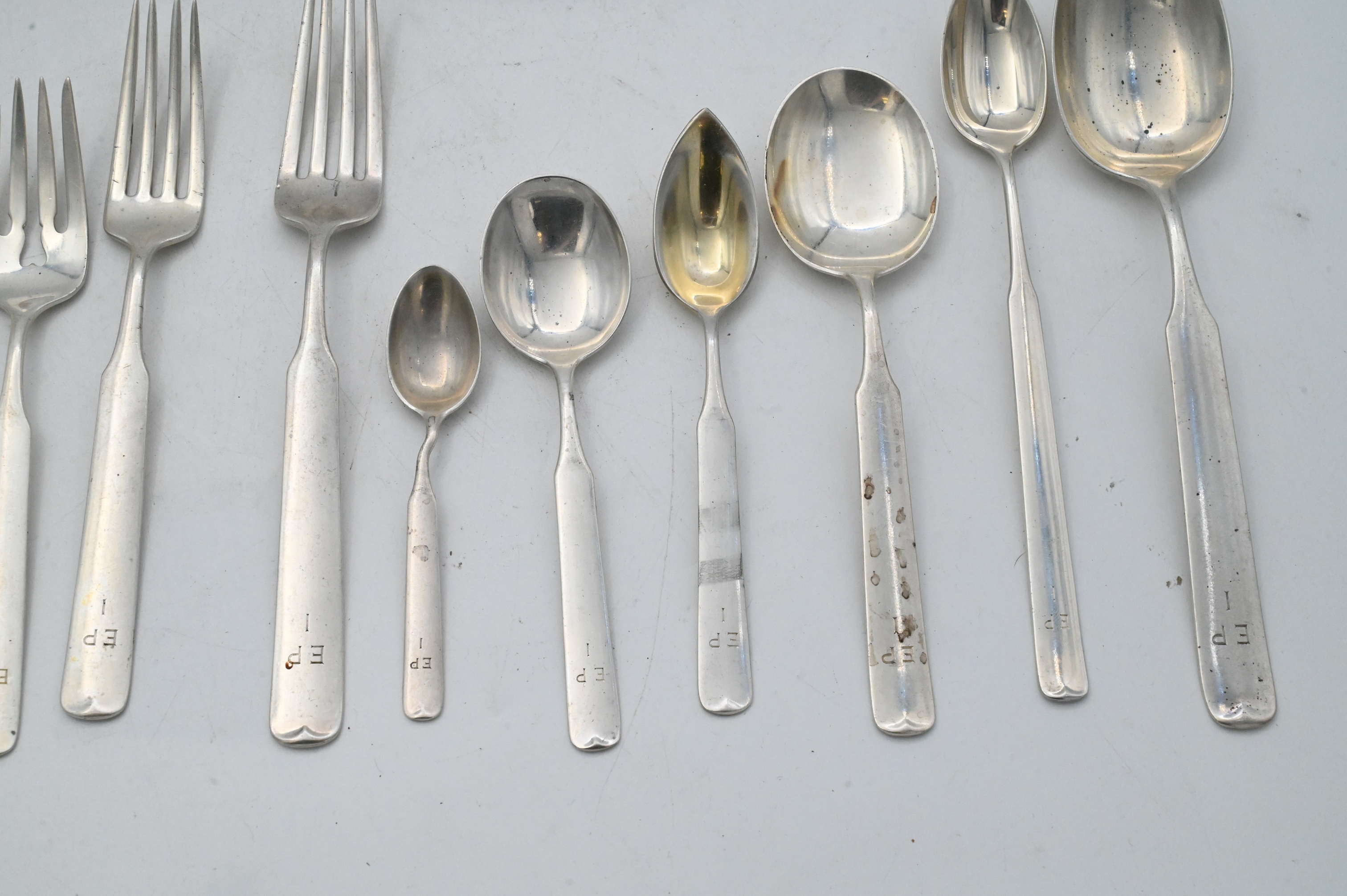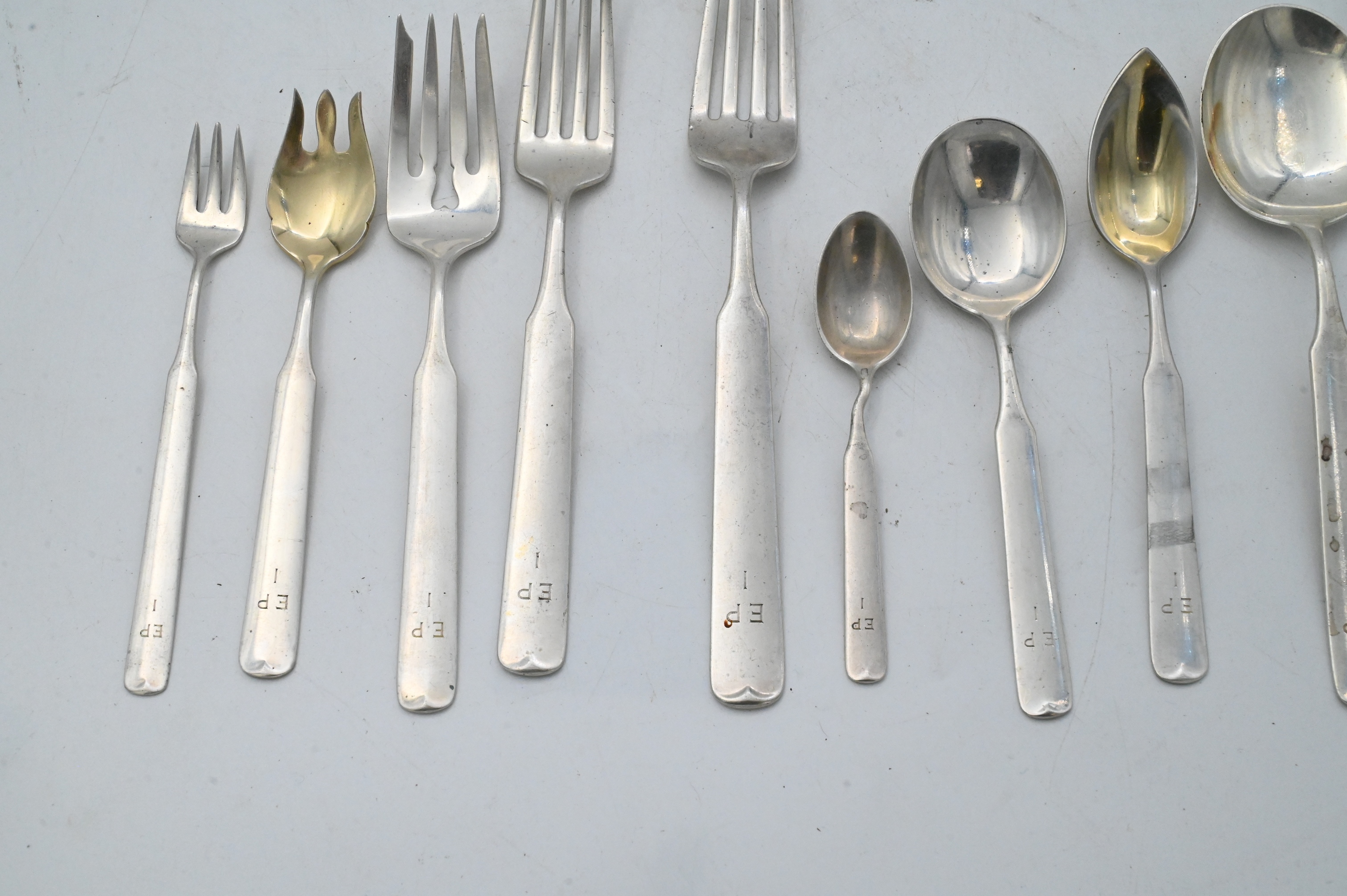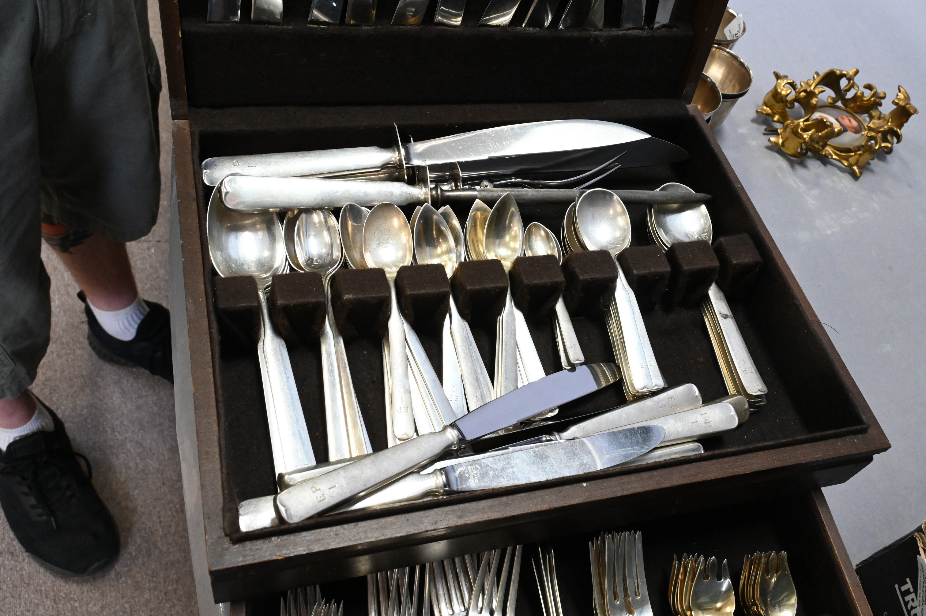in plain fiddle pattern to include six dinner forks, four luncheon forks, nine salad forks, none cocktail forks, sixteen ice cream forks/spoons, four place spoons, five soup spoons, one teaspoon, thirteen bouillon spoons, fifteen ice tea spoons, six demi spoons, seventeen sherbert spoons, seven dinner knives, fourteen luncheon knives, five butter knives, eleven solid flag fish knives, two ladles, four piece carving set, plus twenty five weighted handles
