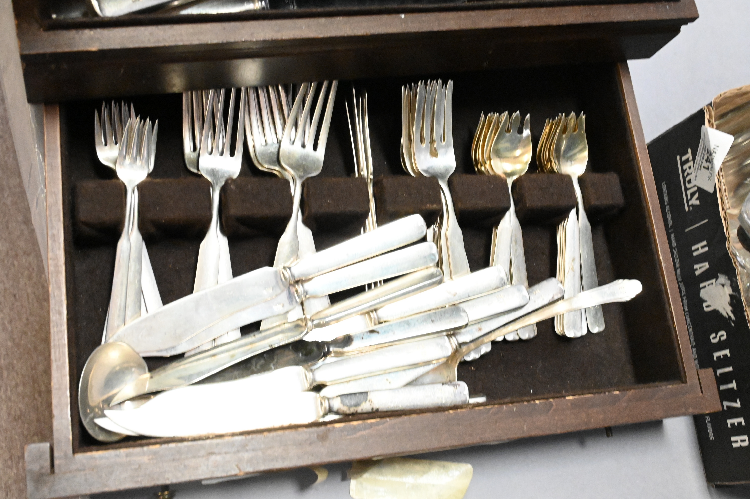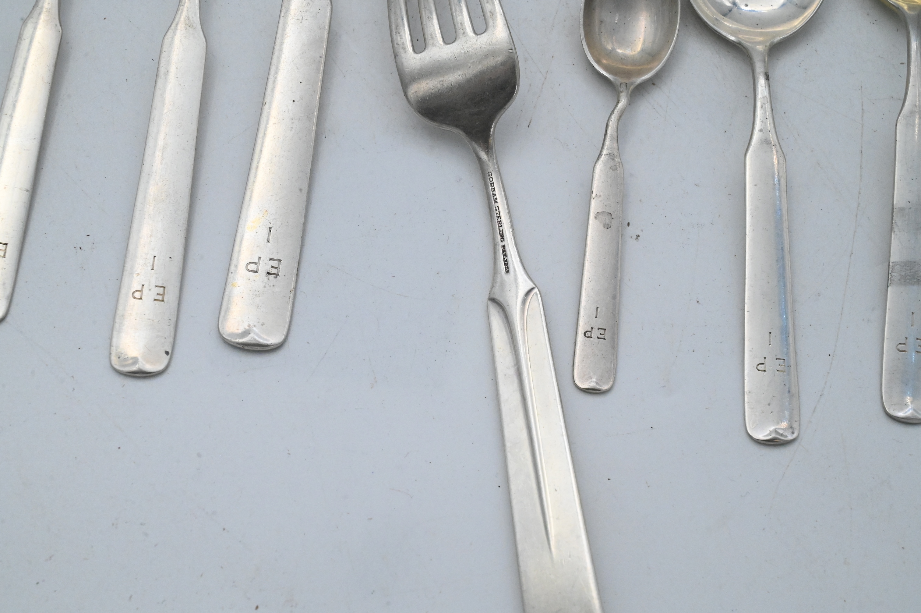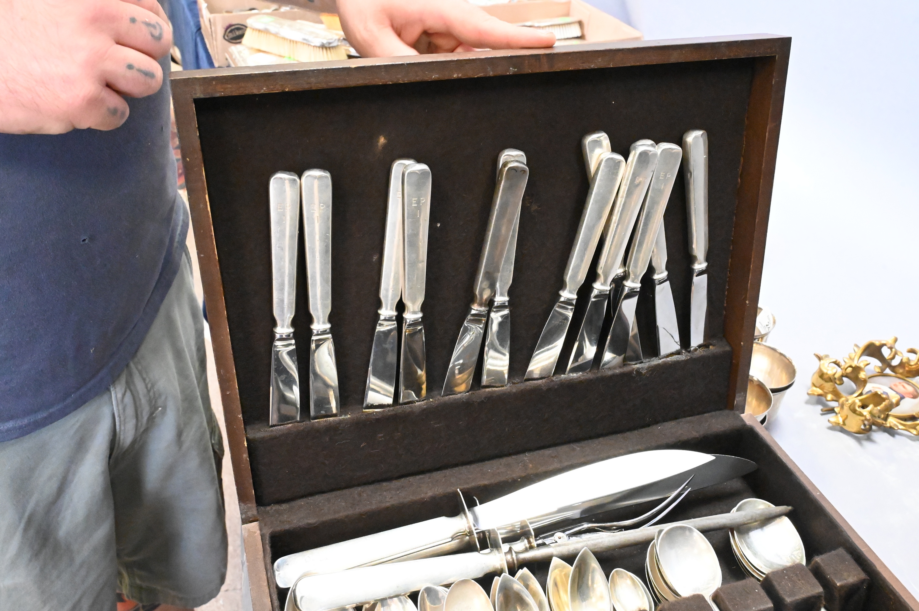 in plain fiddle pattern to include six dinner forks, four luncheon forks, nine salad forks, none cocktail forks, sixteen ice cream forks/spoons, four place spoons, five soup spoons, one teaspoon, thirteen bouillon spoons, fifteen ice tea spoons, six demi spoons, seventeen sherbert spoons, seven dinner knives, fourteen luncheon knives, five butter knives, eleven solid flag fish knives, two ladles, four piece carving set, plus twenty five weighted handles