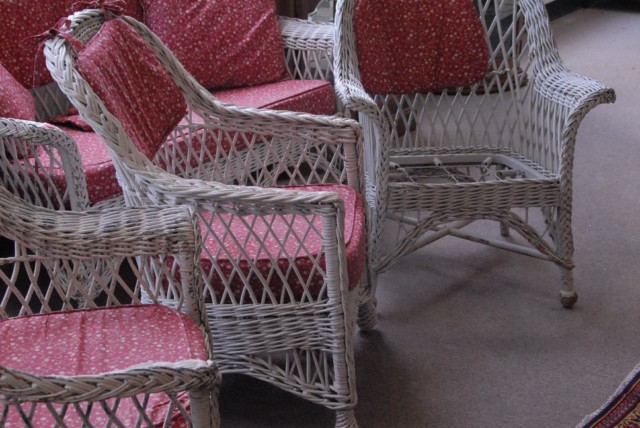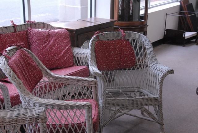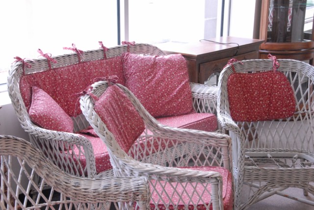 4 pc wicker group including loveseat, 2 armchairs, and rocker.