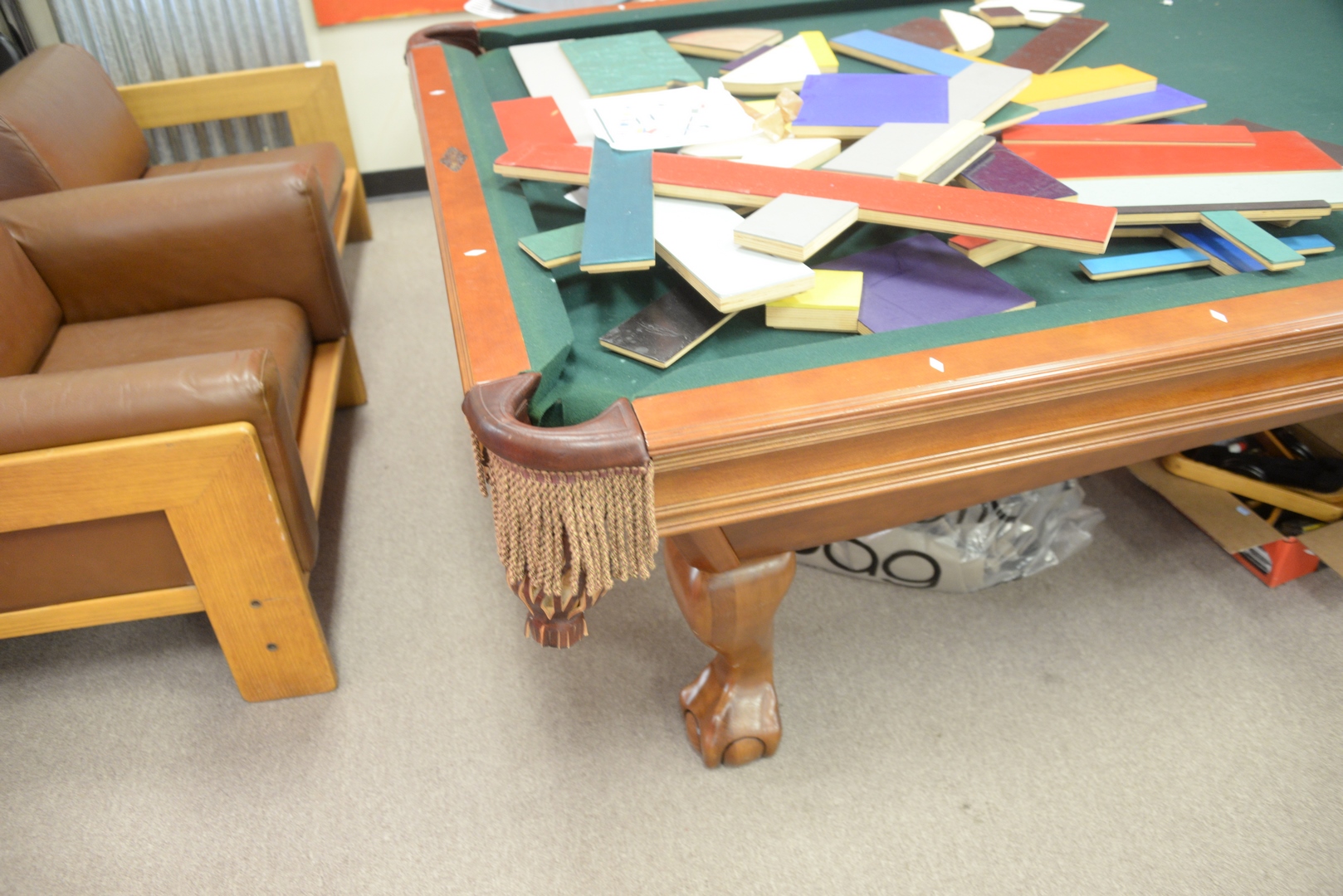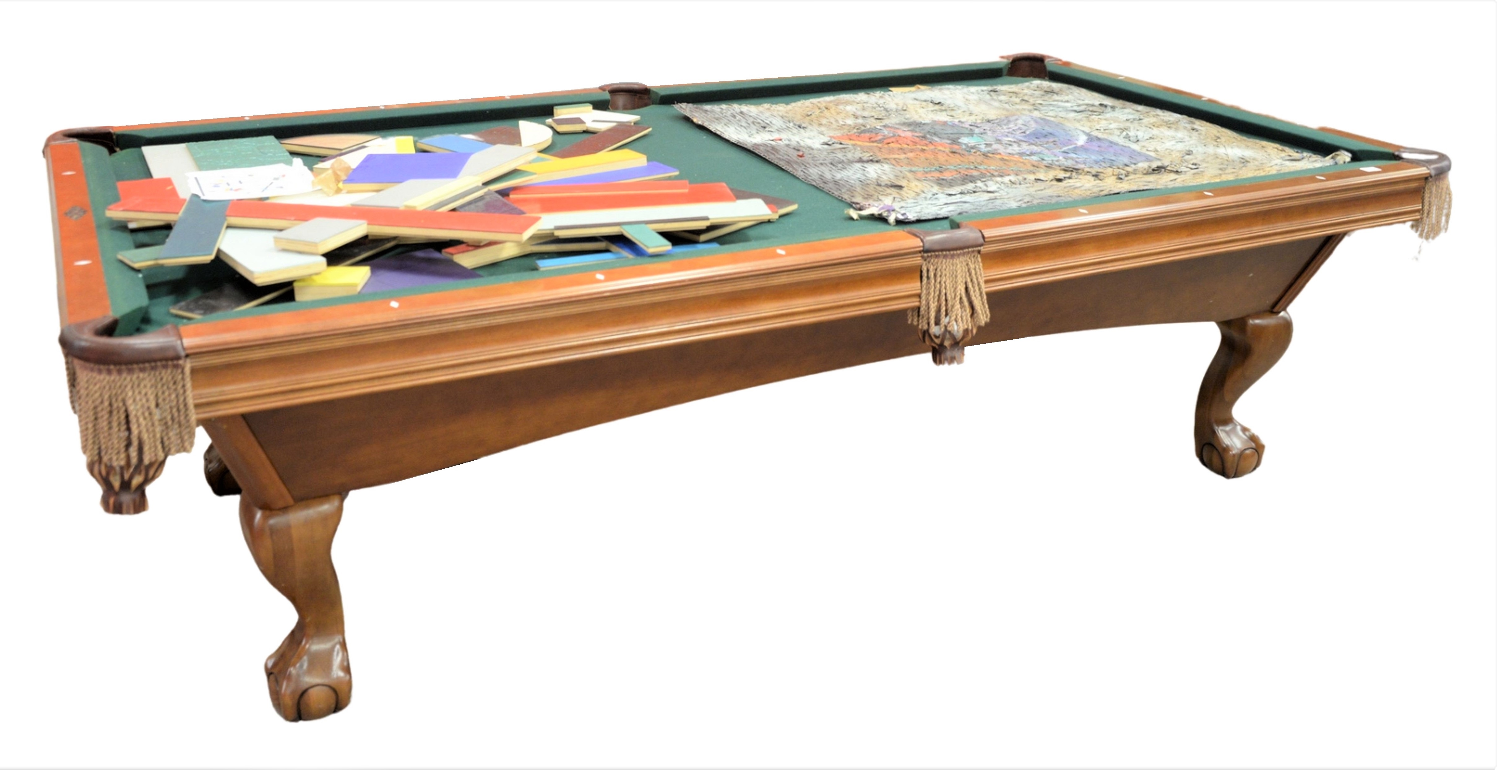 Lot 240: Brunswick Slate Top Pool Table having leather pockets and ball and claw feet, along with cues and balls, overall 5′ x 9′ 2″.