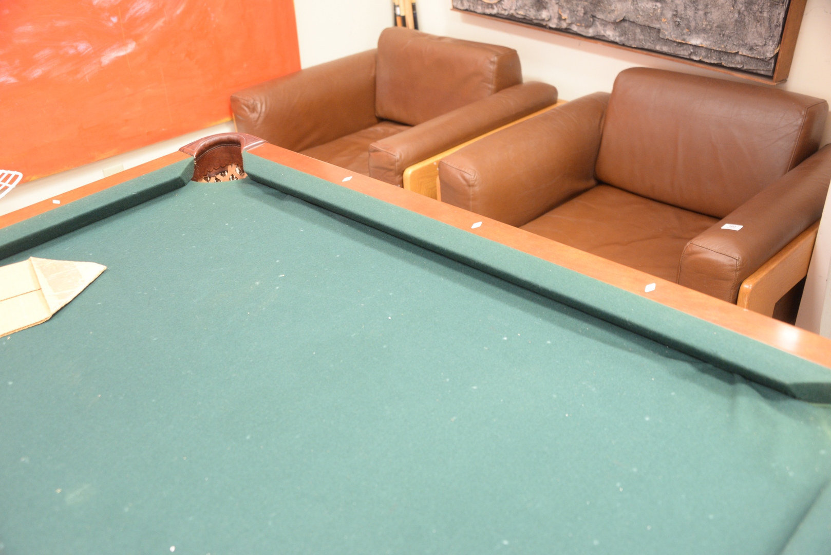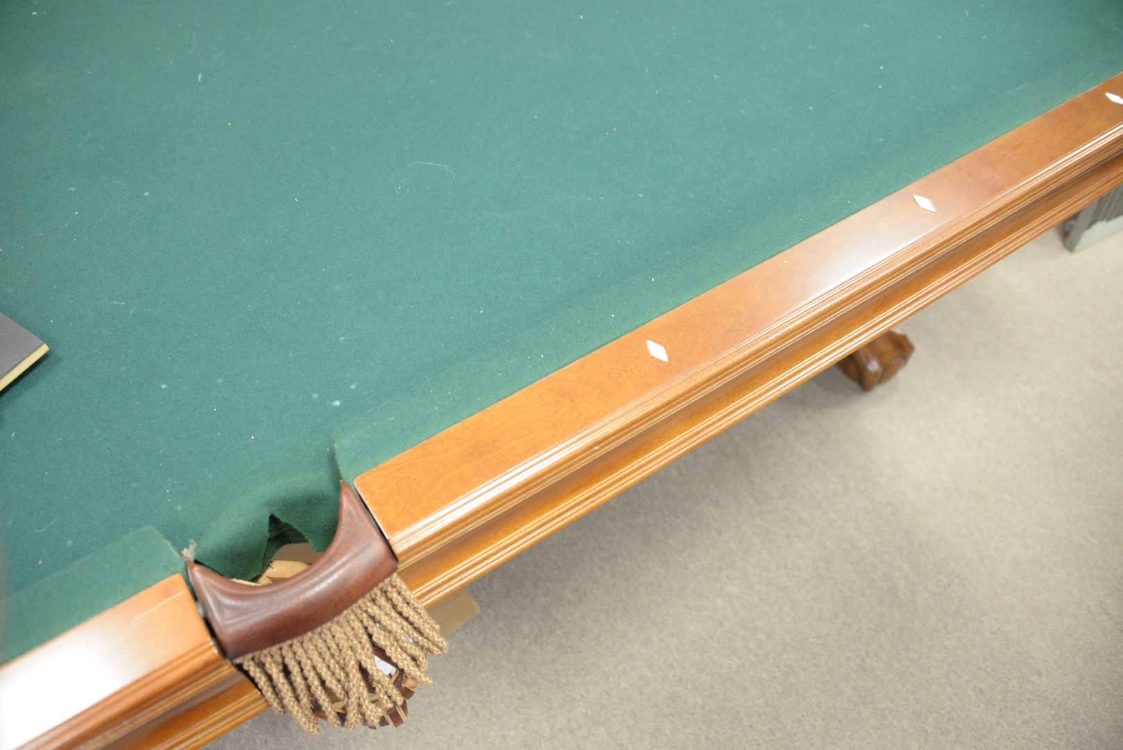 Brunswick Slate Top Pool Table having leather pockets and ball and claw feet, along with cues and balls, overall 5′ x 9′ 2″.
