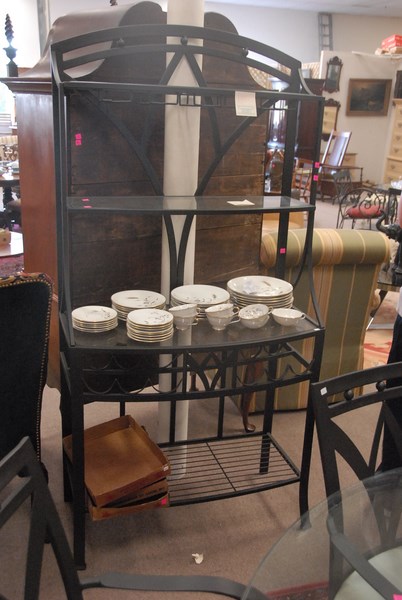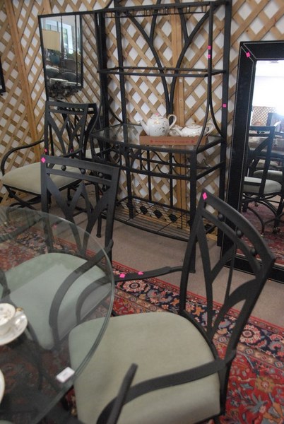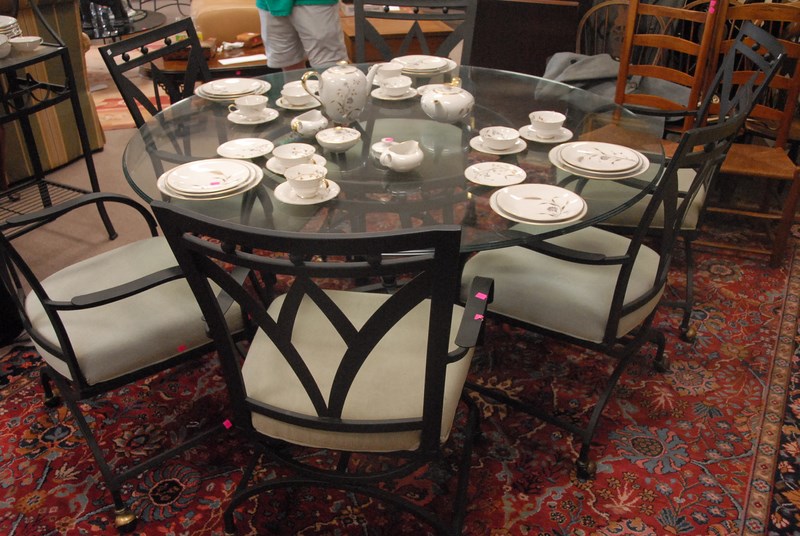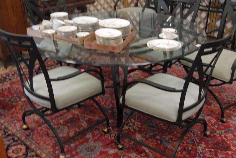 Contemporary glass top table, tagre, and six armchairs, dia. 60in.