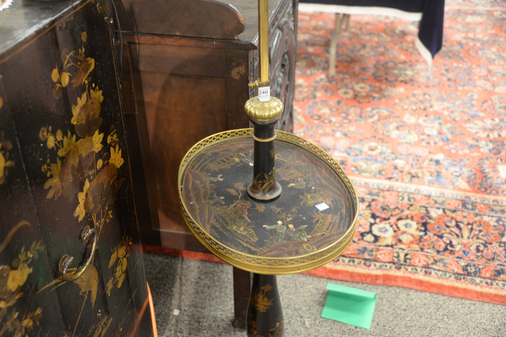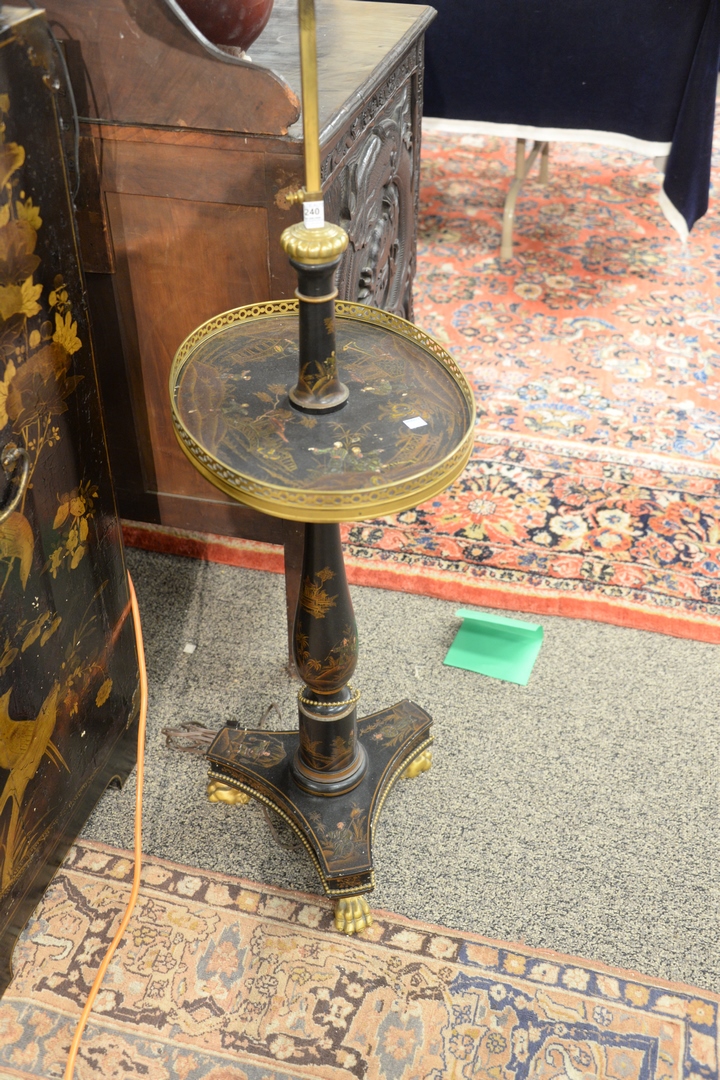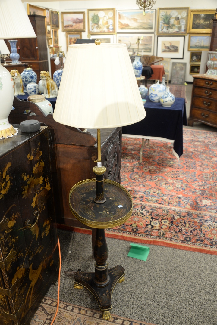Lot 240: Dreyfous Registered Bridgelux Chinoiserie Floor Lamp Table having adjustable height with gilt metal mounts on gilt metal paw feet, shaft marked Dreyfous Registered Bridgelux, Paris, London, New York, approximate height 57 1/2 inches.