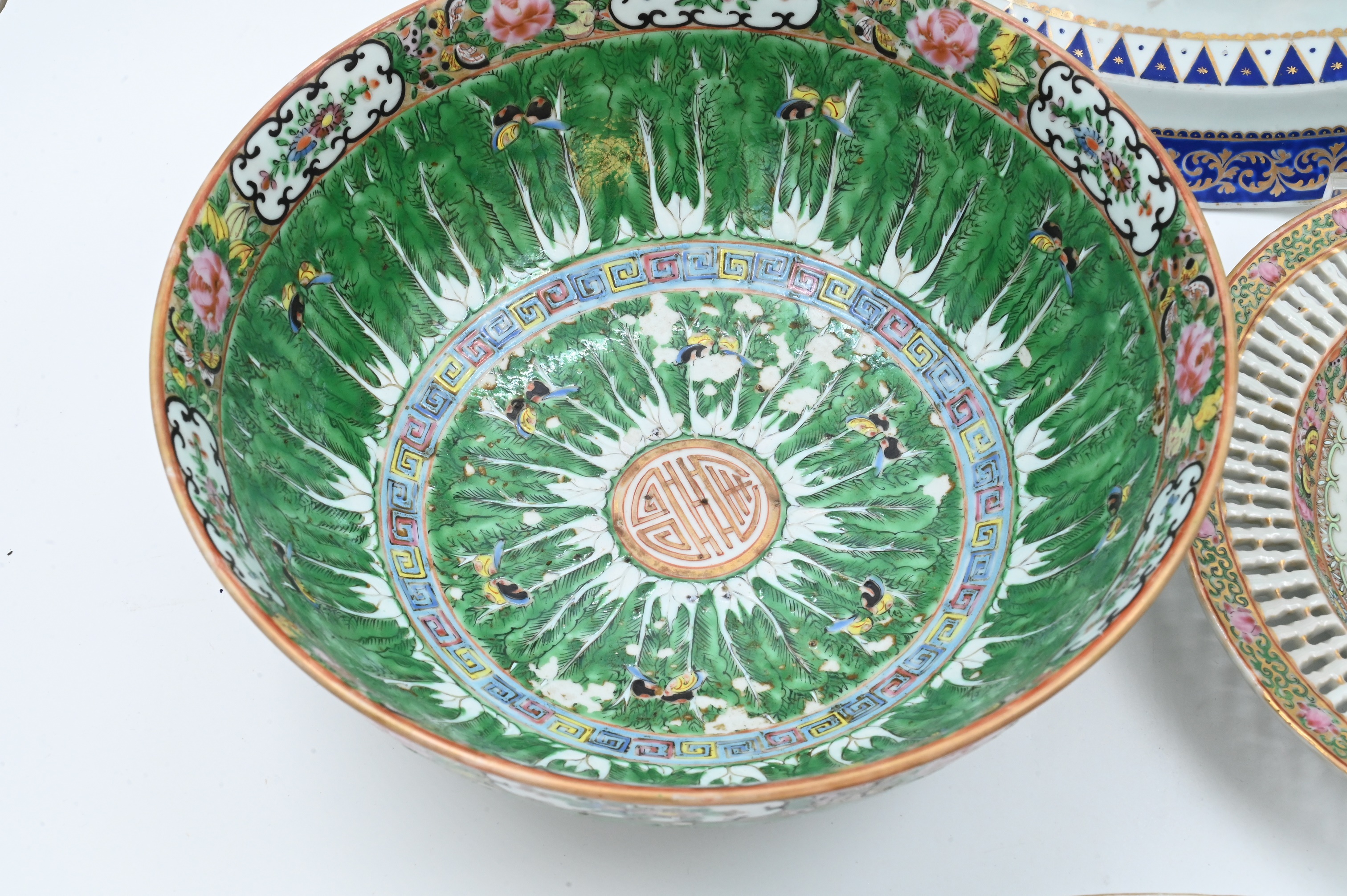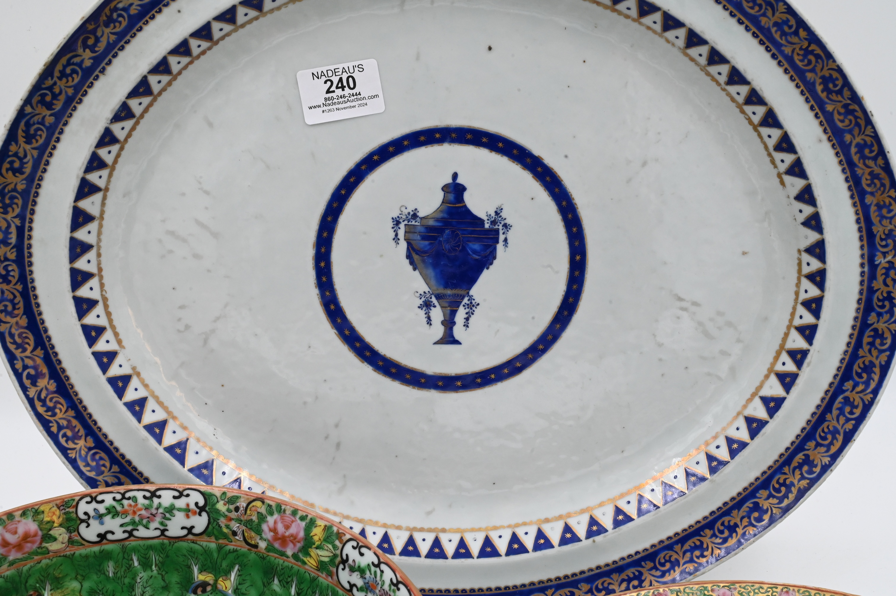 to include bok choy or cabbage Rose Medallion bowl having butterflies among green bok choy, large oval armorial platter centered with an urn and having blue and gilt border, reticulated rectangular Famille Rose plate, smaller Famille Rose oval plate