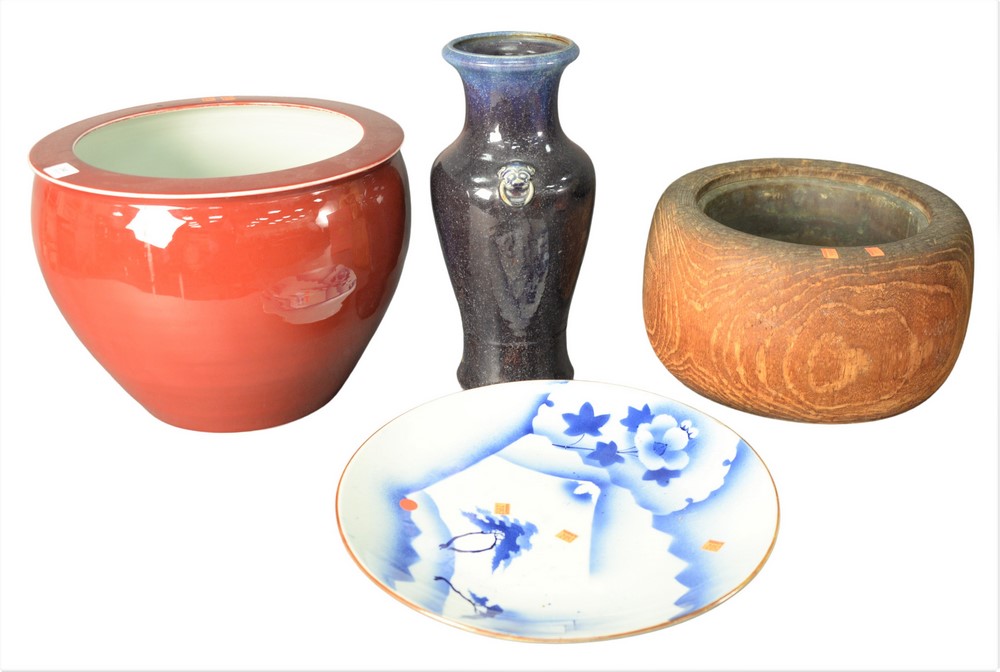 Four Piece Group of Asian items, to include a carved wood Hibachi Bowl; blue and white porcelain charger; red glazed planter; and a sang de boeuf vase with lion head handles, tallest height 17 1/2 inches.