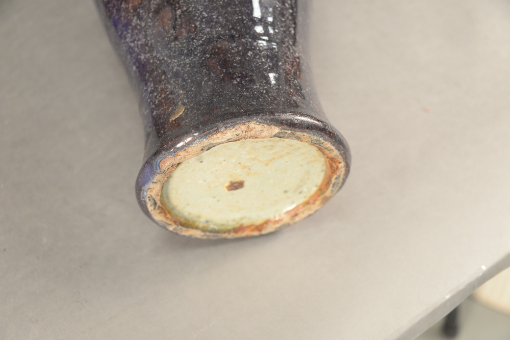 Four Piece Group of Asian items, to include a carved wood Hibachi Bowl; blue and white porcelain charger; red glazed planter; and a sang de boeuf vase with lion head handles, tallest height 17 1/2 inches.