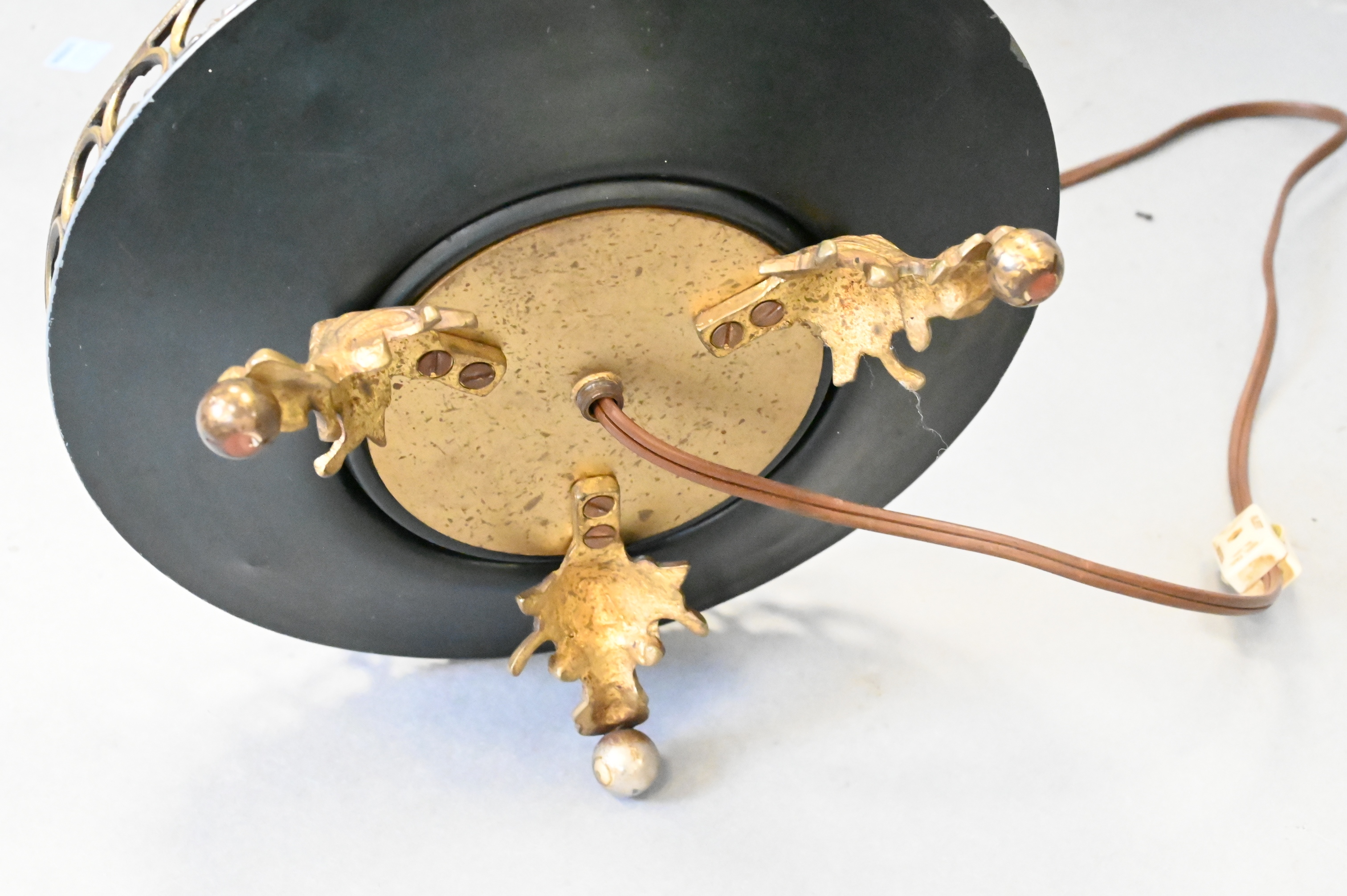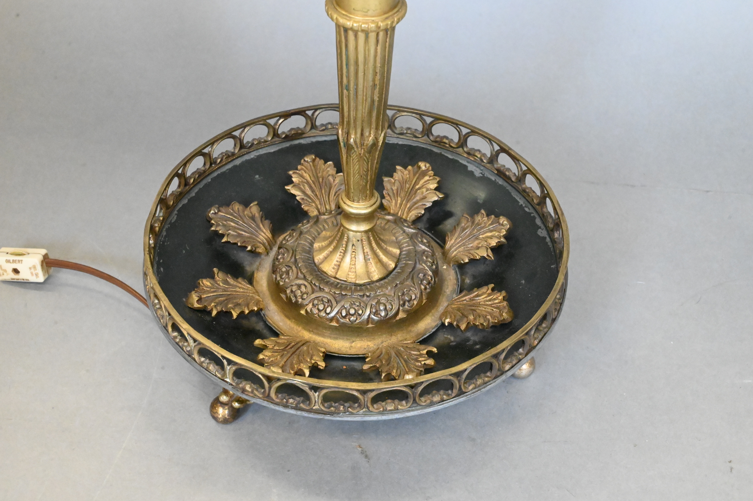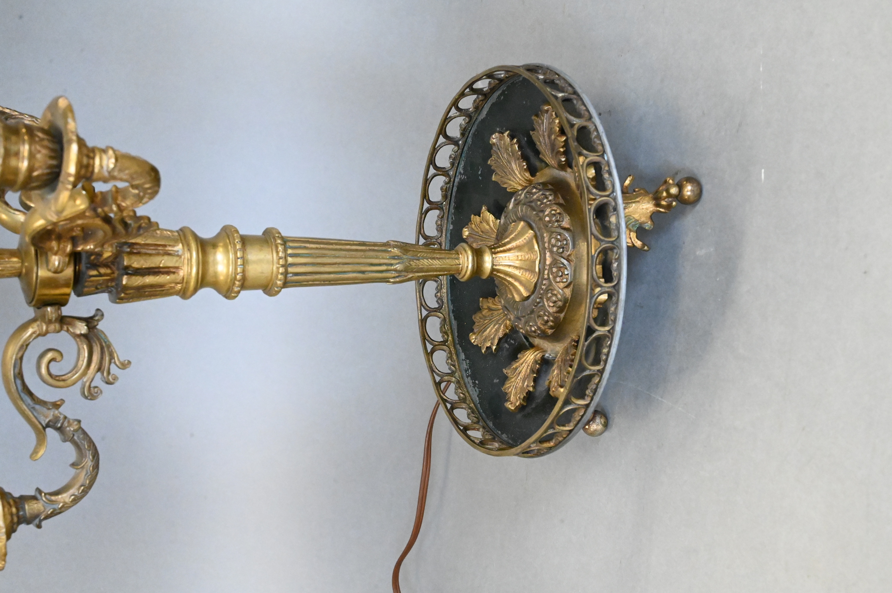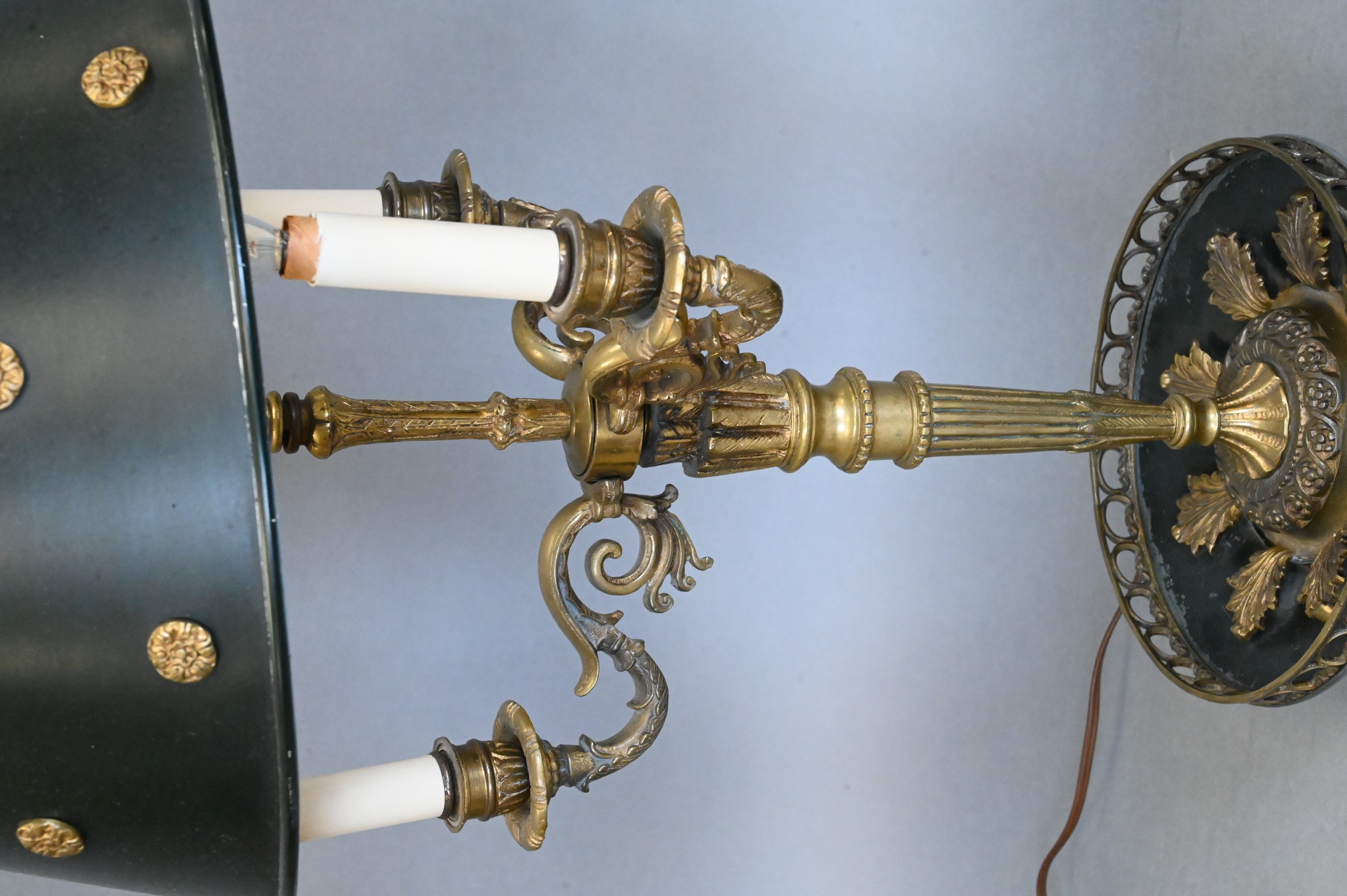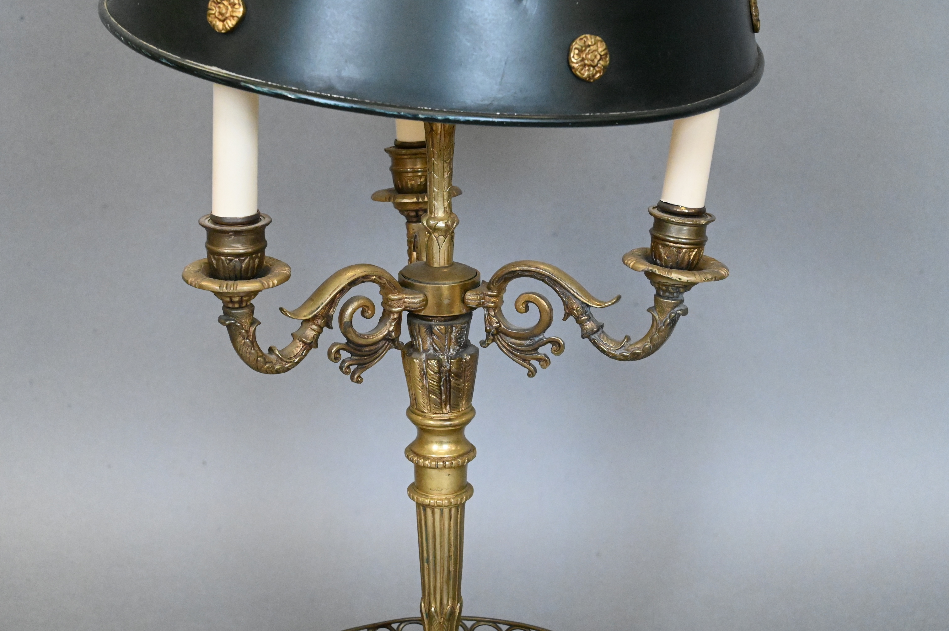 classical gilt-bronze bouillotte lamp with an adjustable green tole shade decorated with applied gilt rosettes, three-light candelabra-form standard with scrolling arms, fluted column, and foliate circular base on paw-from feet, gilt bronze and tole, electrified