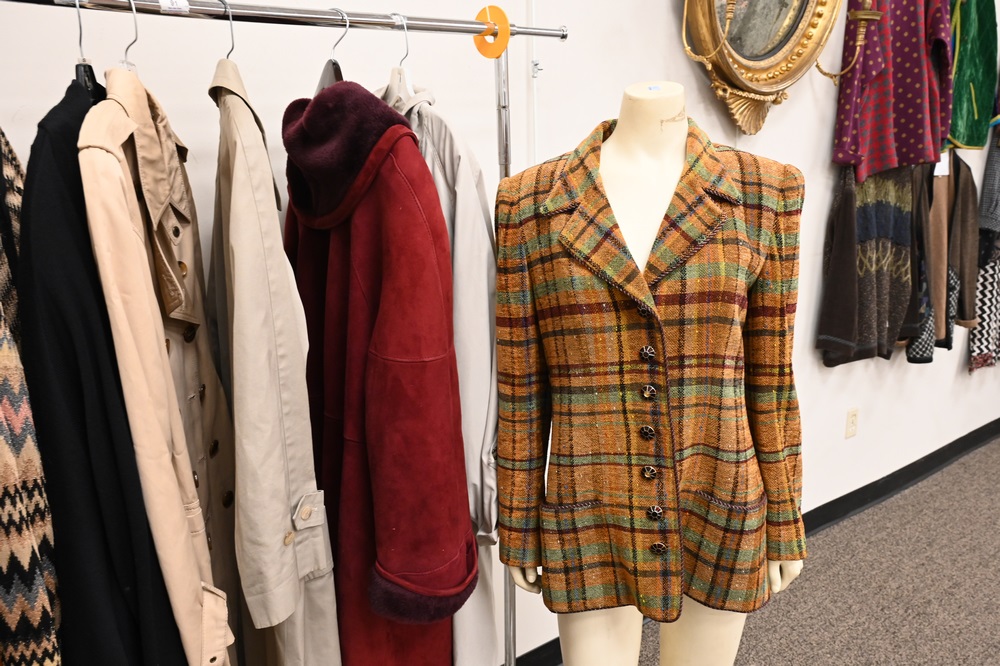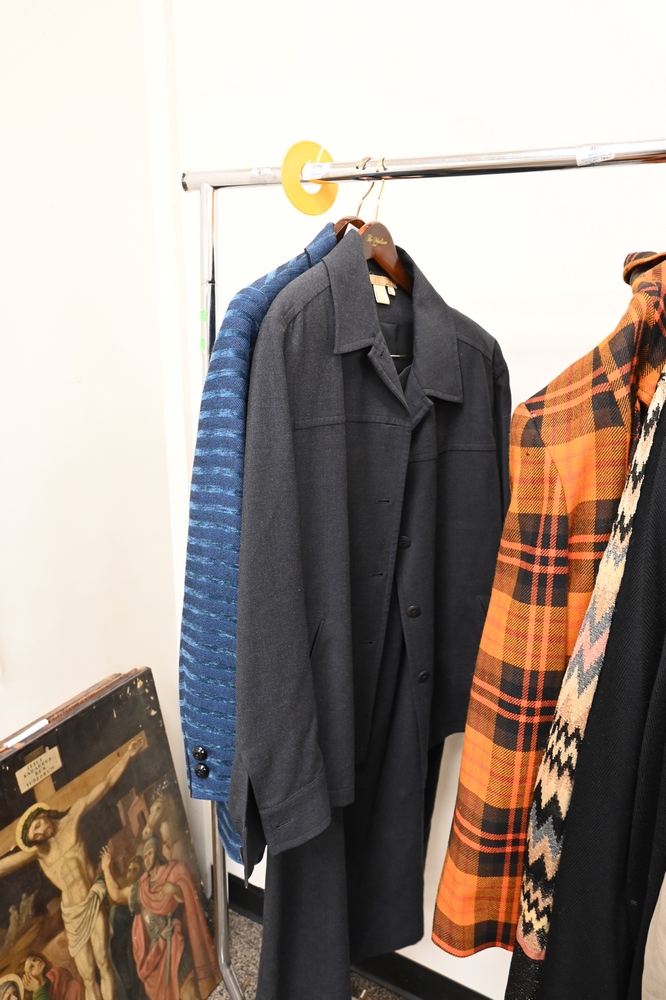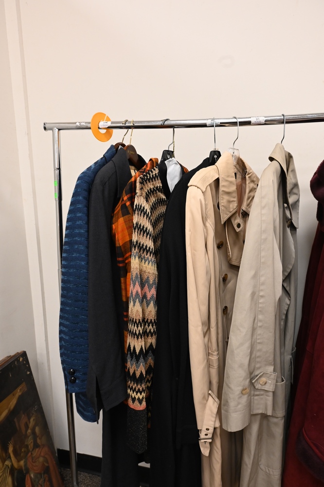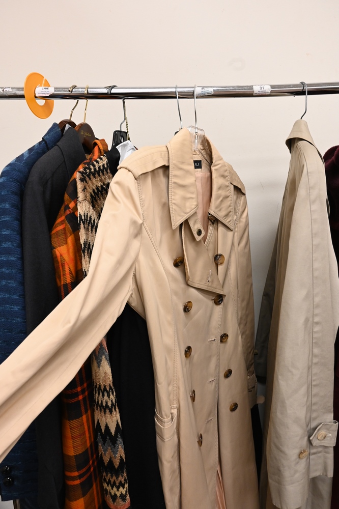 Lot 240: Group of 10 Coats and Jackets, to include Saks Fifth Avenue magenta sheepskin dramatic coat; Ramosport; Jaeger and Searle raincoat; …