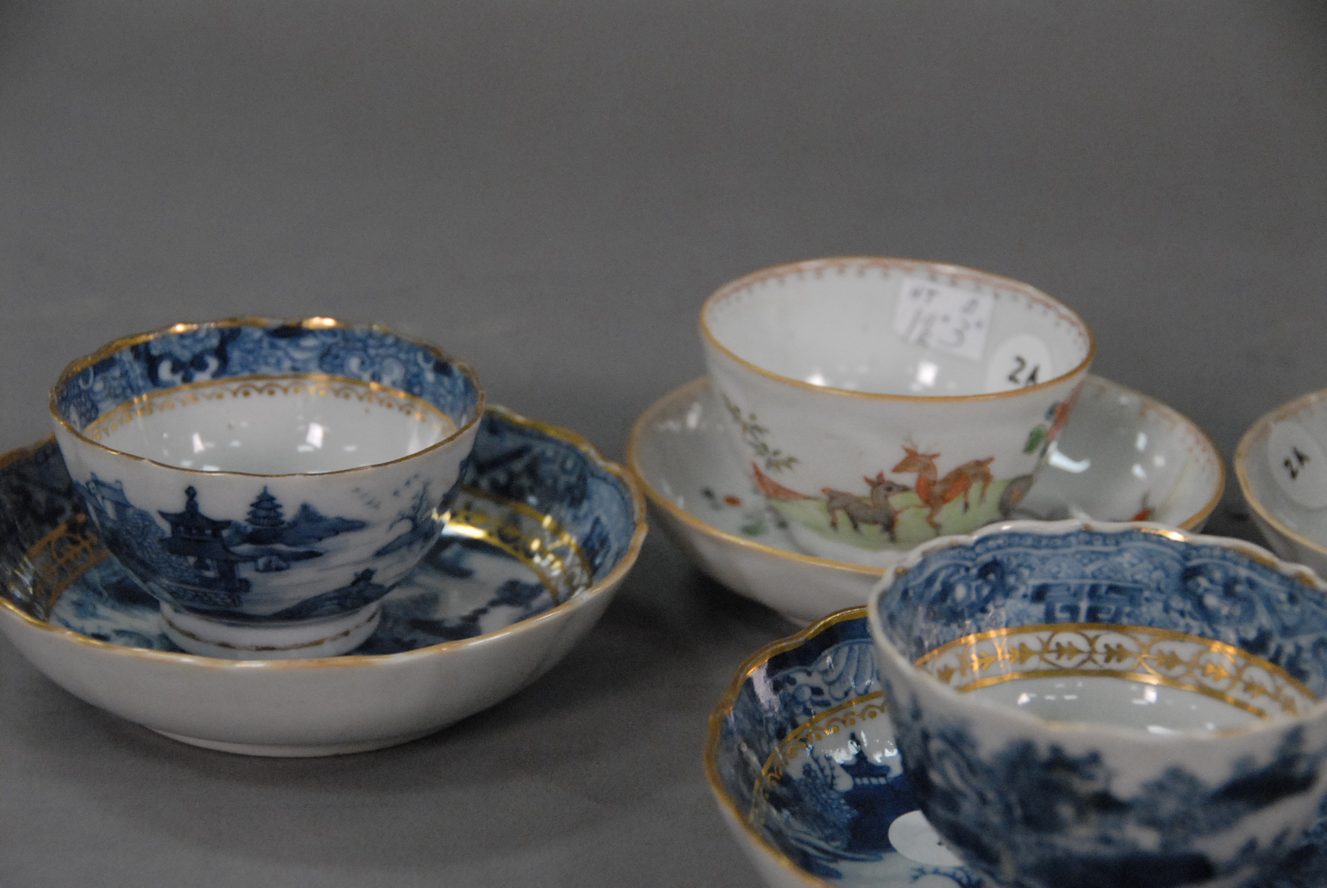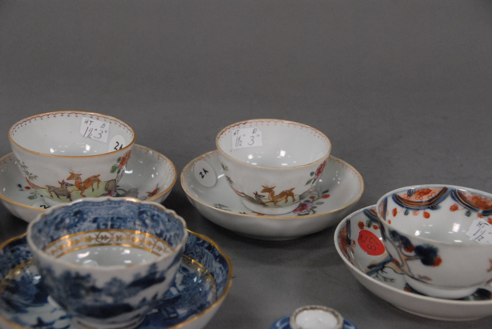 Group of five Oriental cups and saucers to include a pair of blue, white, and gold Chinese export, a pair of Chinese export cups and saucers with hand painted landscape scene with deer, and an Imari cup and saucer with landscape scene with a house.