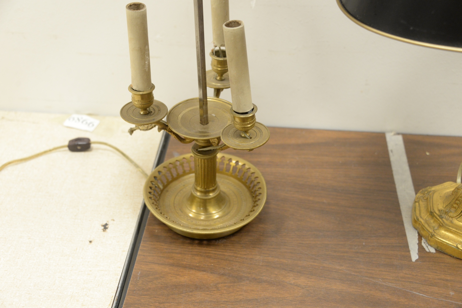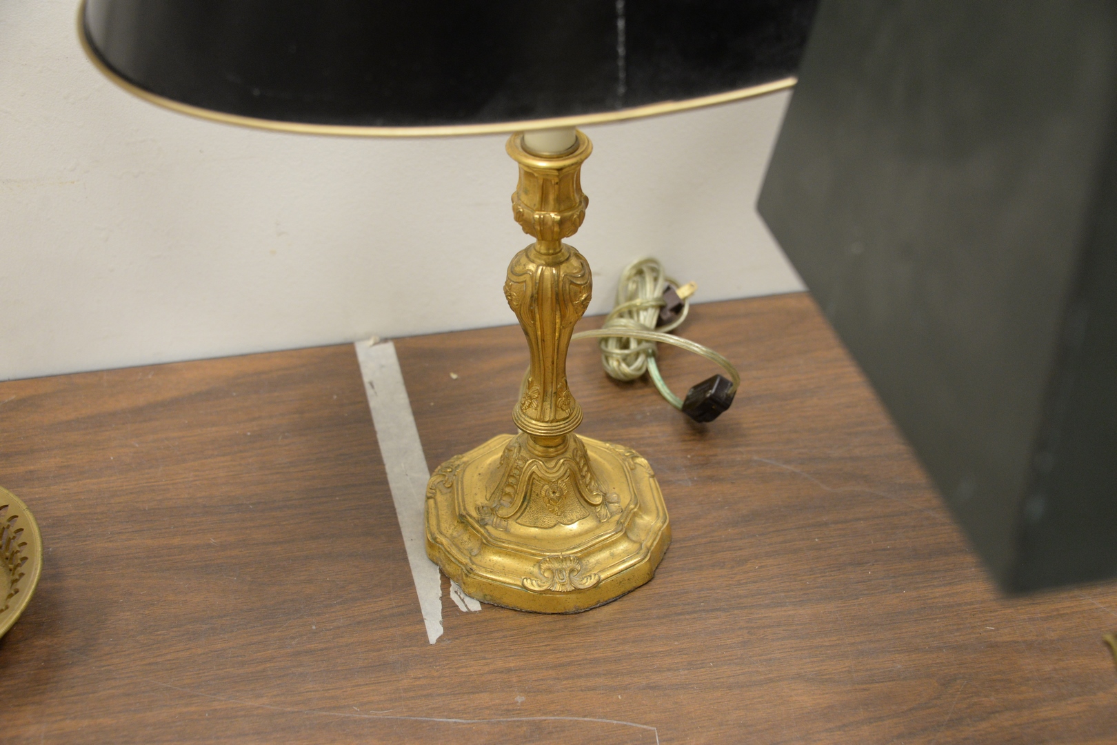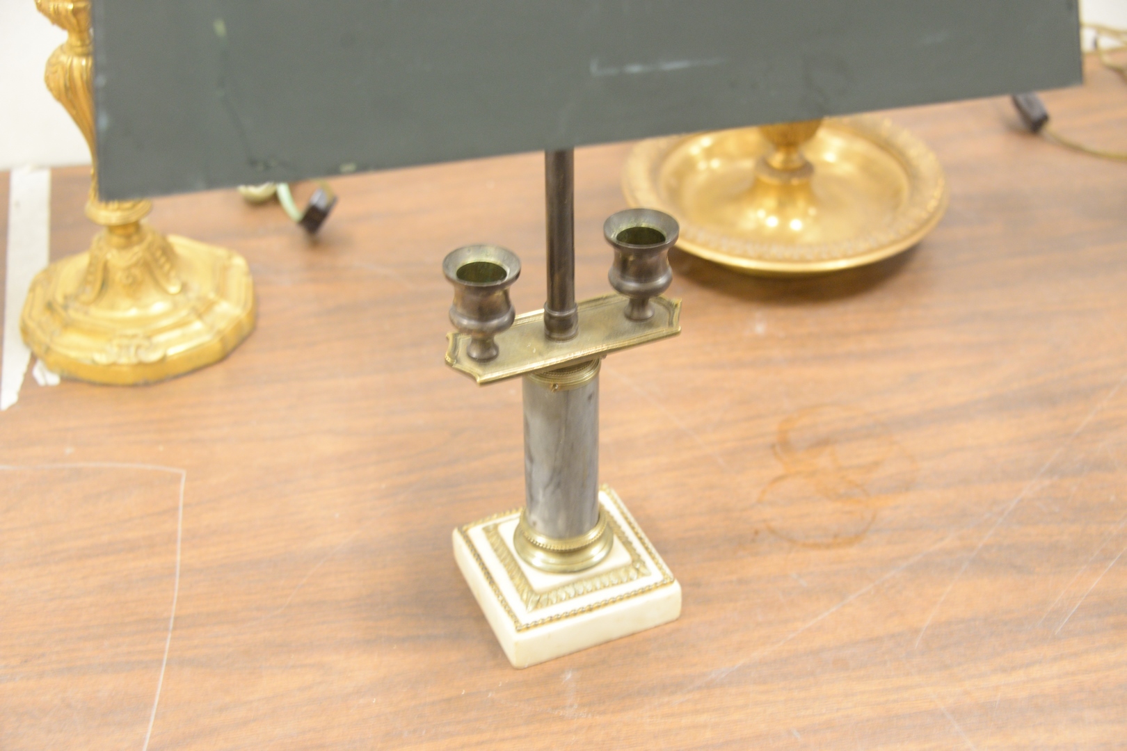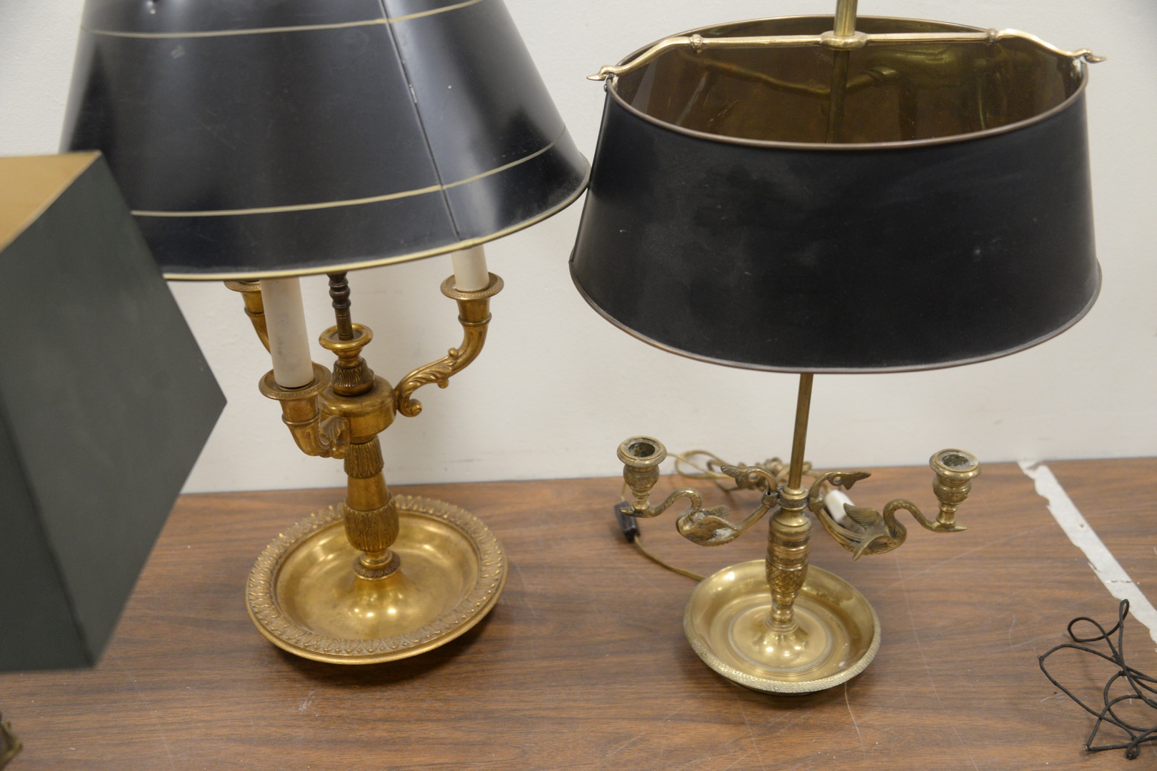 Lot 240: Group of Five Table Lamps, to include four bouillotte lamps, each having tole shades along with one table lamp having a gilt metal base, overall tallest height 26 1/2 inches.