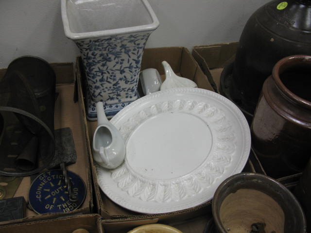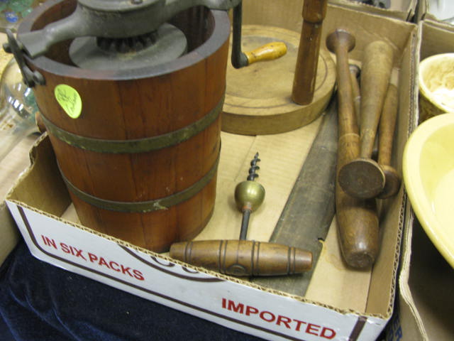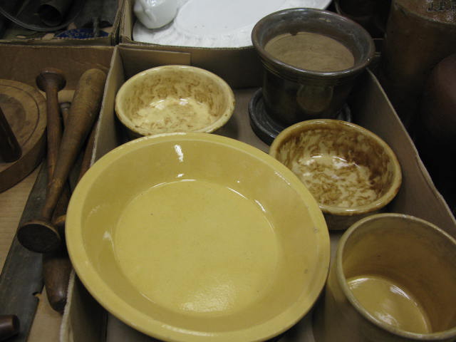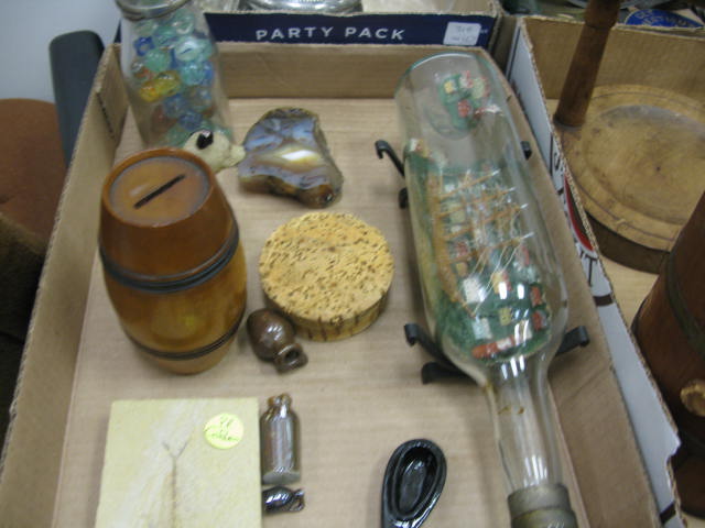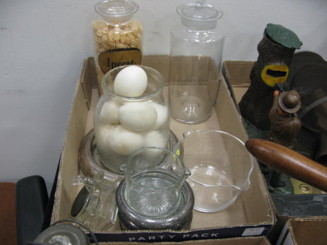Group of six boxes to include a reproduction of Teddy and the Bear bank, Victor the Victrola Dog, woodenware items, tin items, glass, jars, silver rimmed coasters, yellowware, dishes, bowls, etc