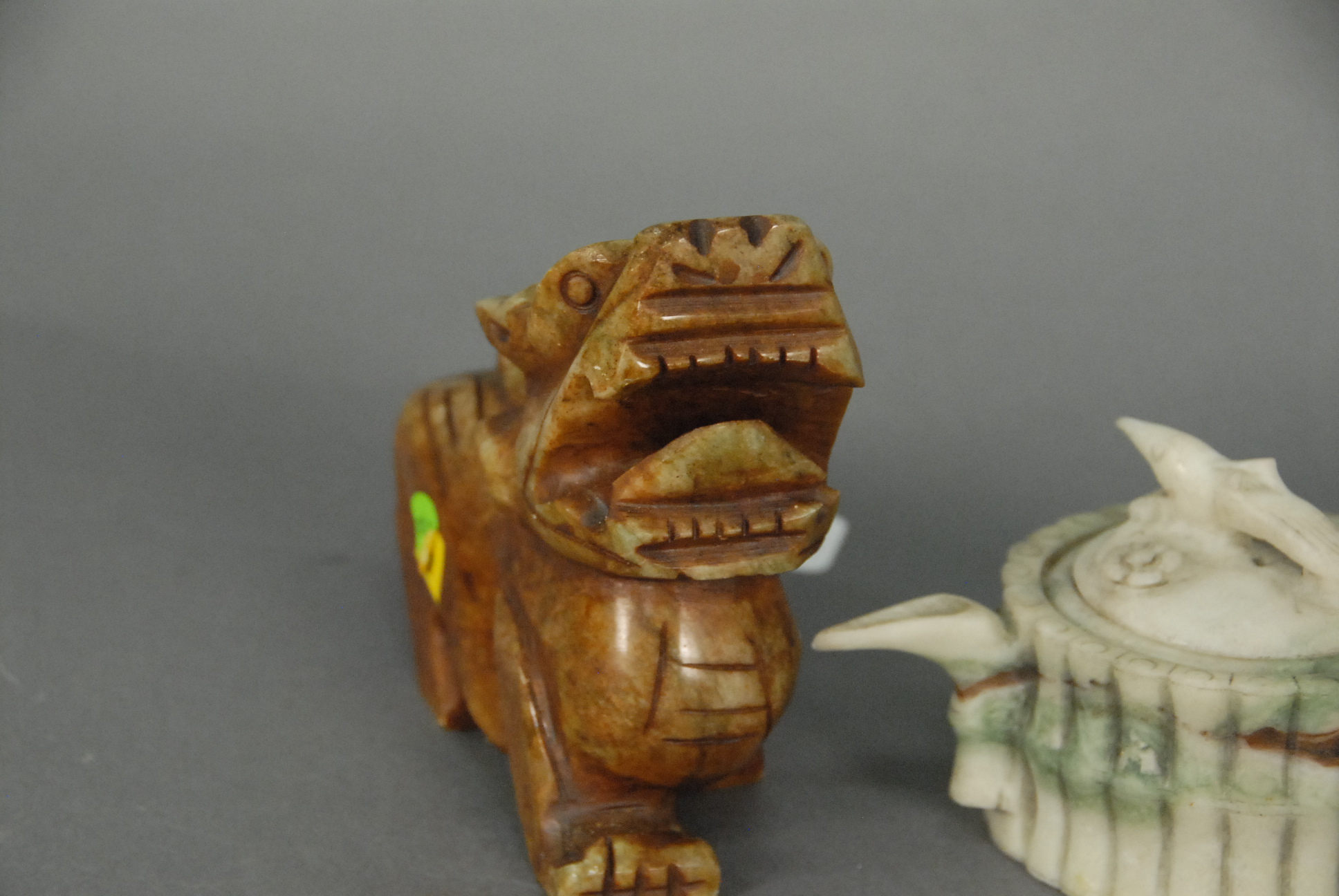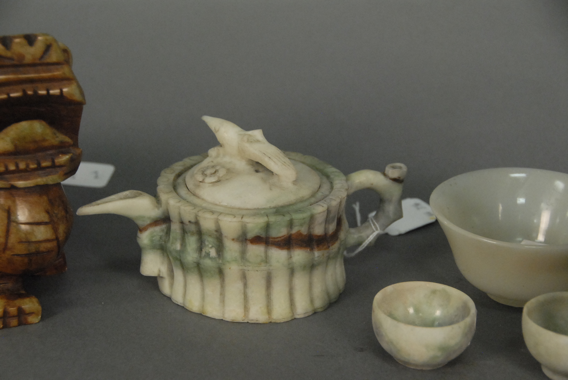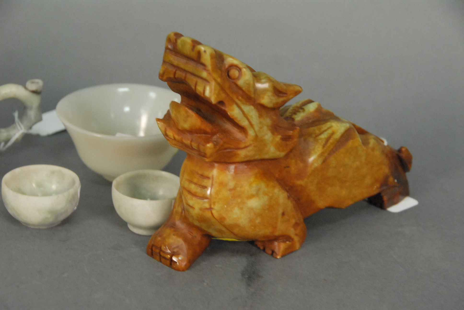 Group of six items jade teapot ht. 3 1/4in. with two small cups, jade cup dia. 4in., and pair of soapstone foo dogs, lg. 8in.
