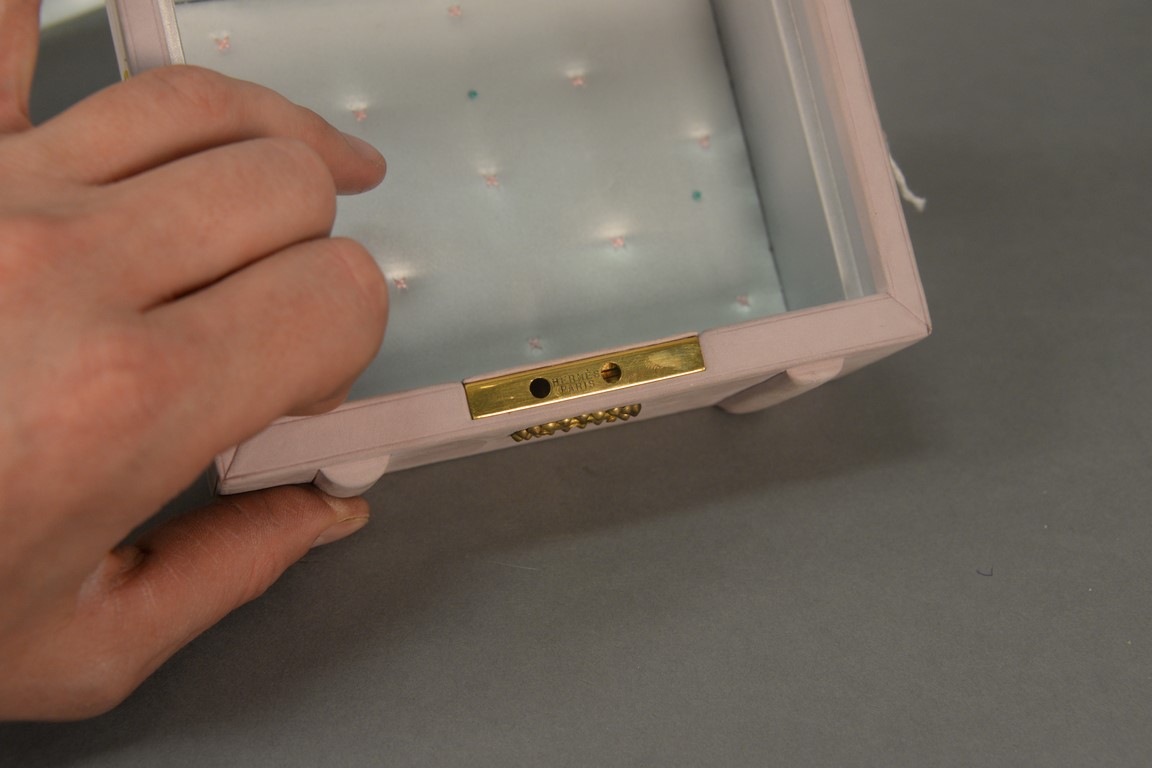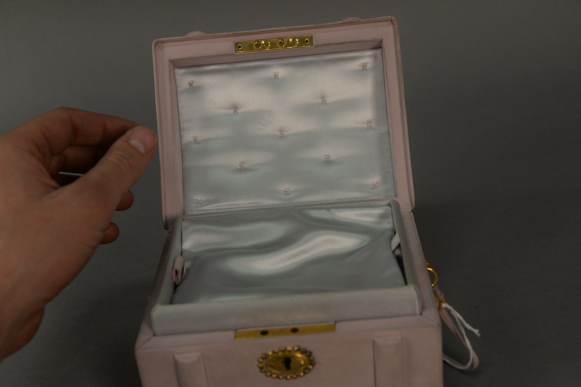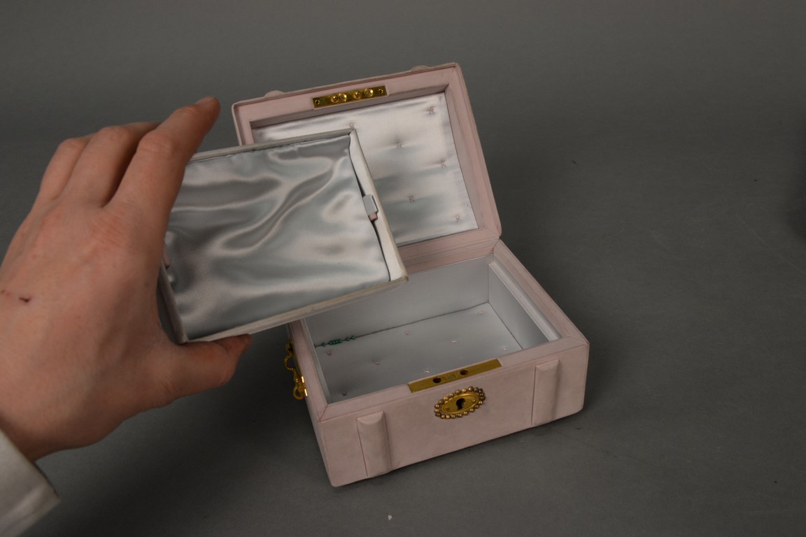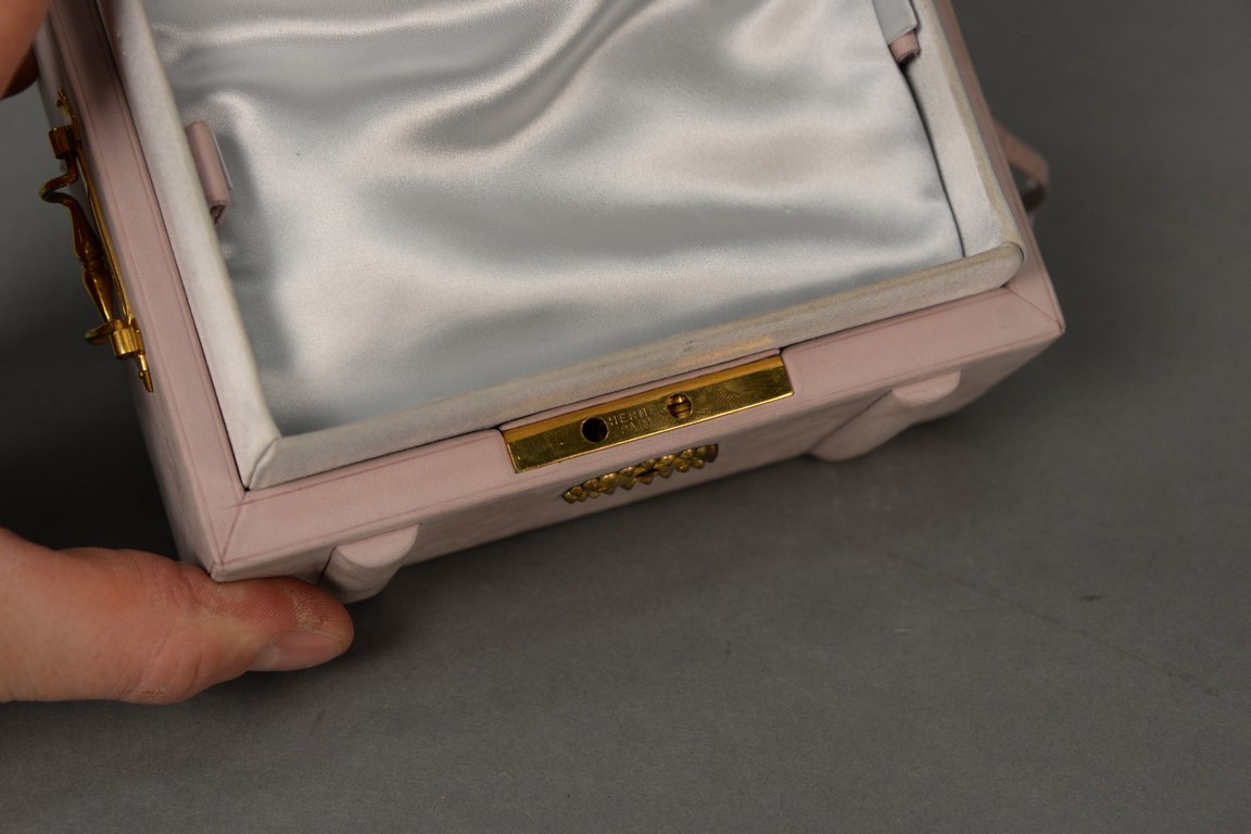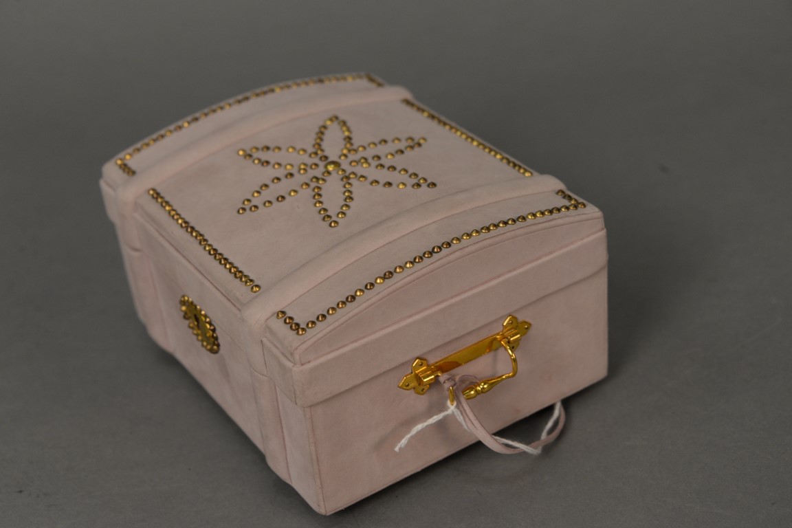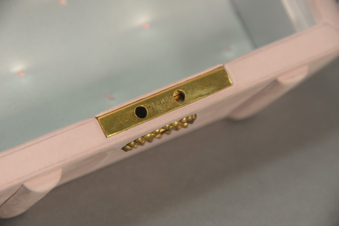 Lot 240: Hermes Paris jewelry box having brass tac dome top wrapped in light purple suede, interior having silk tray over tufted interior, cl…