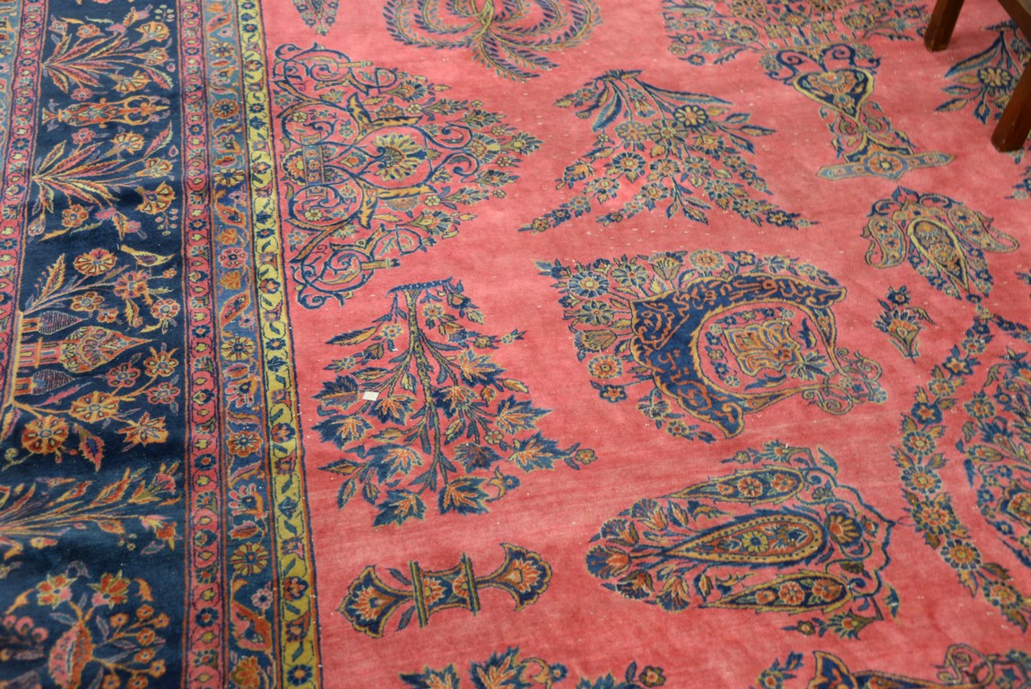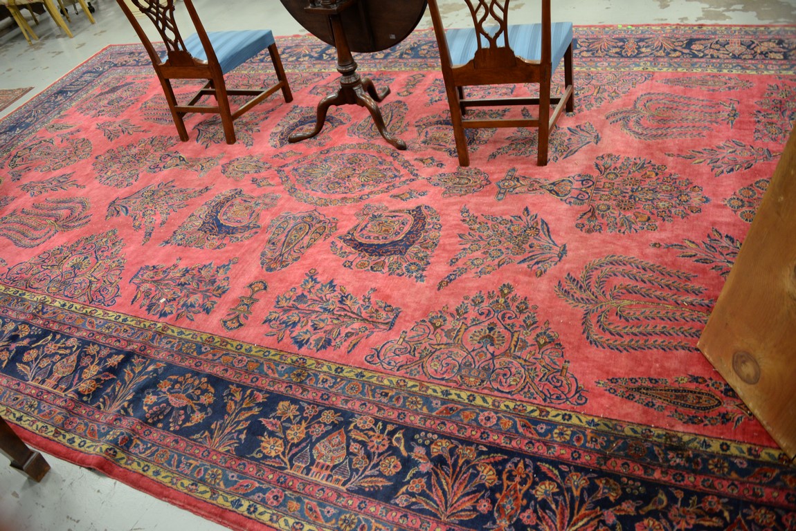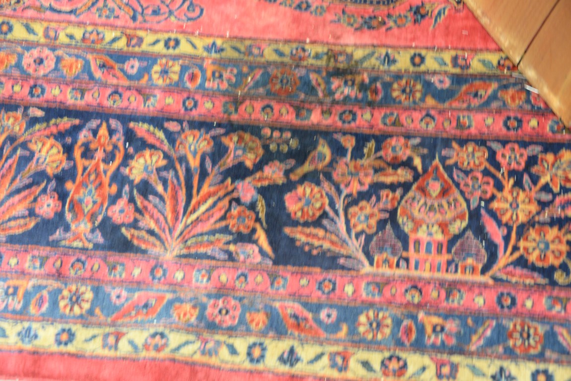 Lot 240: Kashan Oriental carpet with temples, vases, trees, flowers, and birds, signed some wear. 10’4 x 18’10
