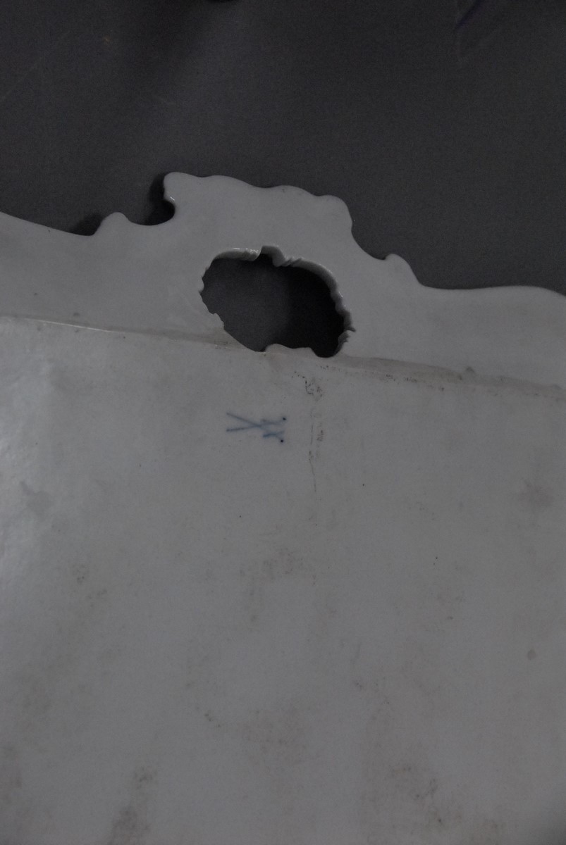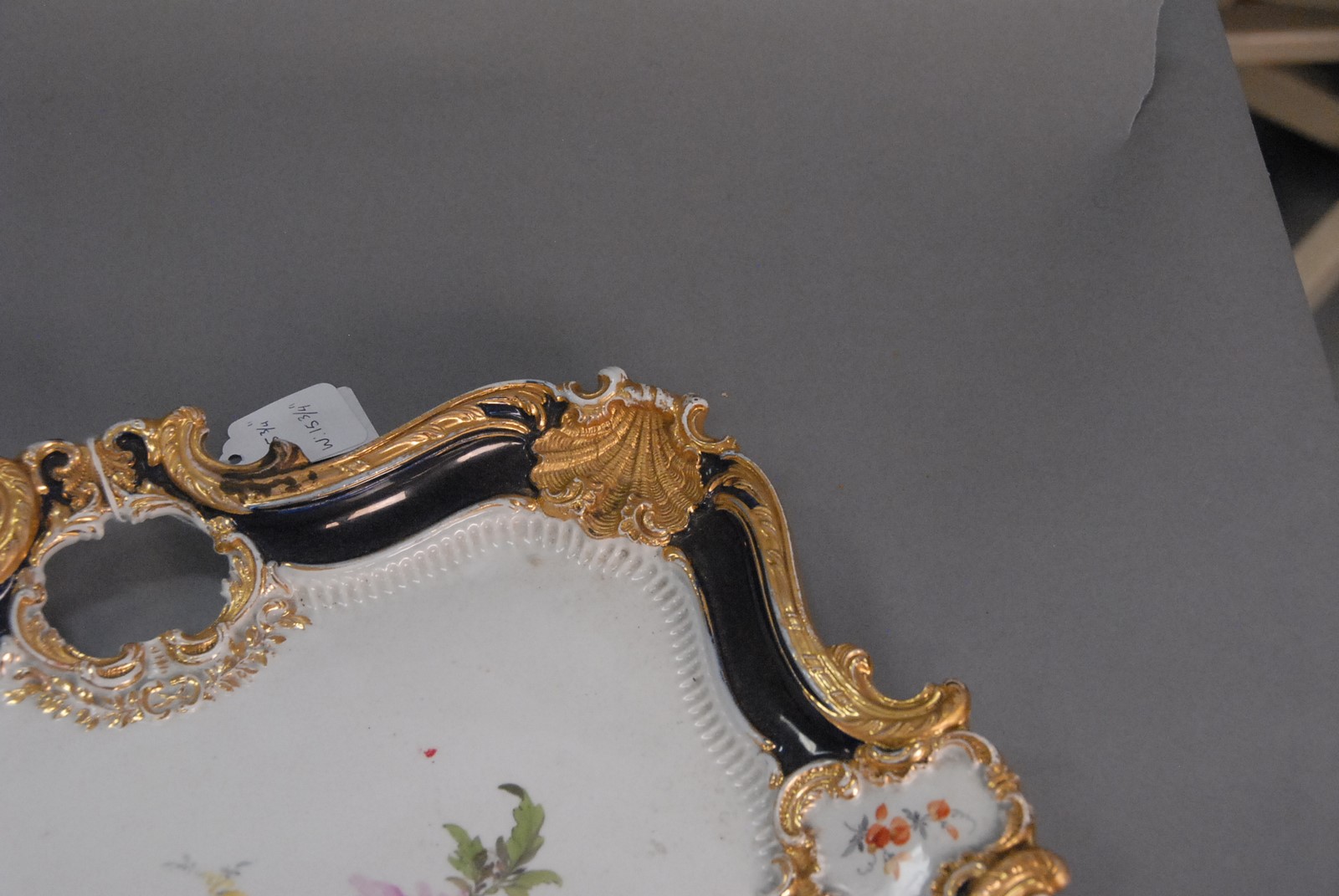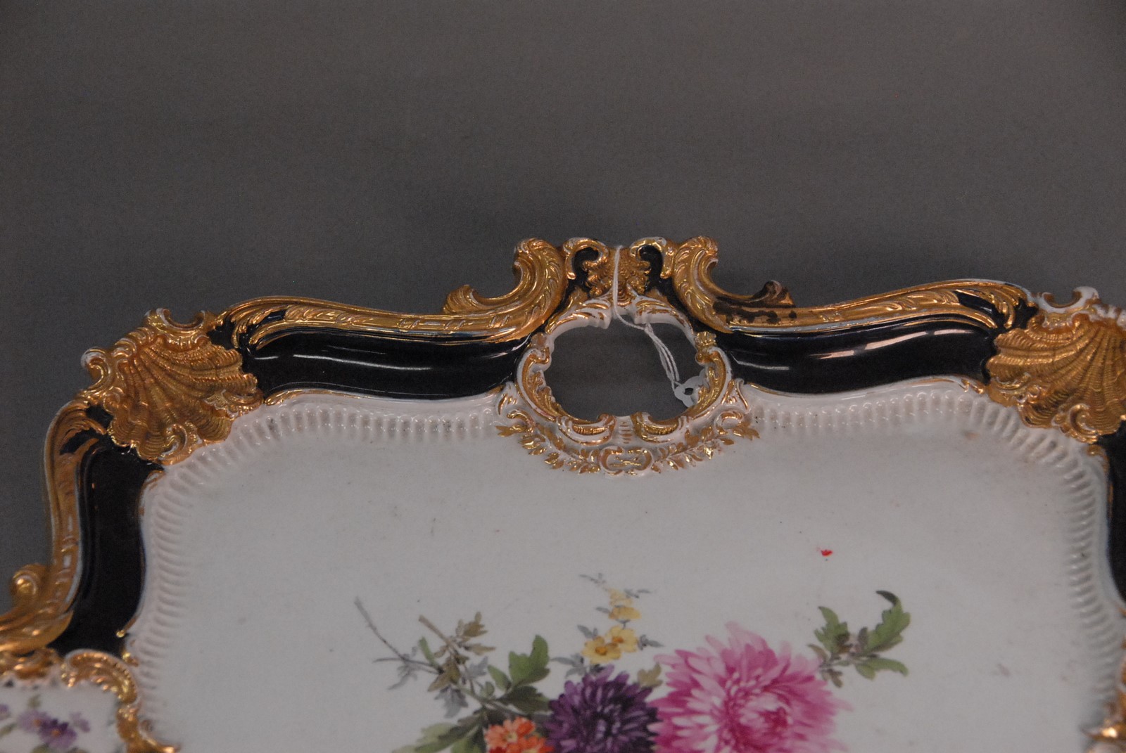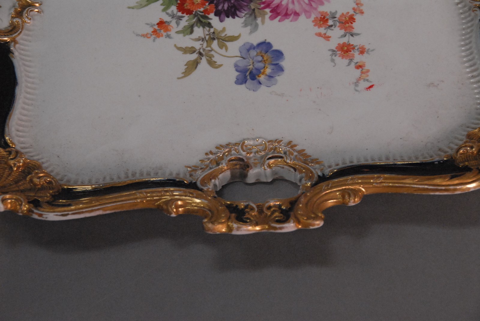 Meissen square platter with gilt decoration and open handles. 15 3/4 x 15 3/4