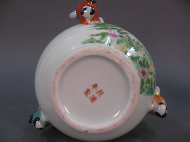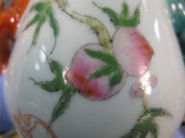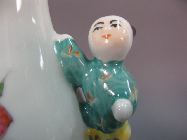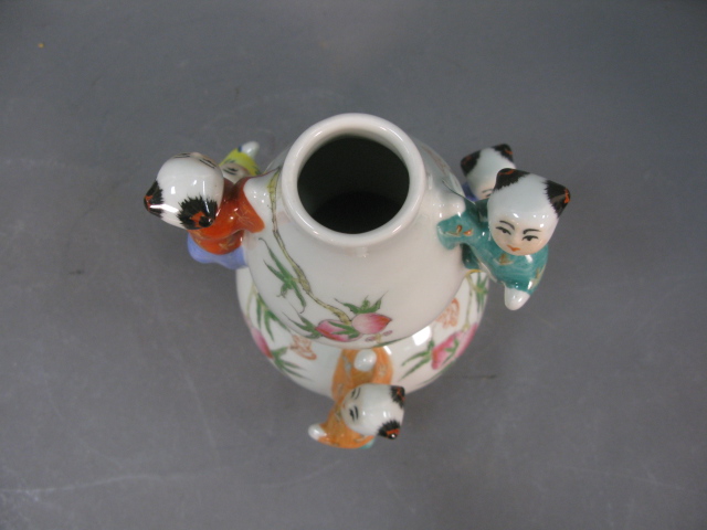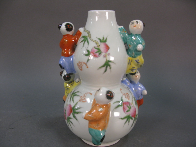 Oriental porcelain peach double gourd vase having five molded children on exterior.