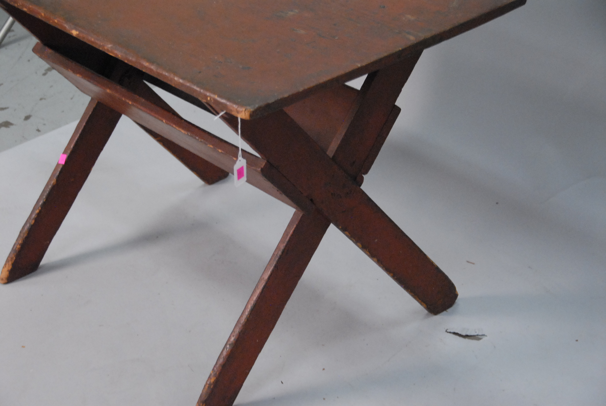 Lot 240: Primitive sawbuck table with single board top, New England, early 18th century. ht. 27in., top 25 x 37