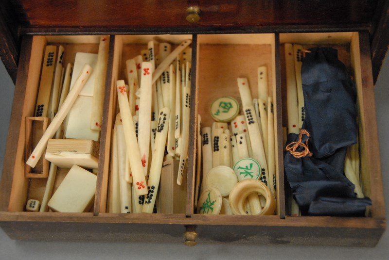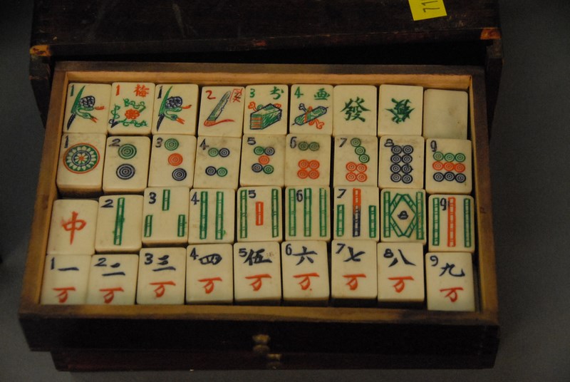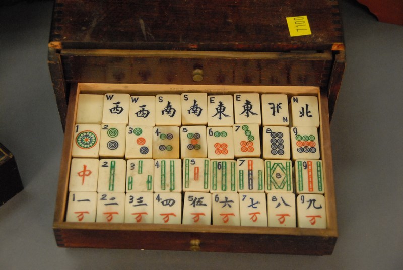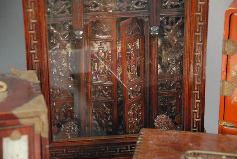 Seven Oriental boxes including Mahjong set in fitted drawers, lacquered cabinets, carved wood cabinets.