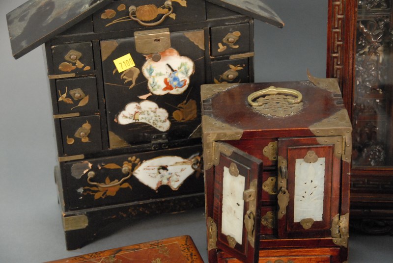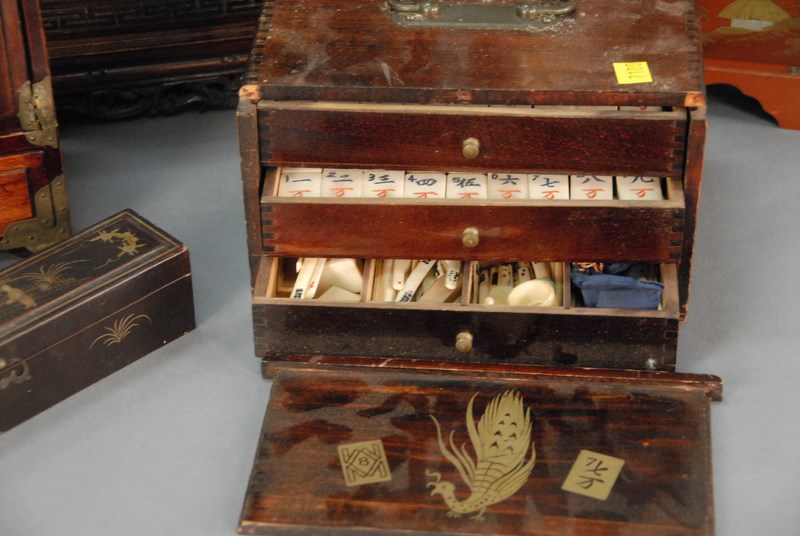 Lot 240: Seven Oriental boxes including Mahjong set in fitted drawers, lacquered cabinets, carved wood cabinets.