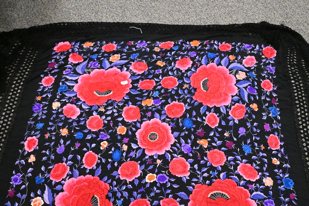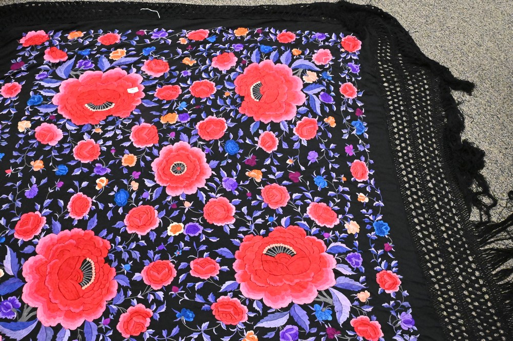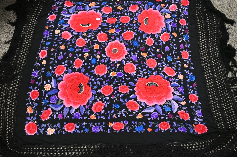 Silk Piano Shawl, having heavy embroidered large flowers.