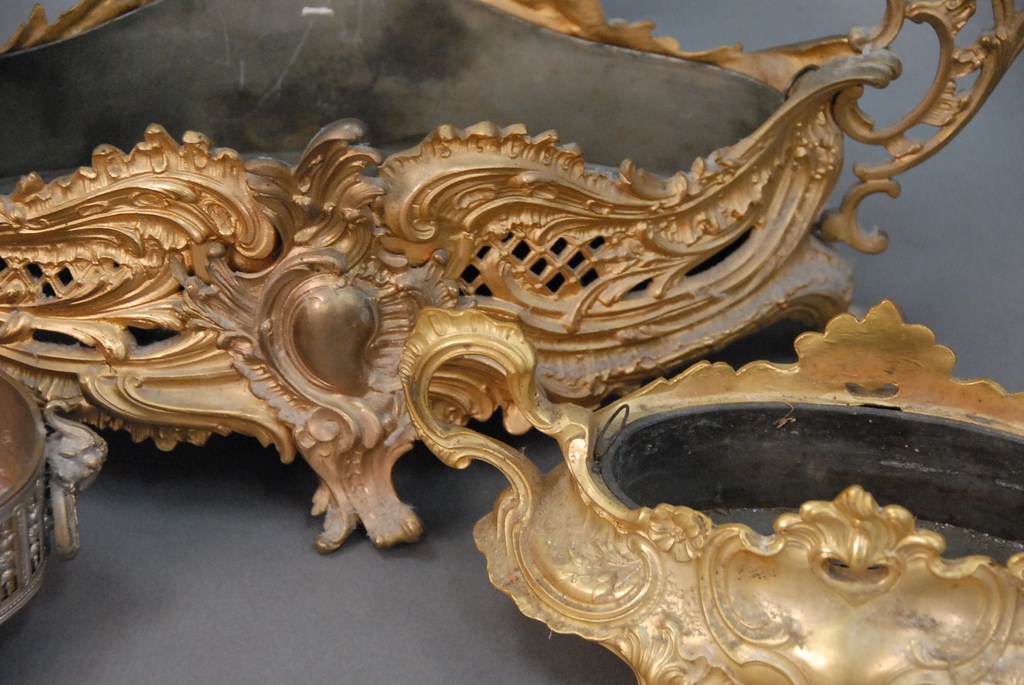 Lot 240: Three piece lot to include a large Louis XV style French gilt metal jardinire with insert, companion small French metal jardinire …