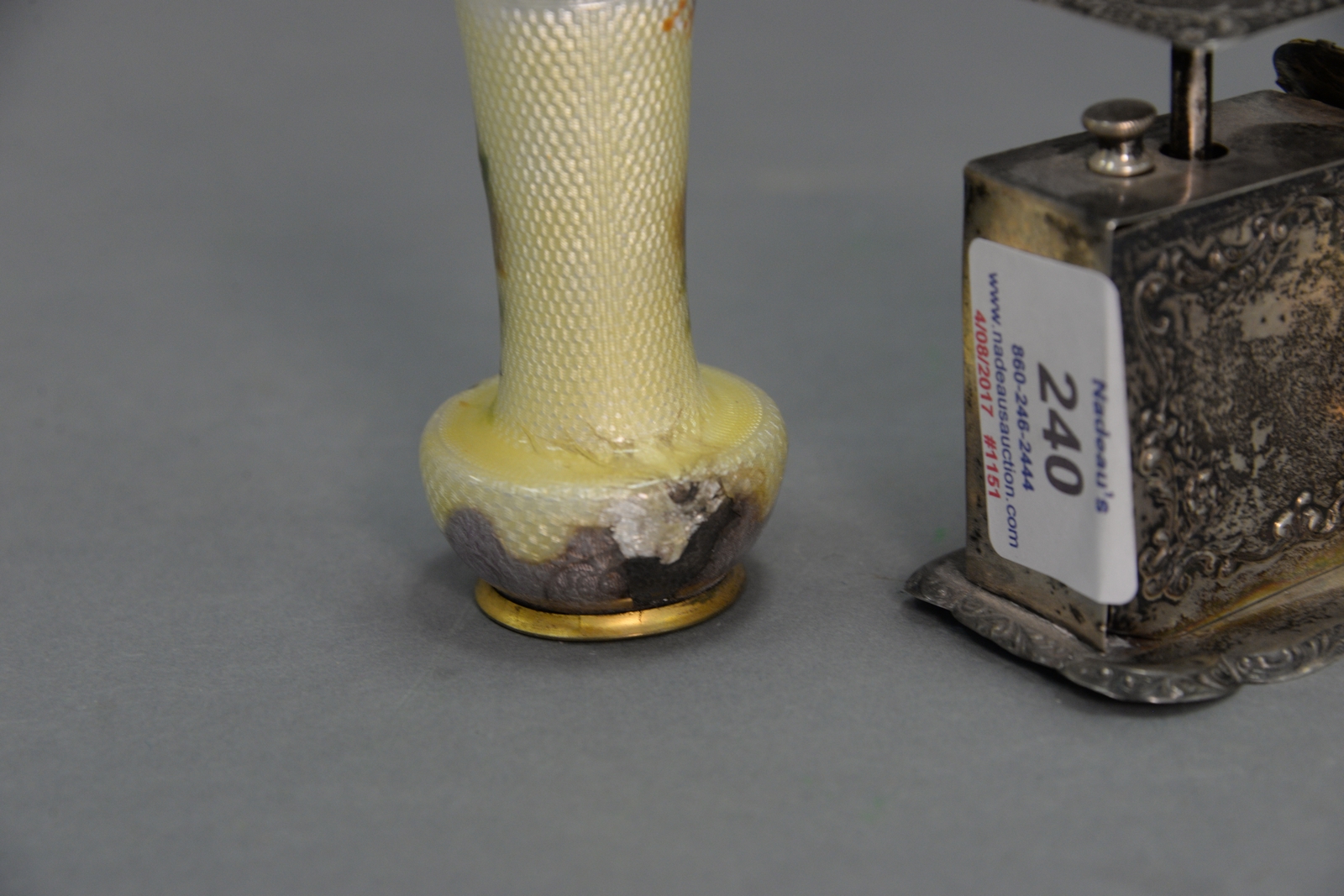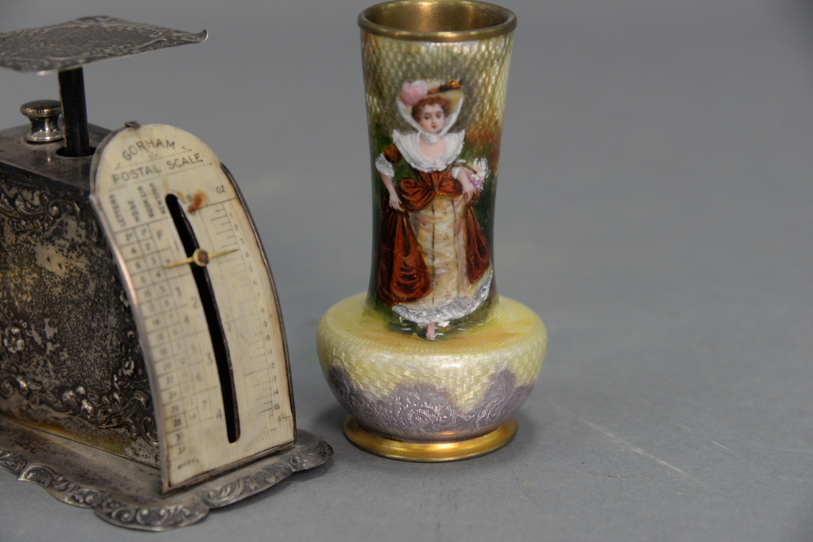 Lot 240: Three piece lot to include pair of enameled vases ht. 3 1/4in. and sterling silver Gorham scale ht. 2 3/4in..