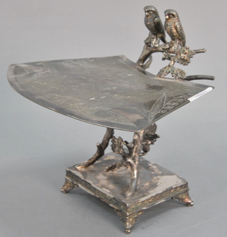 Lot 240: Victorian silverplated calling card holder Should Owls Acquaintance Be Forgot. ht. 7 1/2in., wd. 8 3/4in.