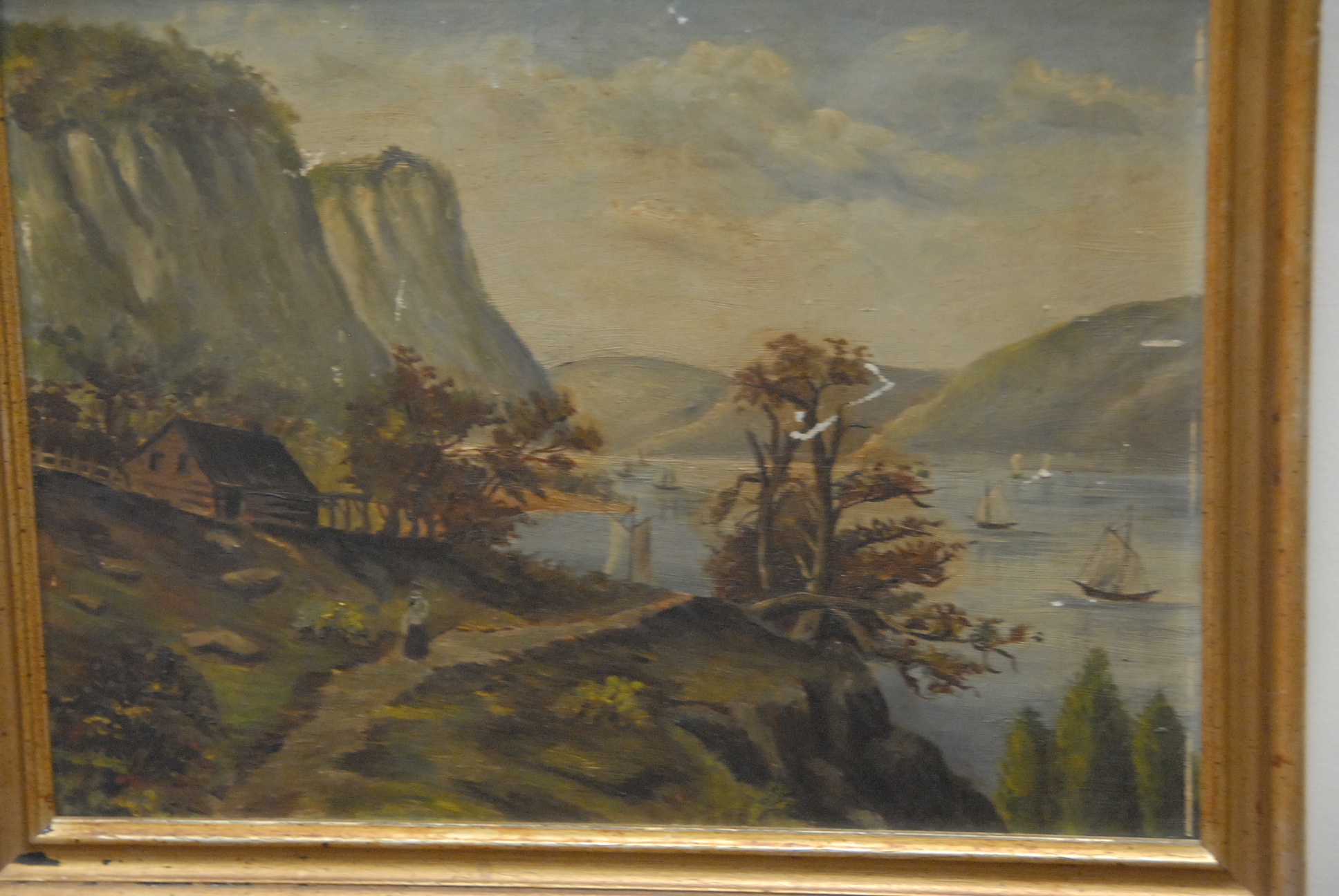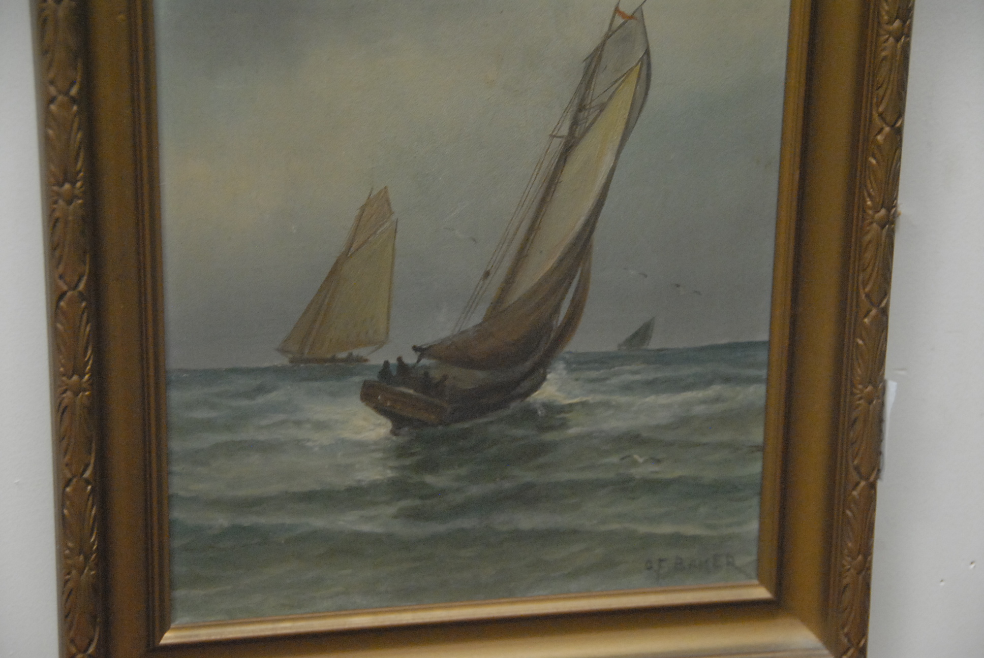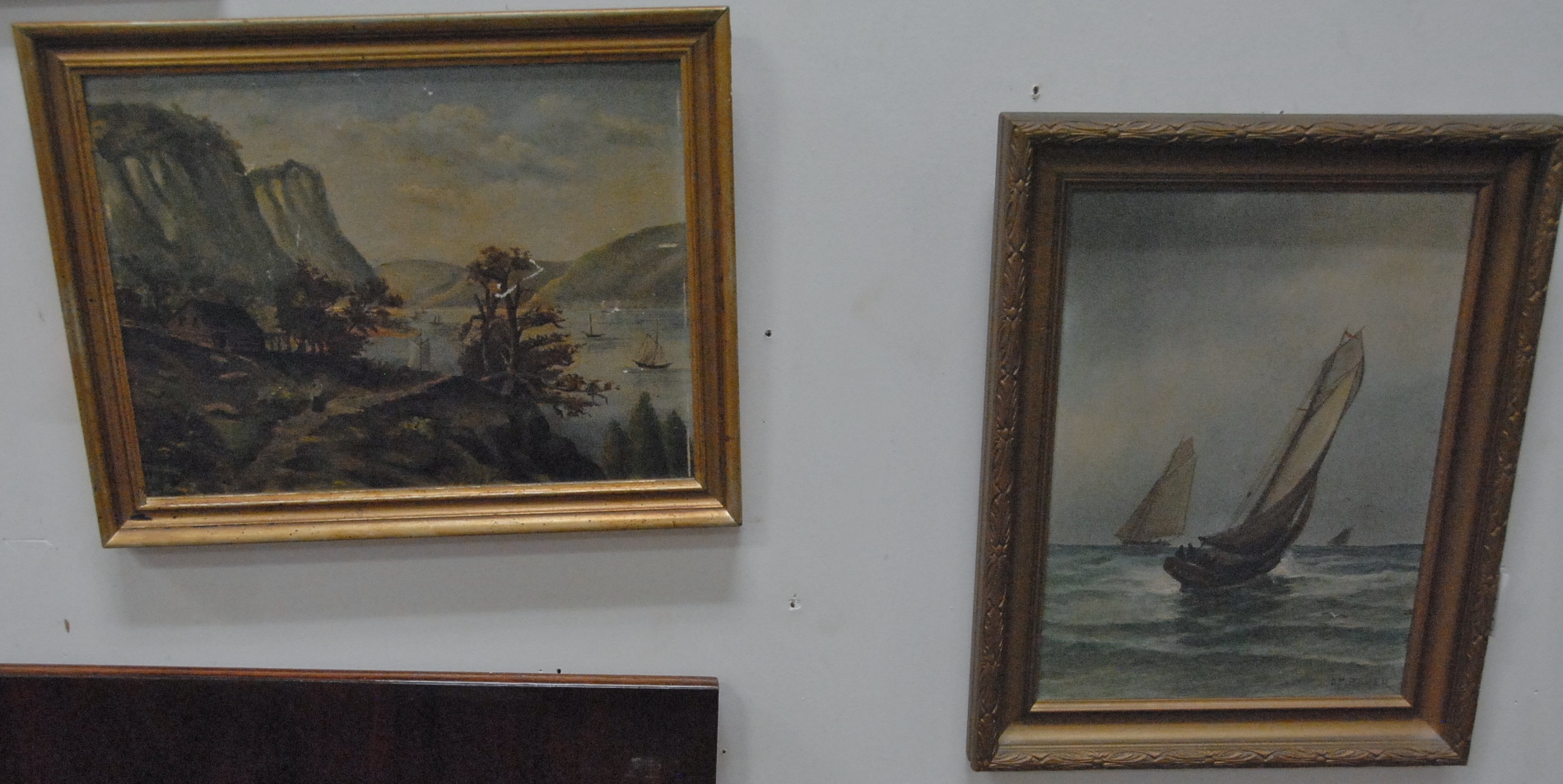 Lot 240B: Two oil on board paintings to include O. F. Baker 19th century SAILING SHIP and 19th century LANDSCAPE unsigned.