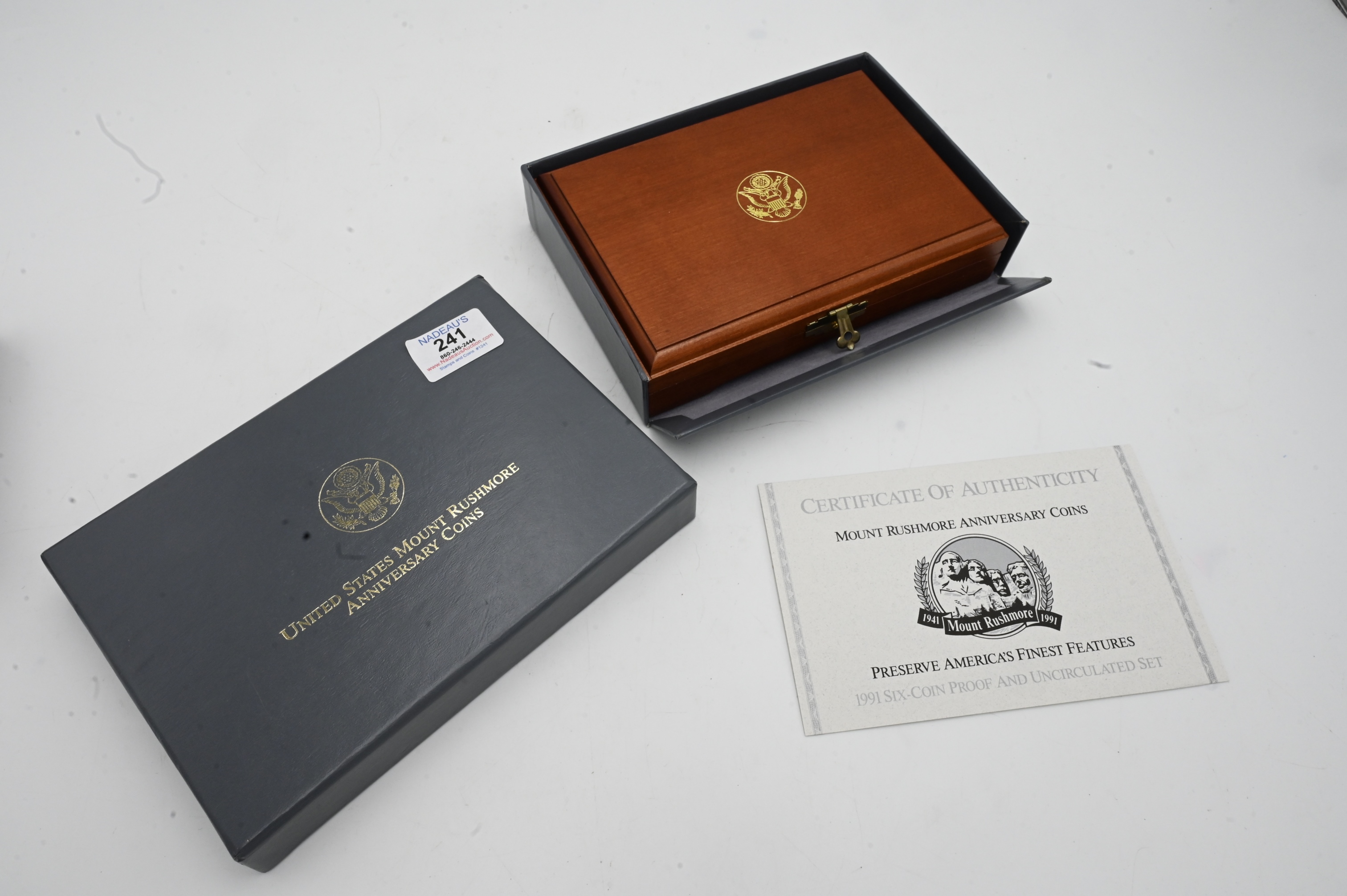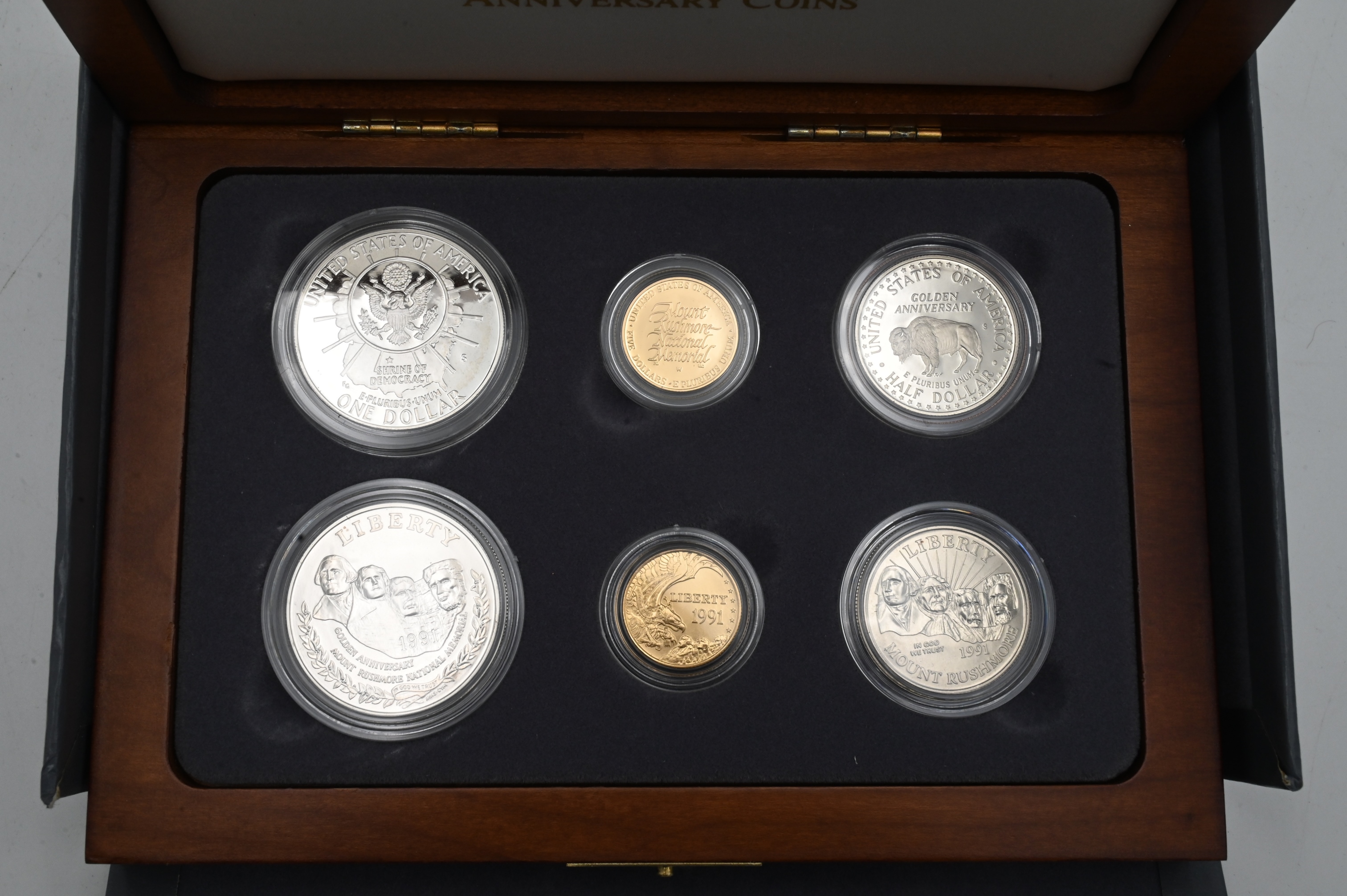 1991 U.S. Mount Rushmore 6 Coin Proof Set, having two gold, two $1 silver, two half dollars in a presentation box, gold 1/2 t.oz.
