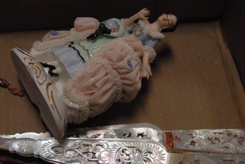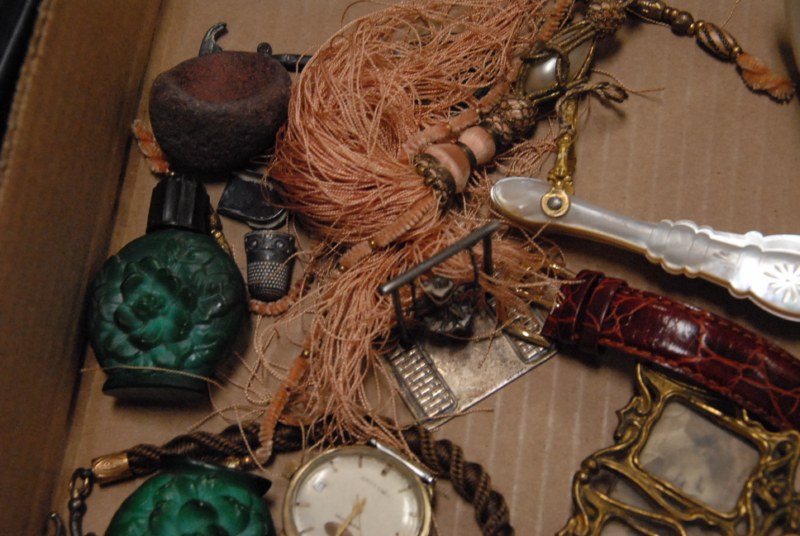 Box lot to include Victorian hair watch chain, 2 small perfume bottles, small silver jewelry, fan, wristwatch, figure, gold plated wristwatch, ivory monkey