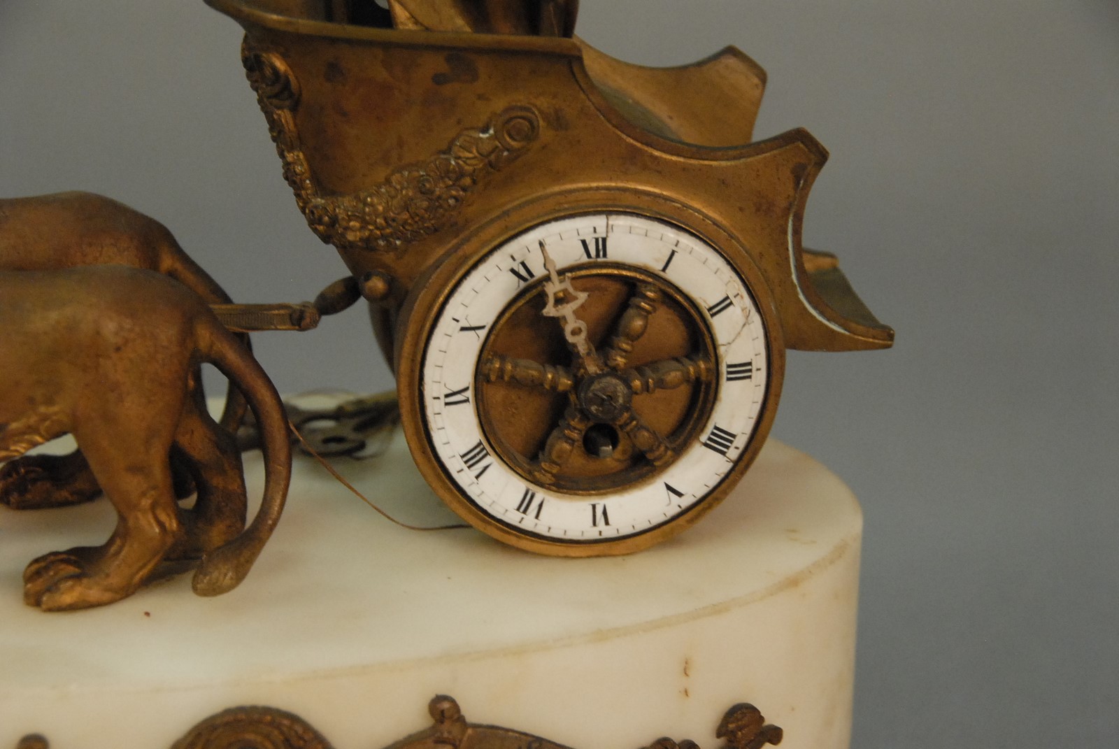 Bronze figural clock, Roman figure in chariot pulled by pair of lions set on white marble base with ball feet, back of clock marked Black Starr & Frost. ht. 14 1/2 in.