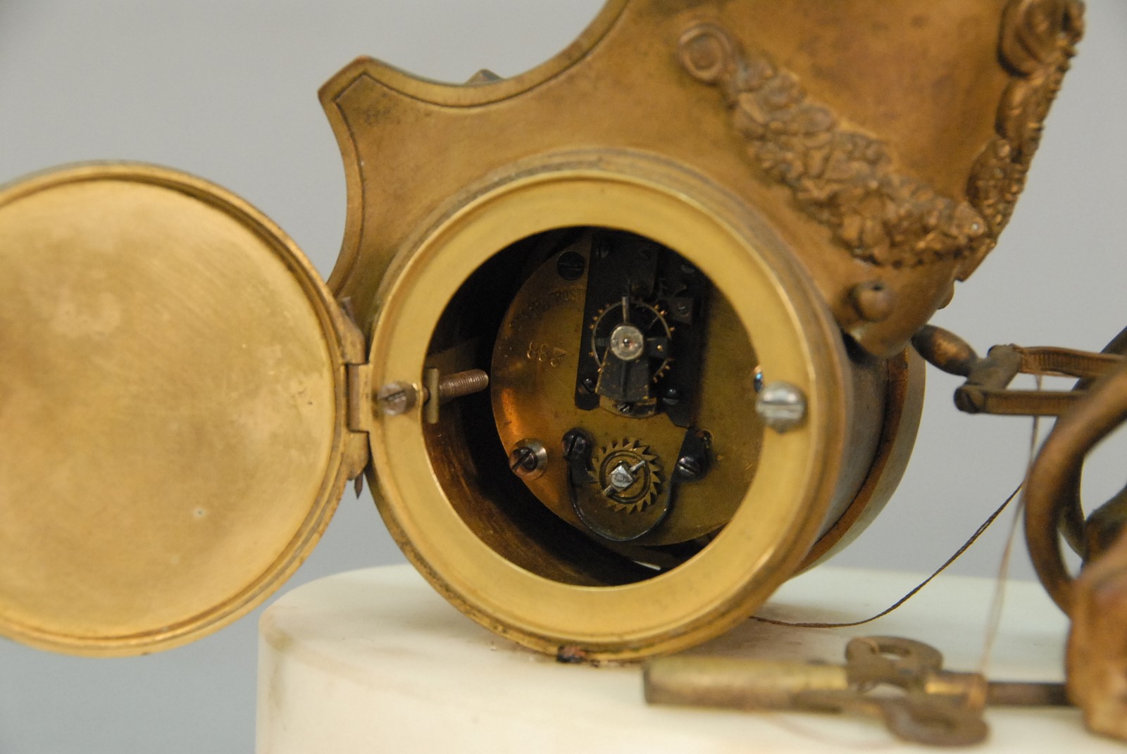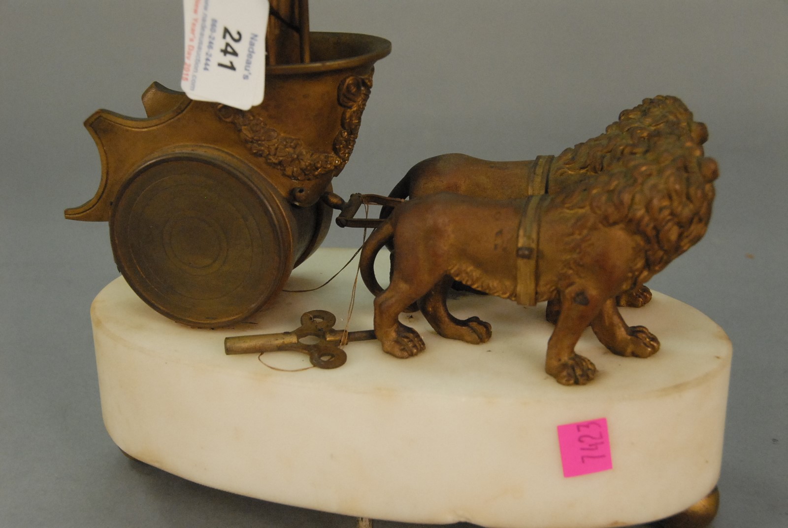 Lot 241: Bronze figural clock, Roman figure in chariot pulled by pair of lions set on white marble base with ball feet, back of clock marked Black Starr & Frost. ht. 14 1/2 in.
