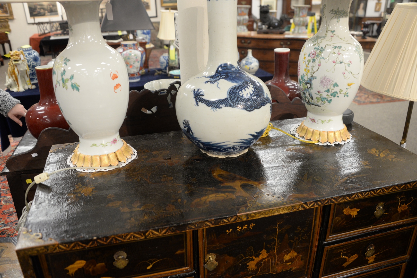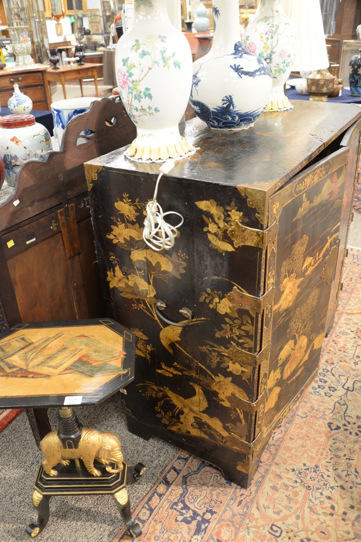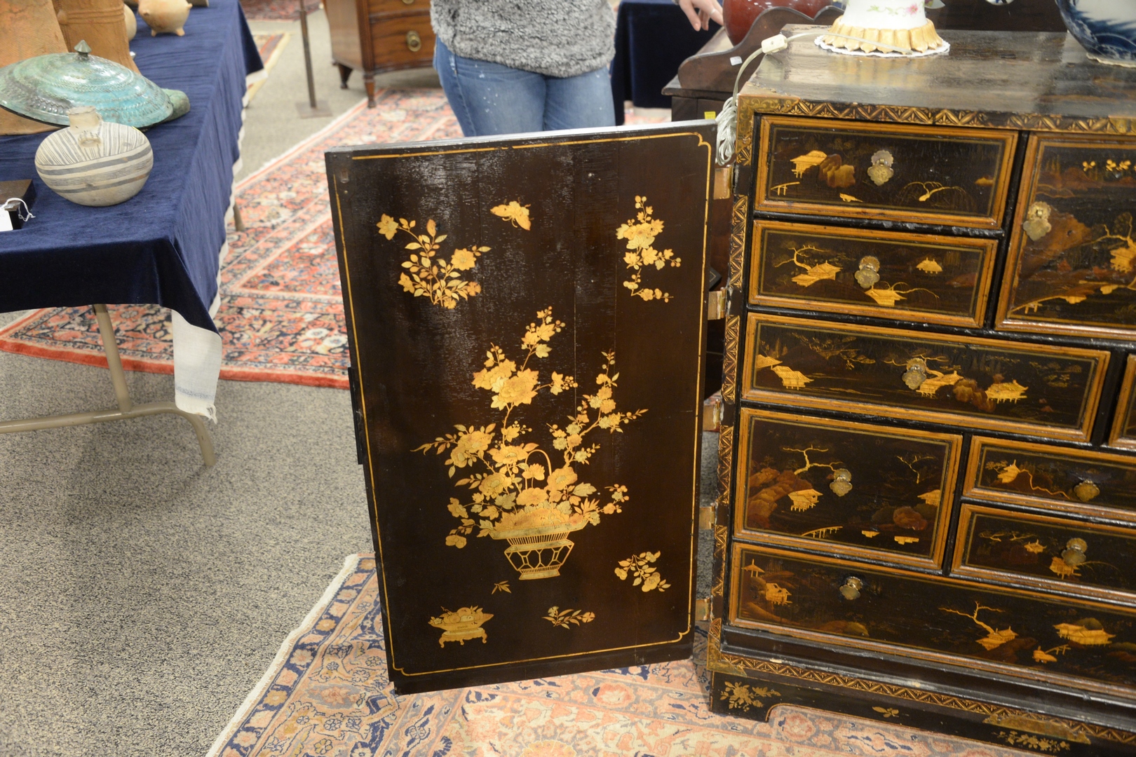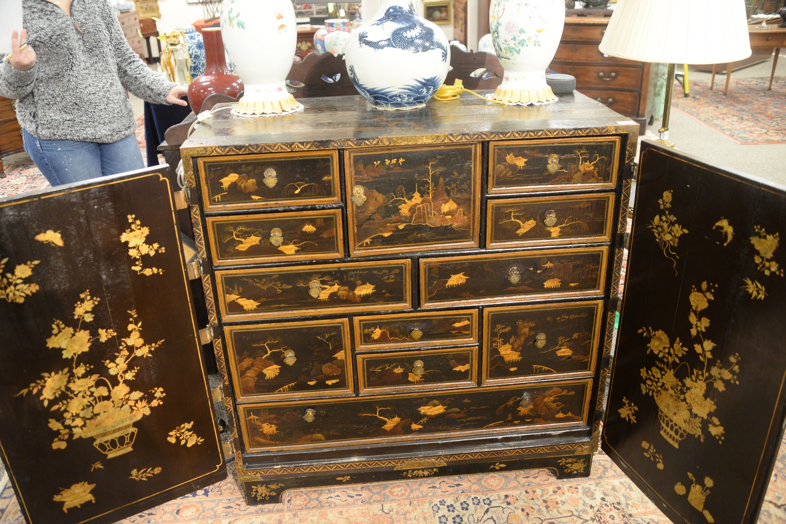 Lot 241: Chinese Chinoiserie Cabinet black lacquered having two doors opening to fitted interior with drawers and doors, all painted with landscape and scrolling vines with flowers, height 41 inches, width 40 inches, depth 20 inches.