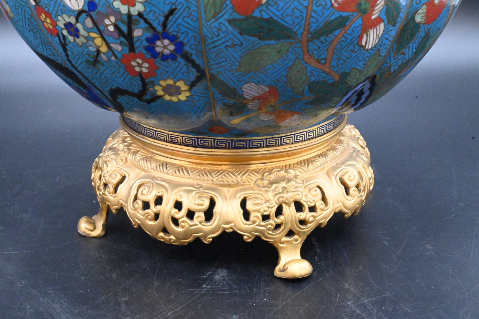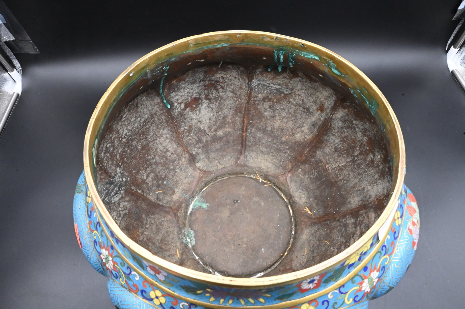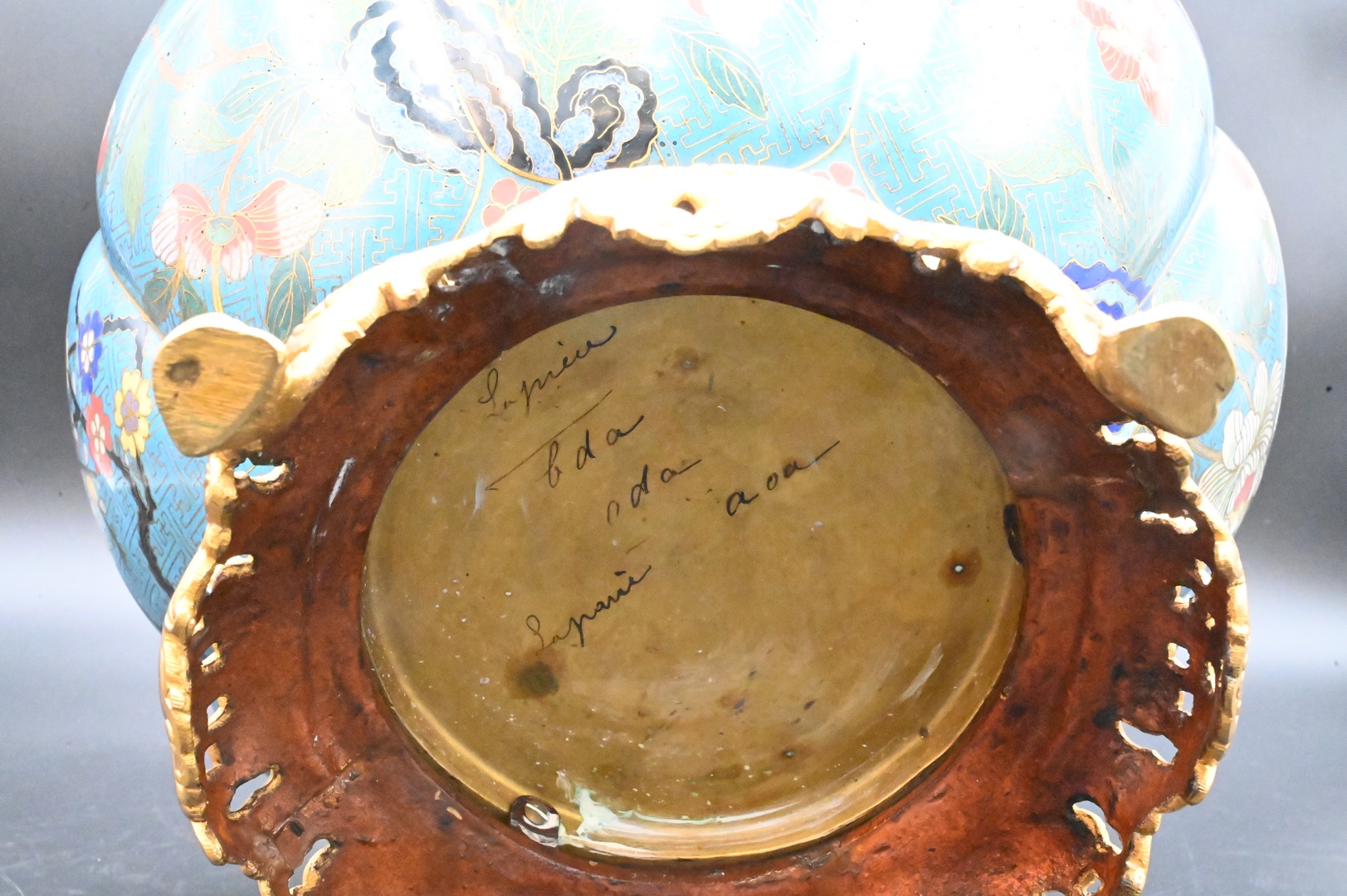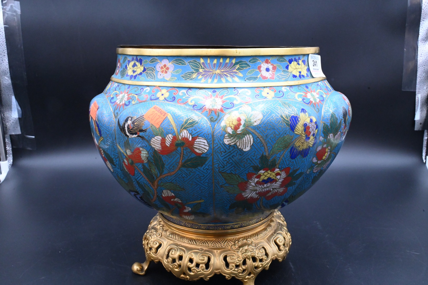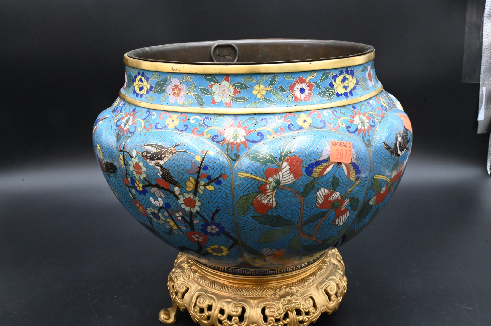 Cloisonne Pot, having lobbed sides with liner on brass stand, height 11 1/4 inches, diameter 9 1/2 inches.