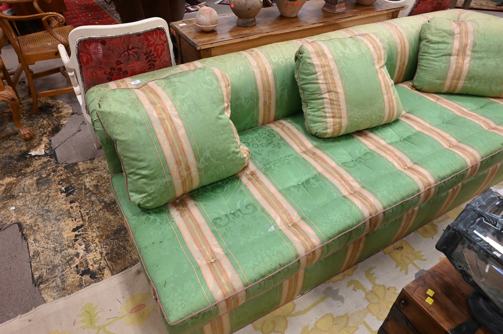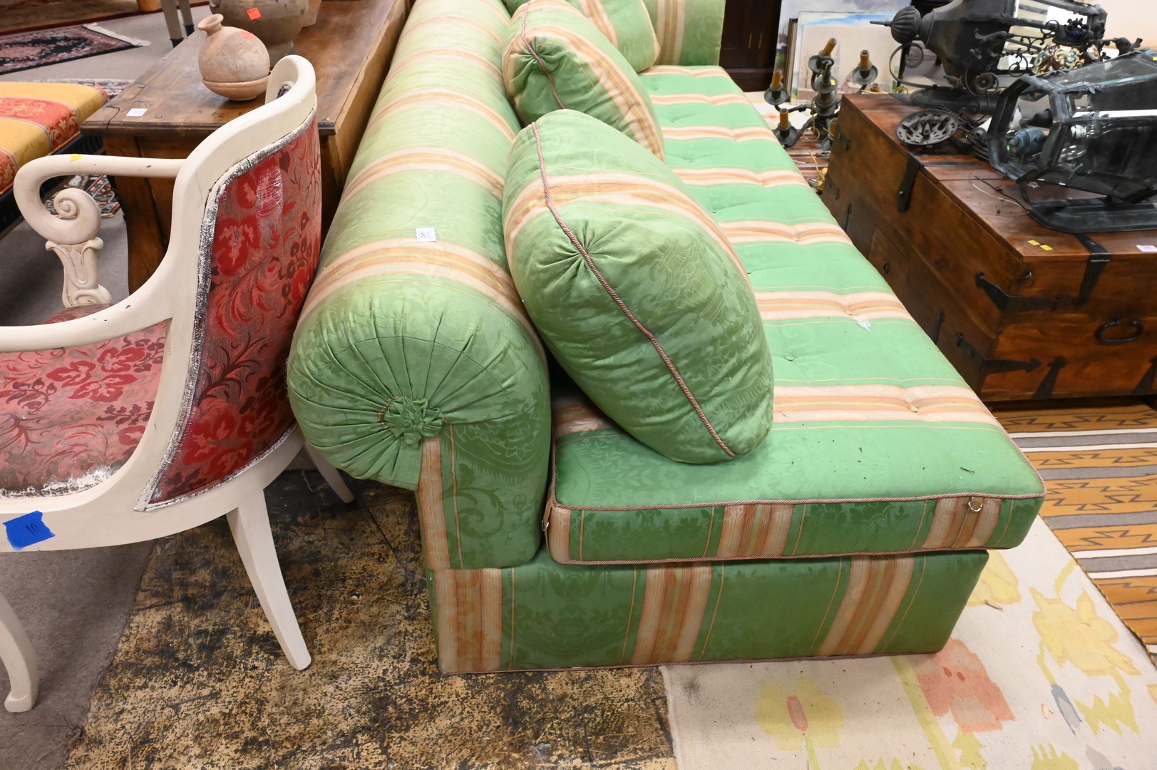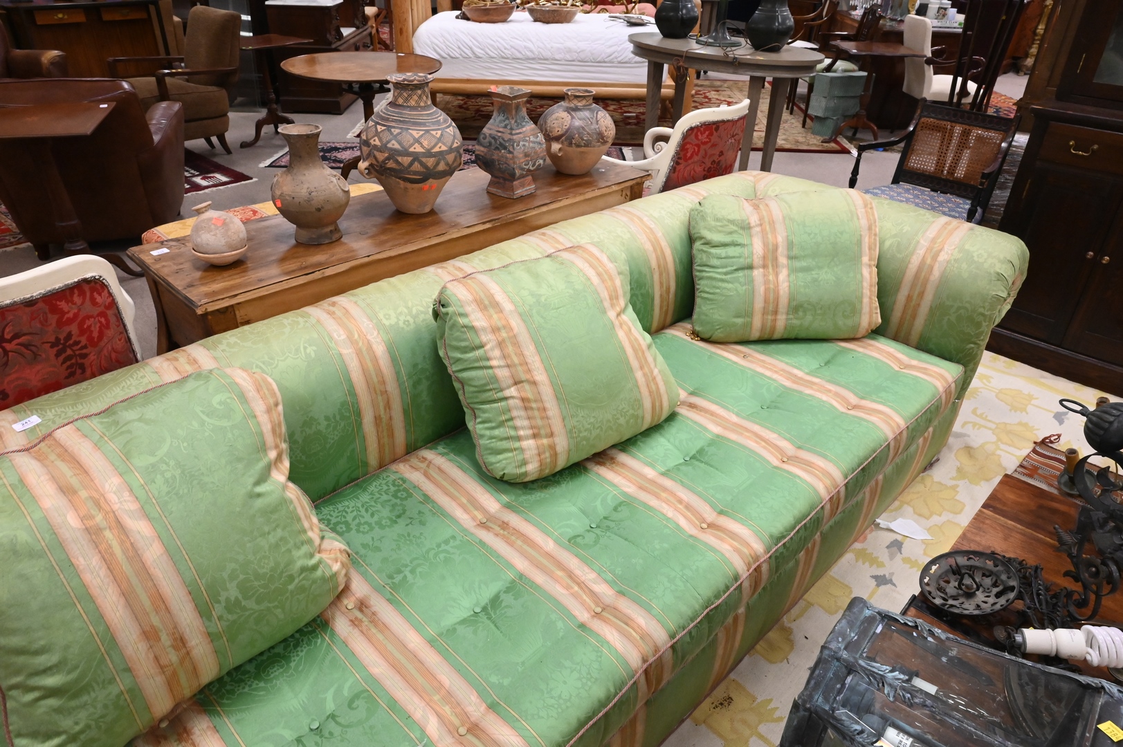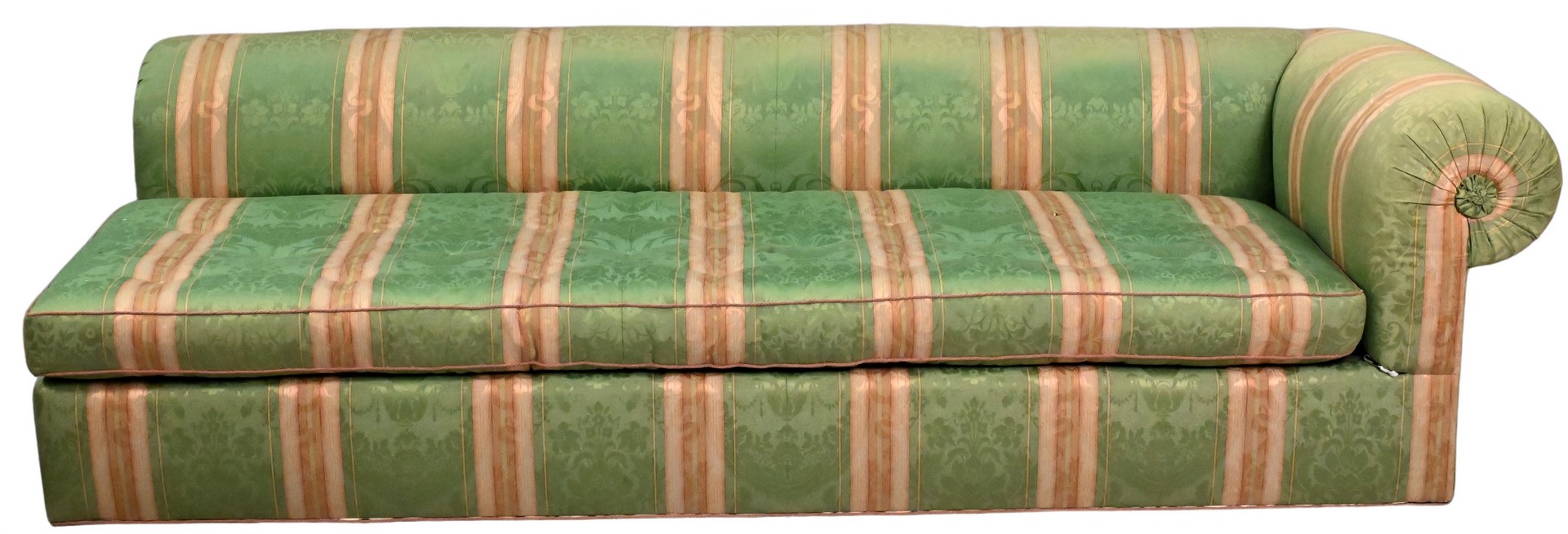 Custom Upholstered Sofa, having one arm and one finished end, slight sun fading, height 20 inches, width 20 inches.