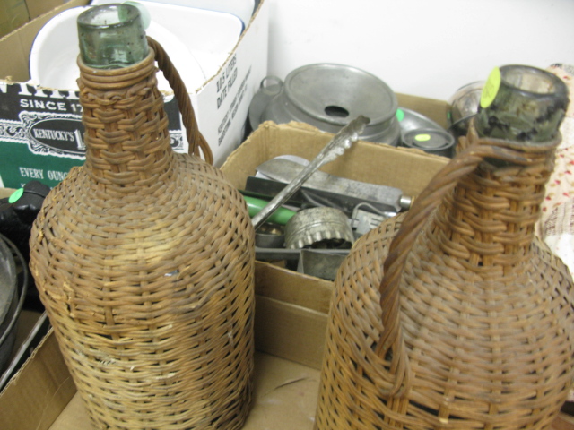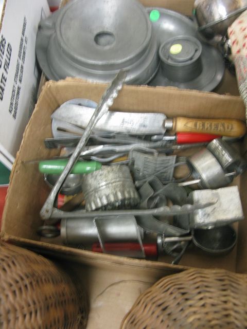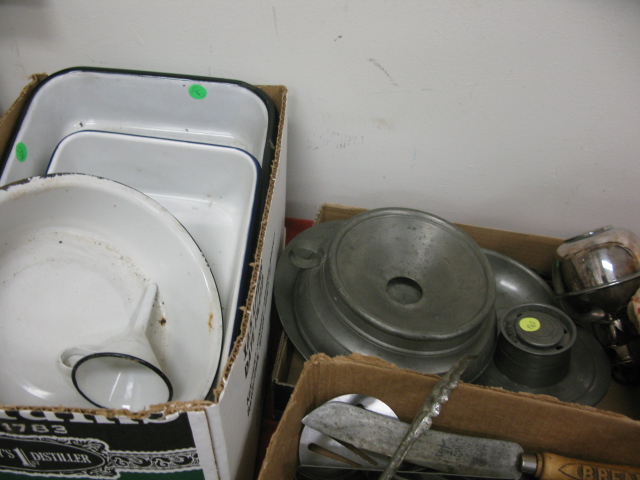 Eight box lots to include tole molds, porcelain pots, pewter, spittoons, plates, bottles, iron pot, blue and white platter, iron stone tureen and early quilt, two hot boxes etc