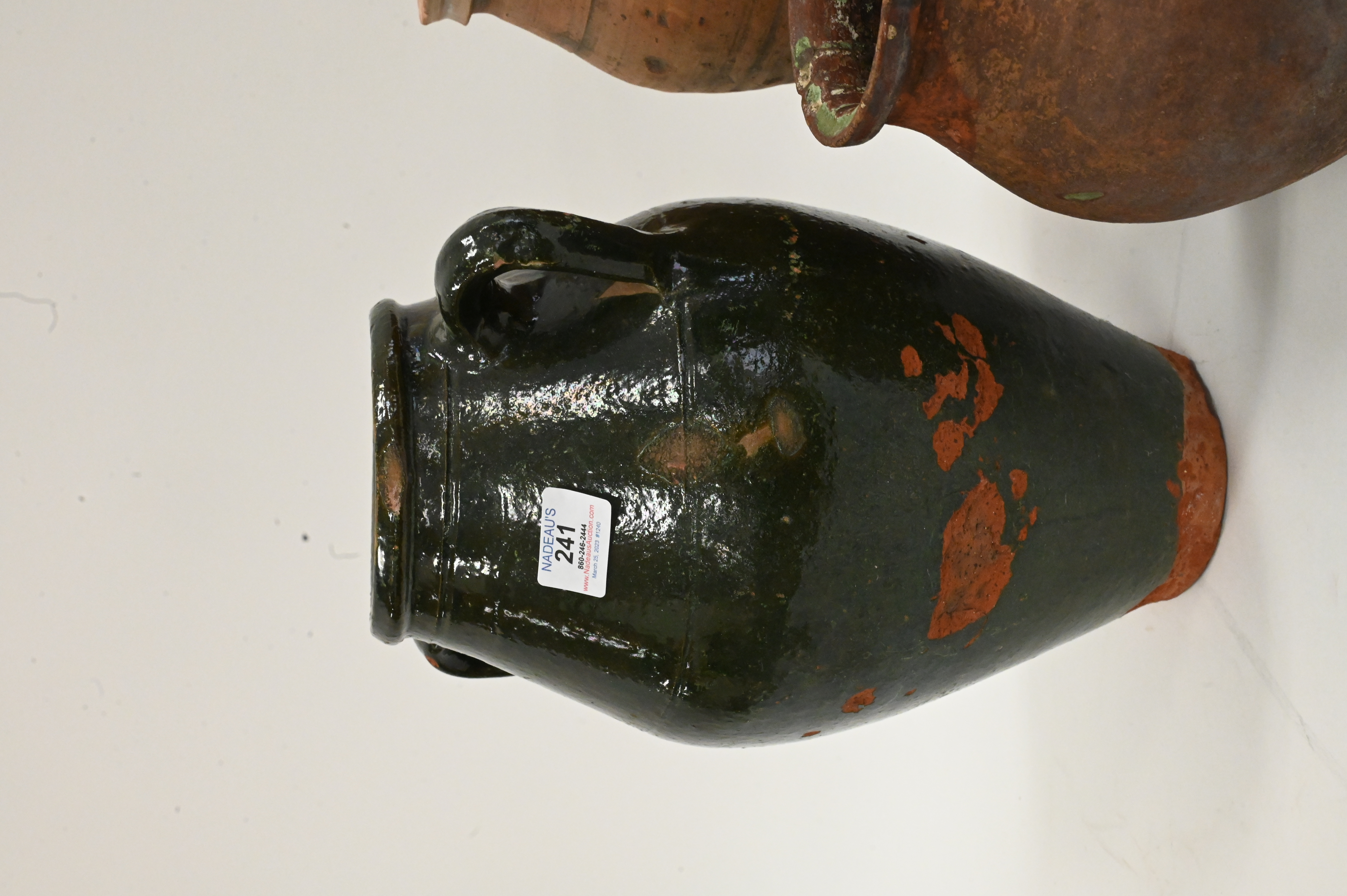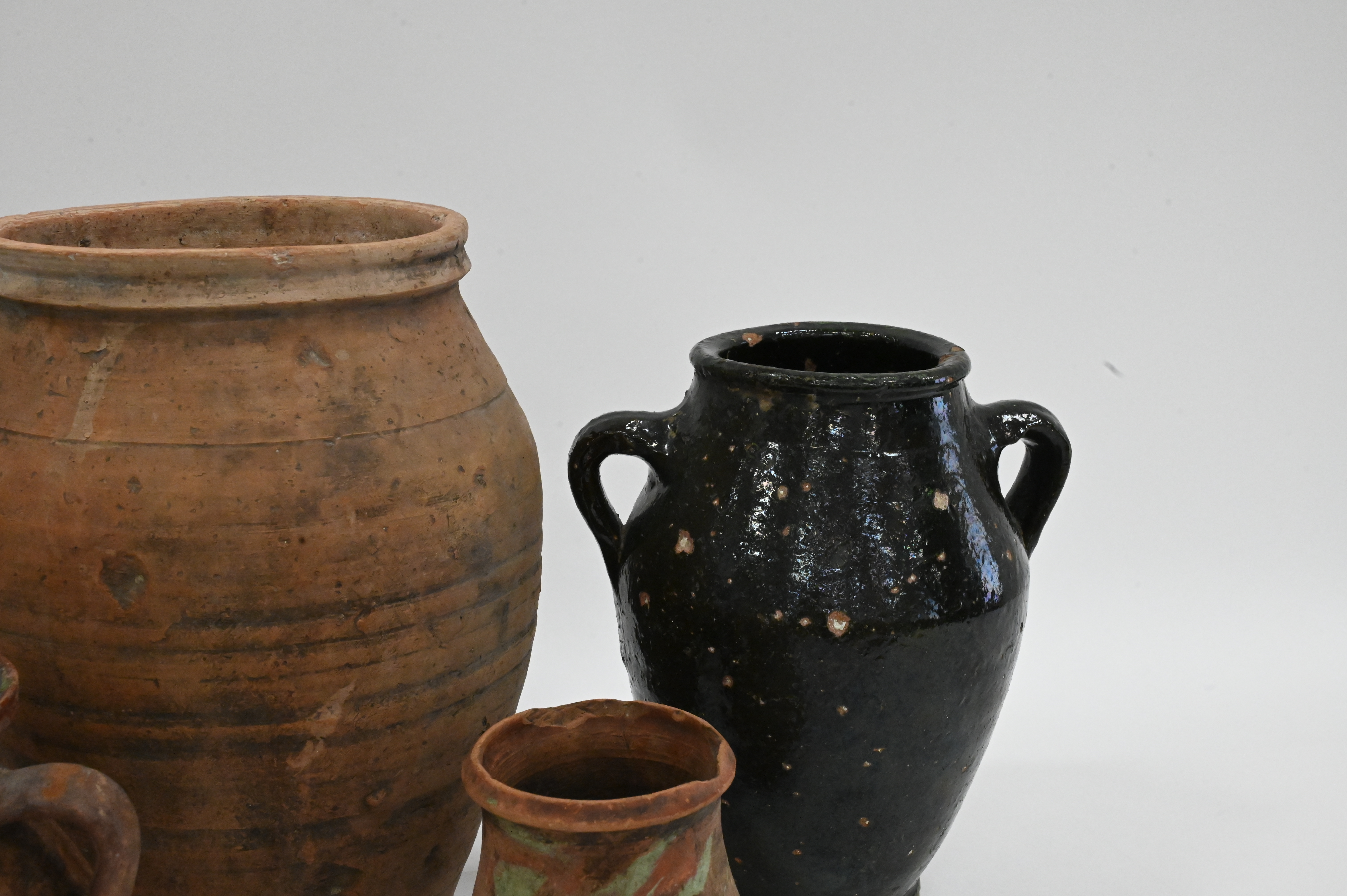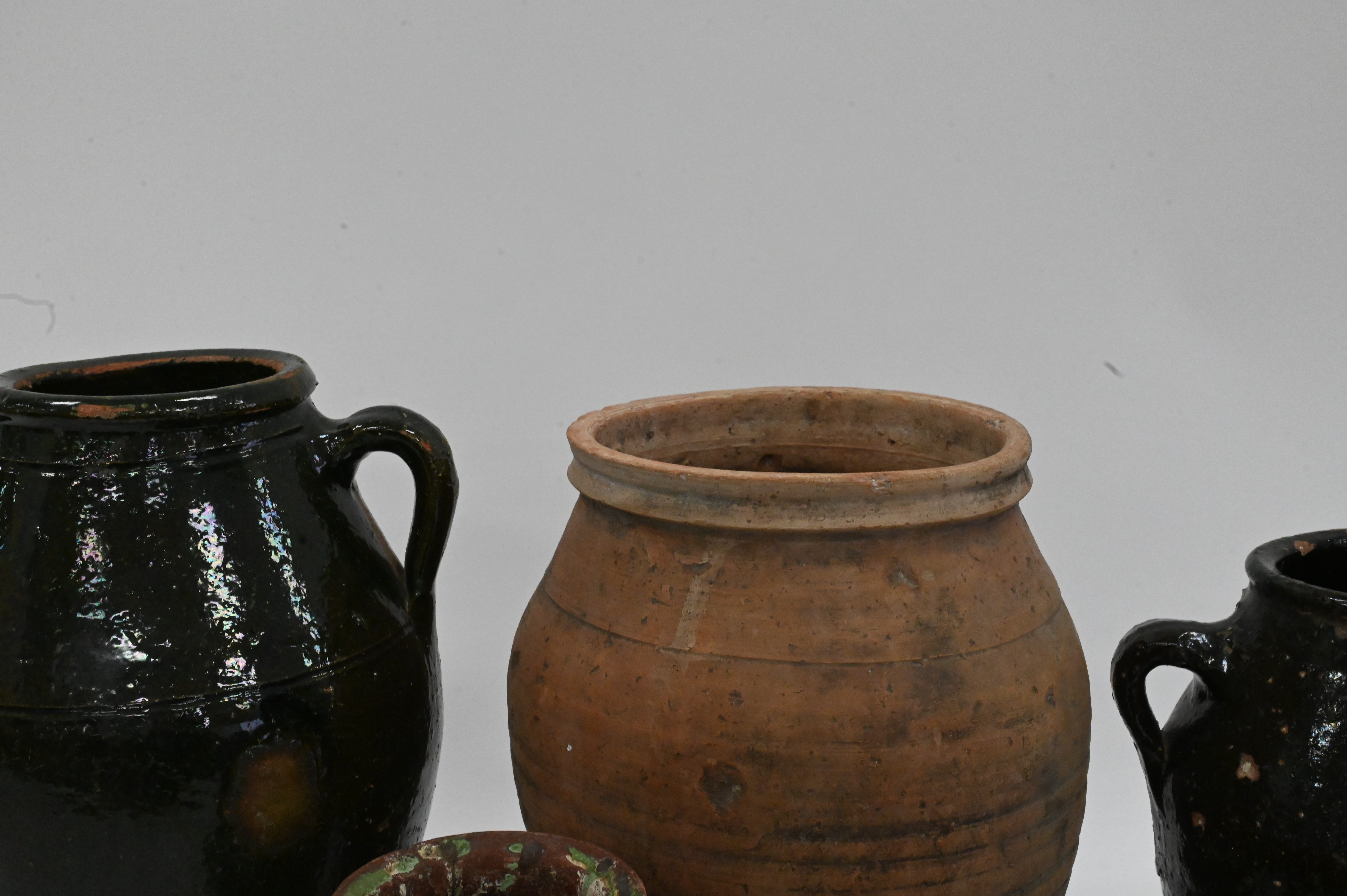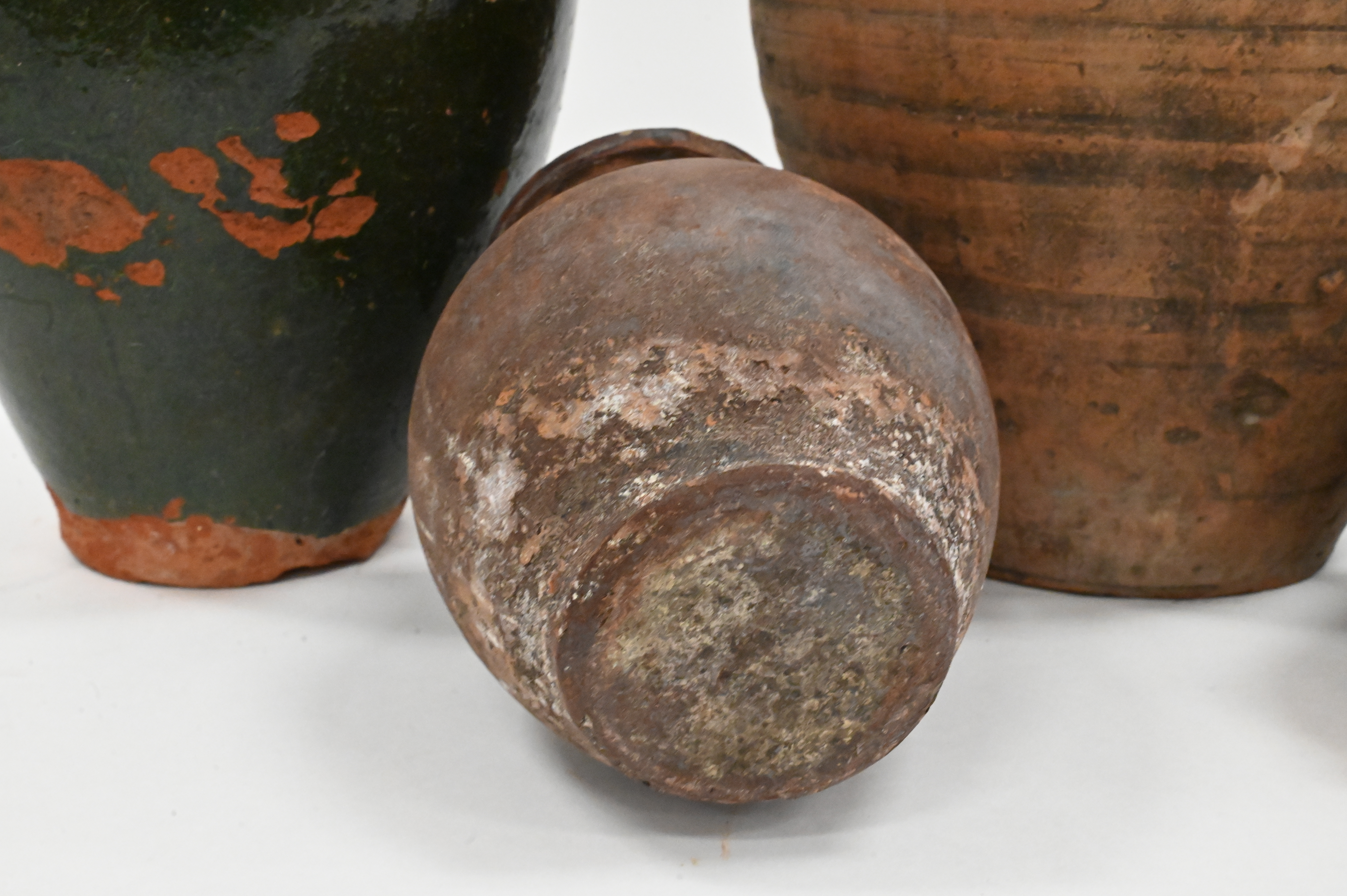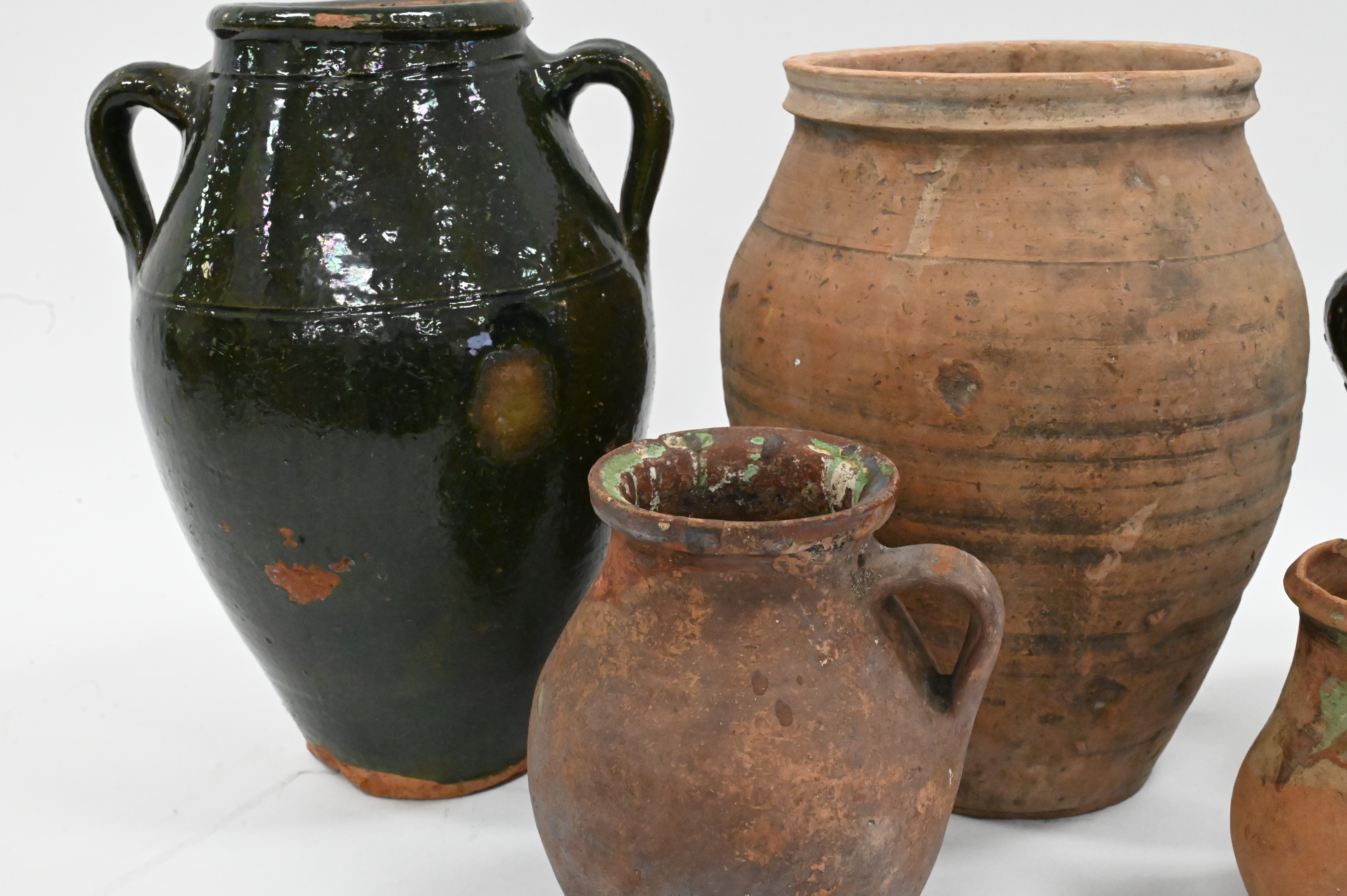 Five Earthenware Jugs, to include two having green glazing, etc., tallest 13 inches.