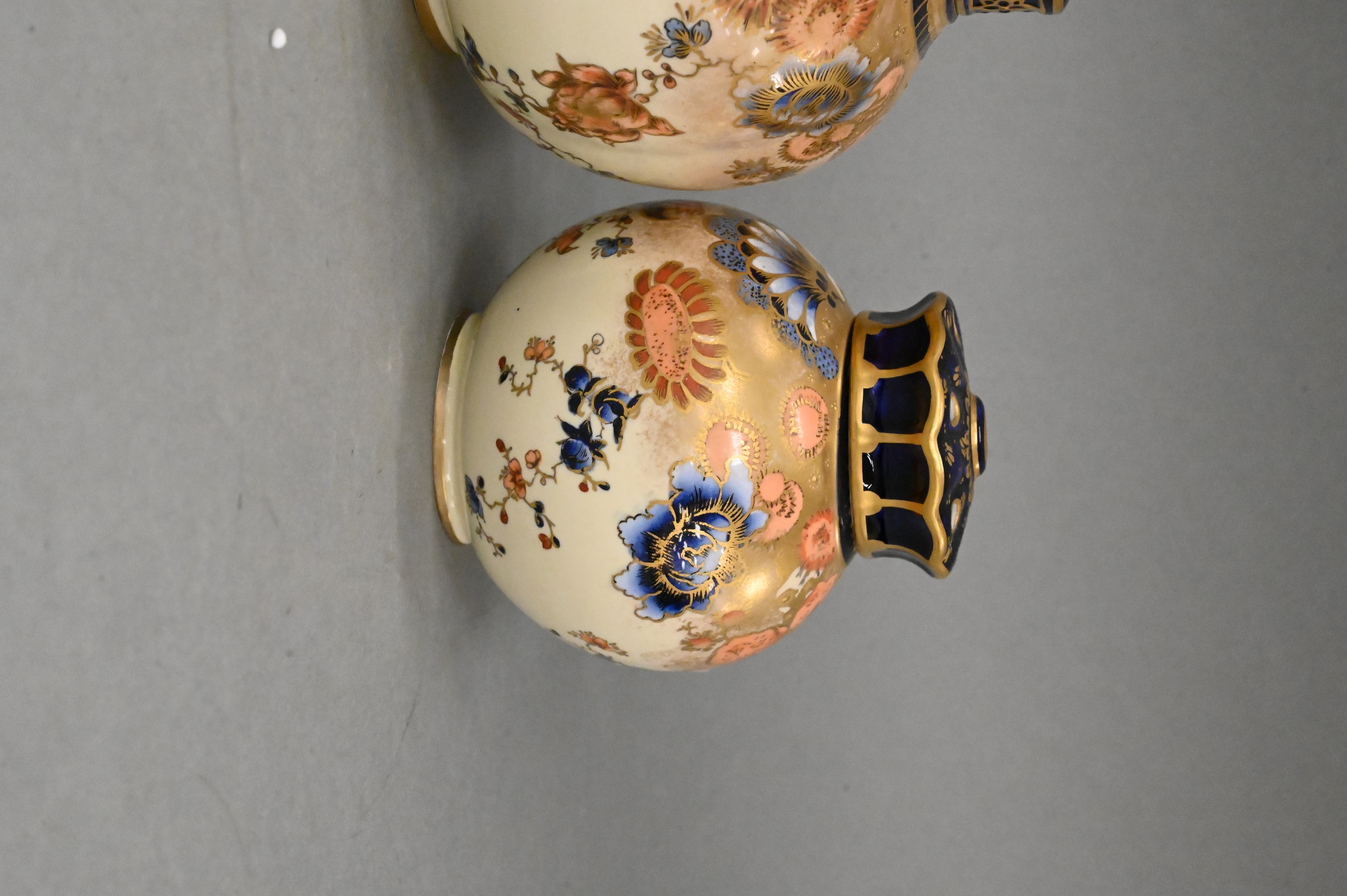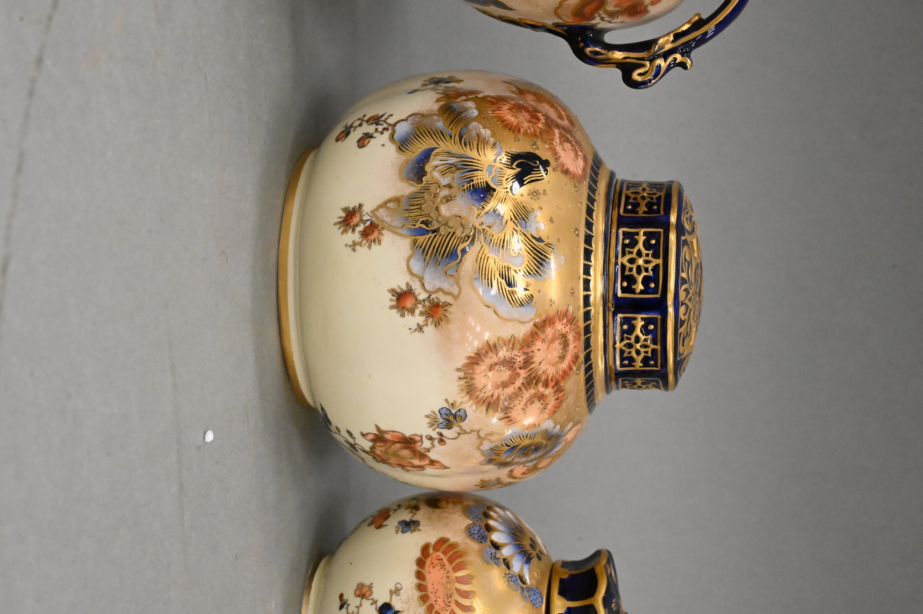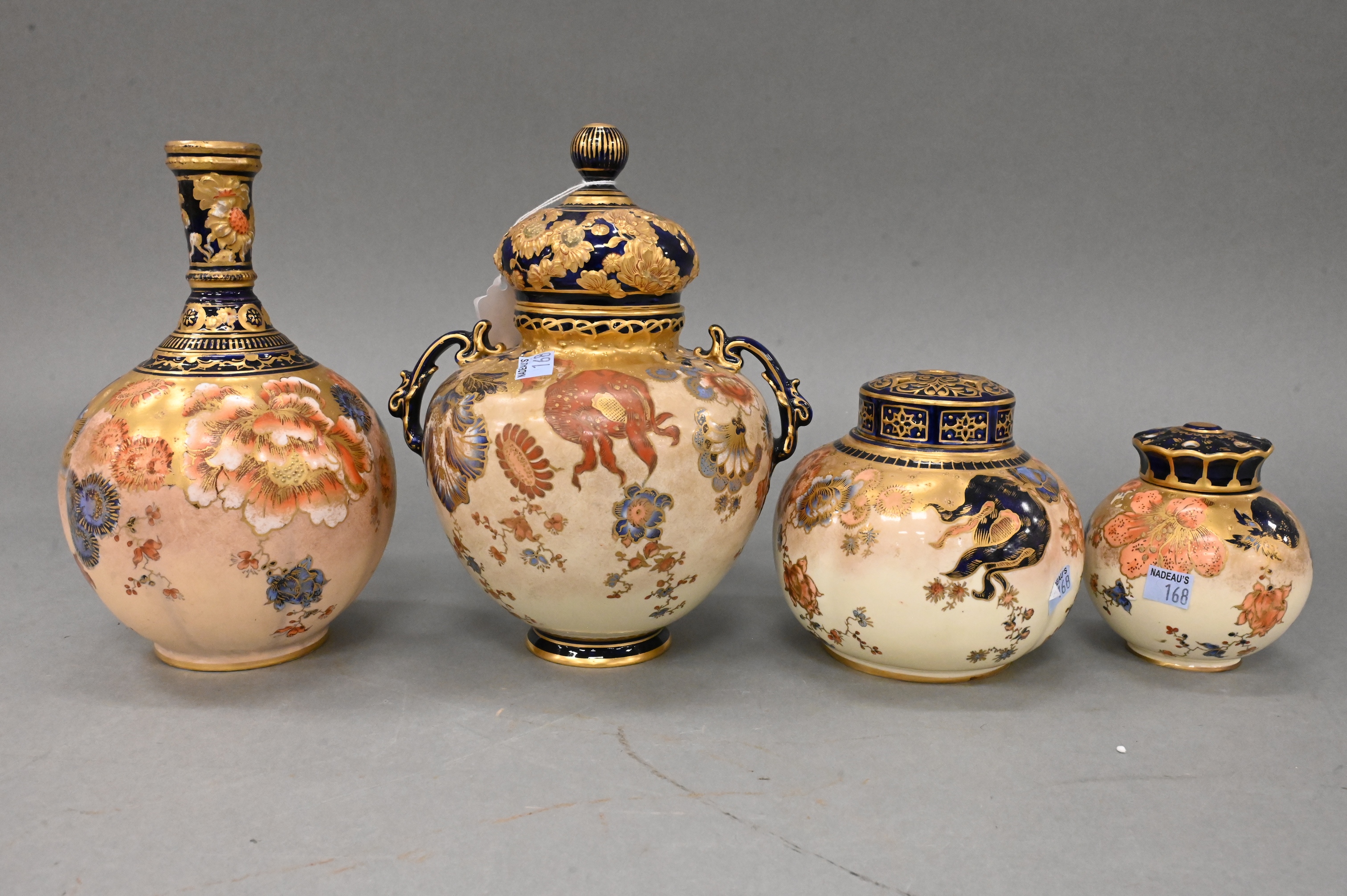 to include two smaller covered jars, baluster form covered jar along with bottle neck vase, each decorated with hand-painted floral motifs in polychrome enamels, heightened with extensive gilt detailing and cobalt accents