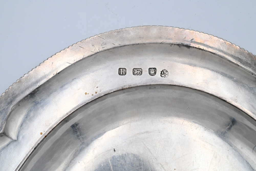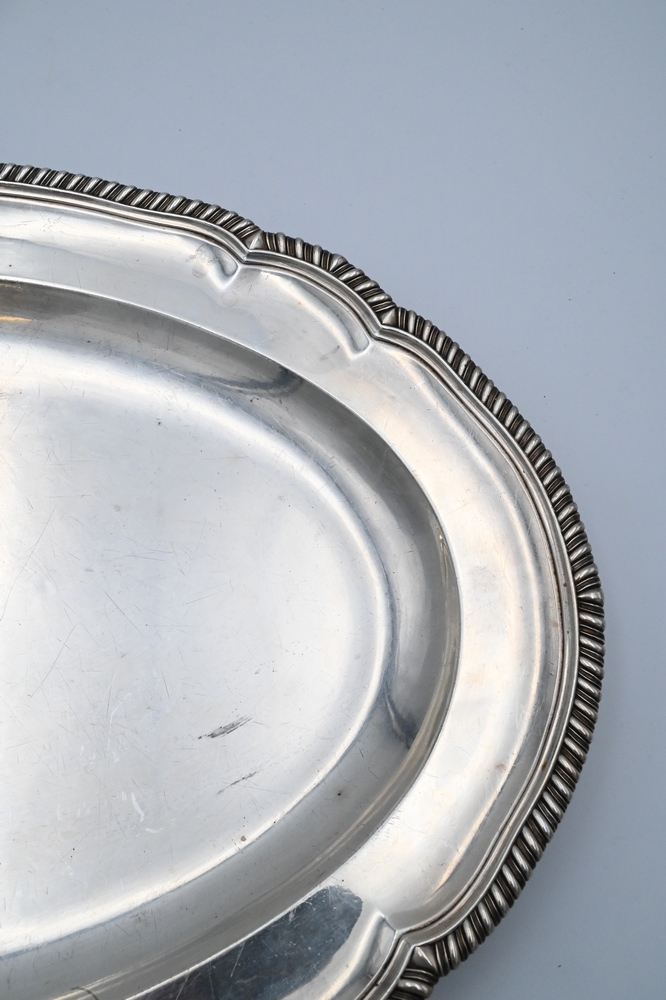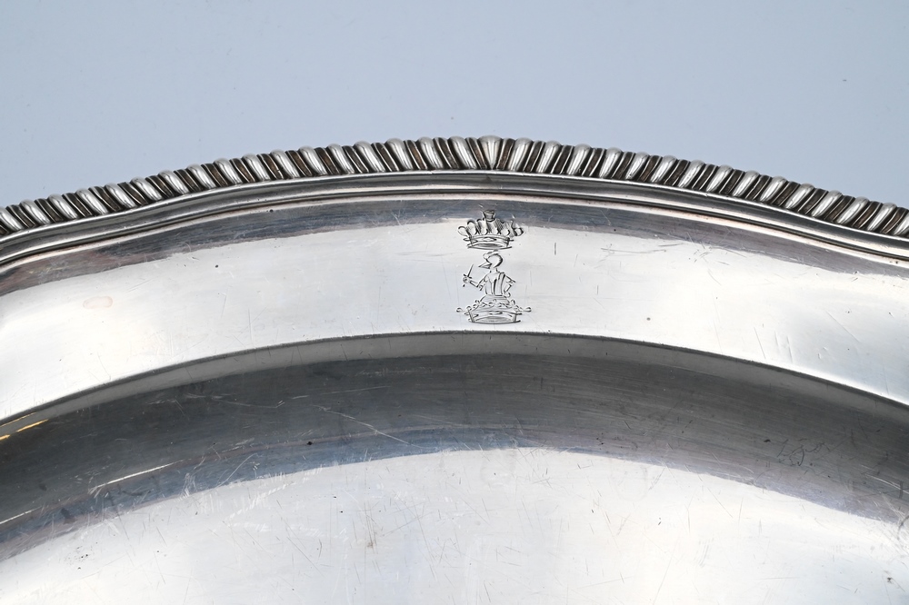 Lot 241: John Wakelin & William Taylor, circa 1776, deep silver tray, oval form with gadrooned edge, having coat of arms of a knight, 12 1/4 …