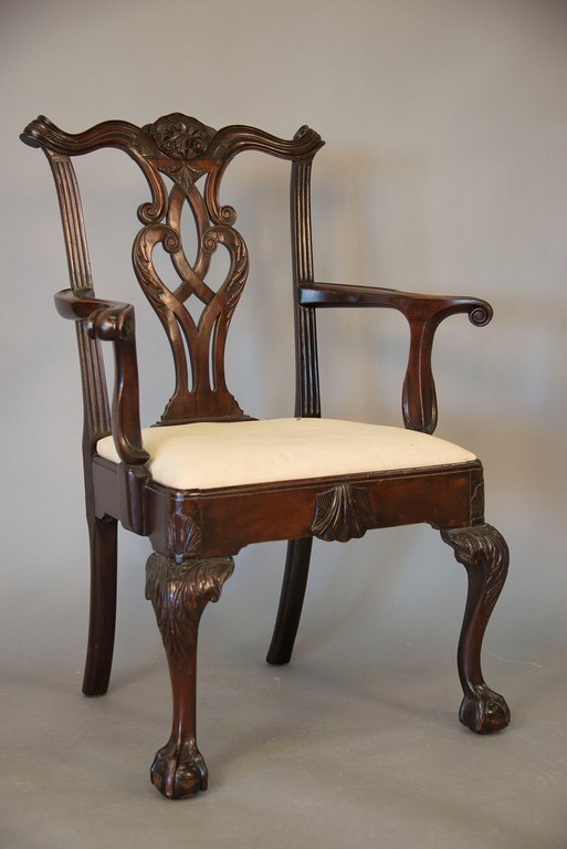 Mahogany Chippendale armchair having arched crest rail ornamented with carved rope and tassel motif and deeply scrolled ears with a center rocaille shell all over a pierced carved splat, the slip seat flanked by scrolled arms all set on cabriole legs with typical Philadelphia acanthus leaves carved on knees ending in ball and claw feet with central carved shell on seat rail. This chair is closely related to side chair in the Collection of Baltimore Museum pictured in American Furniture Book plate #13. seat ht. 17 1/2 in. total ht. 39 1/4 in.