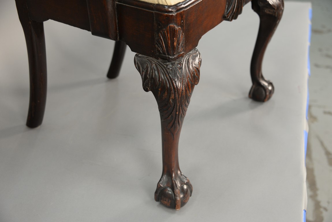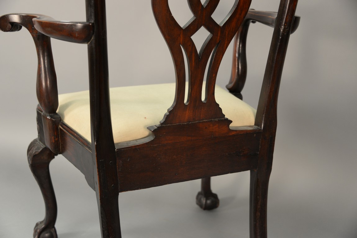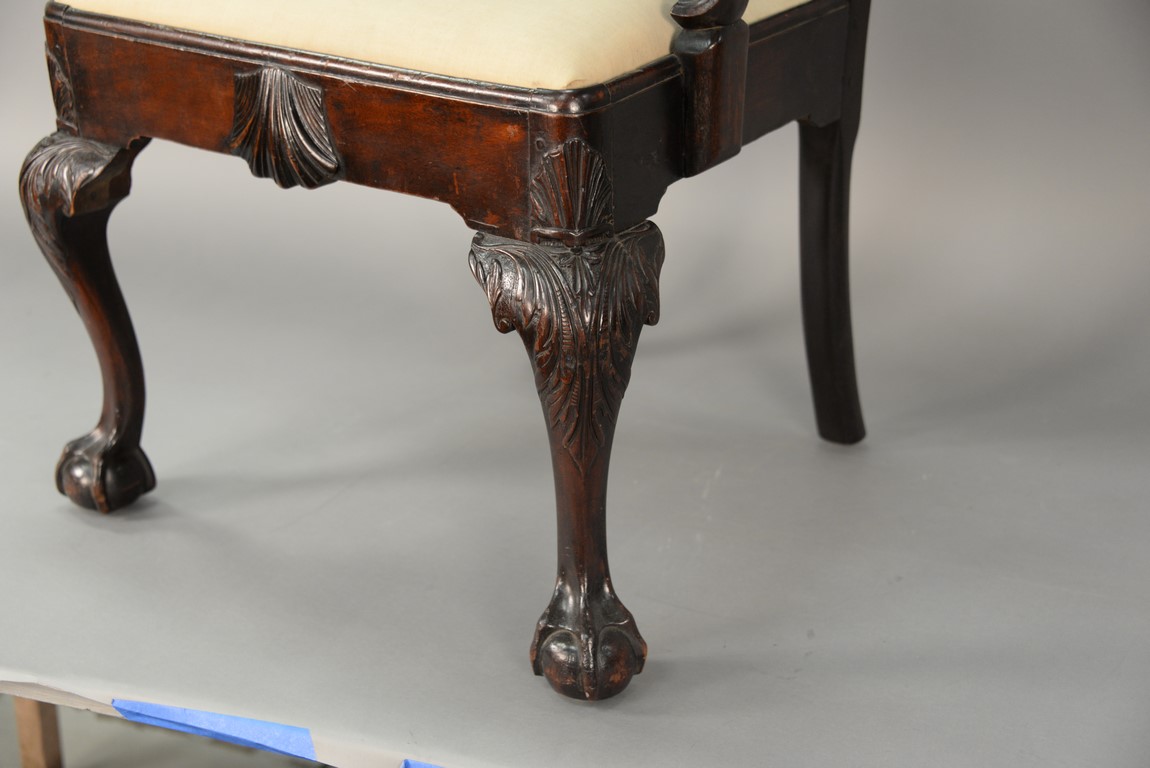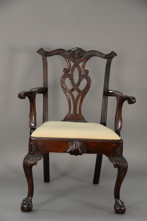 Mahogany Chippendale armchair having arched crest rail ornamented with carved rope and tassel motif and deeply scrolled ears with a center rocaille shell all over a pierced carved splat, the slip seat flanked by scrolled arms all set on cabriole legs with typical Philadelphia acanthus leaves carved on knees ending in ball and claw feet with central carved shell on seat rail. This chair is closely related to side chair in the Collection of Baltimore Museum pictured in American Furniture Book plate #13. seat ht. 17 1/2 in. total ht. 39 1/4 in.