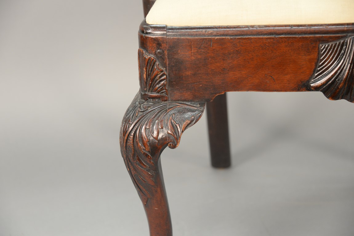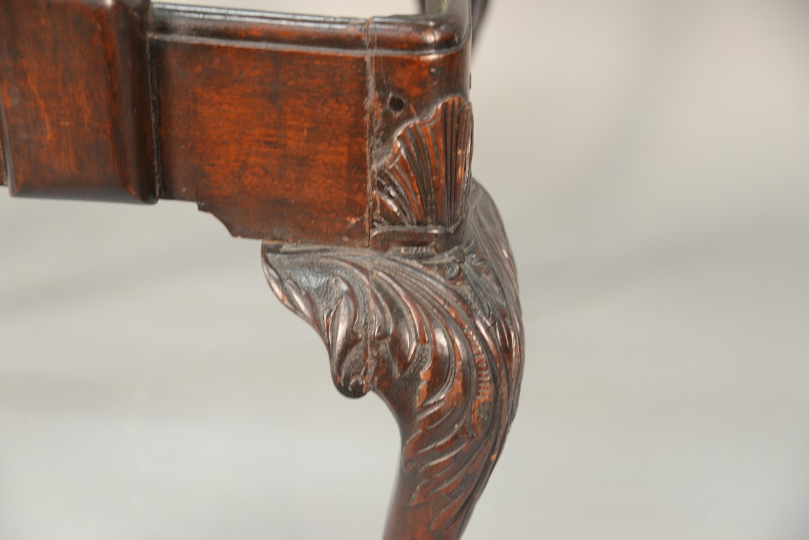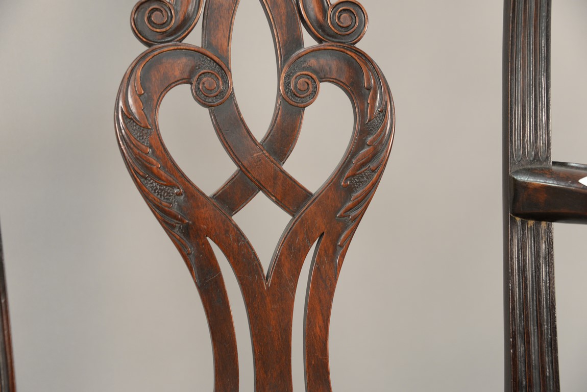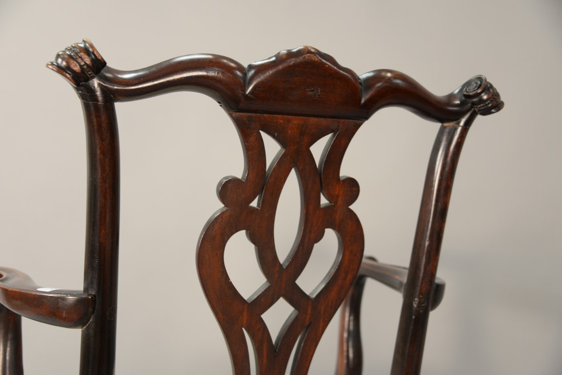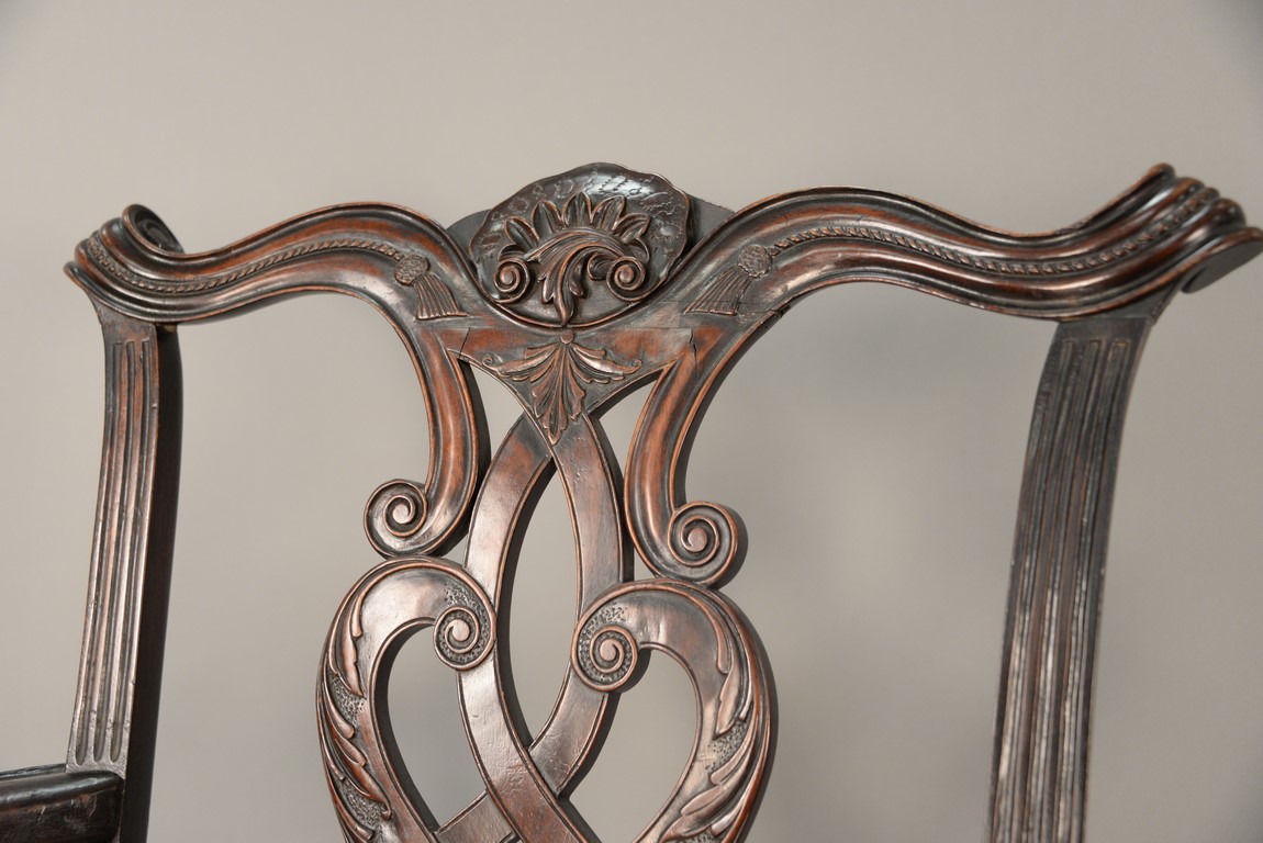 Lot 241: Mahogany Chippendale armchair having arched crest rail ornamented with carved rope and tassel motif and deeply scrolled ears with a center rocaille shell all over a pierced carved splat, the slip seat flanked by scrolled arms all set on cabriole legs