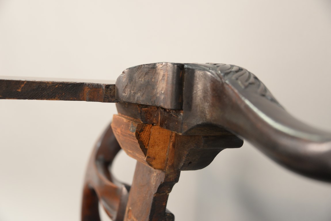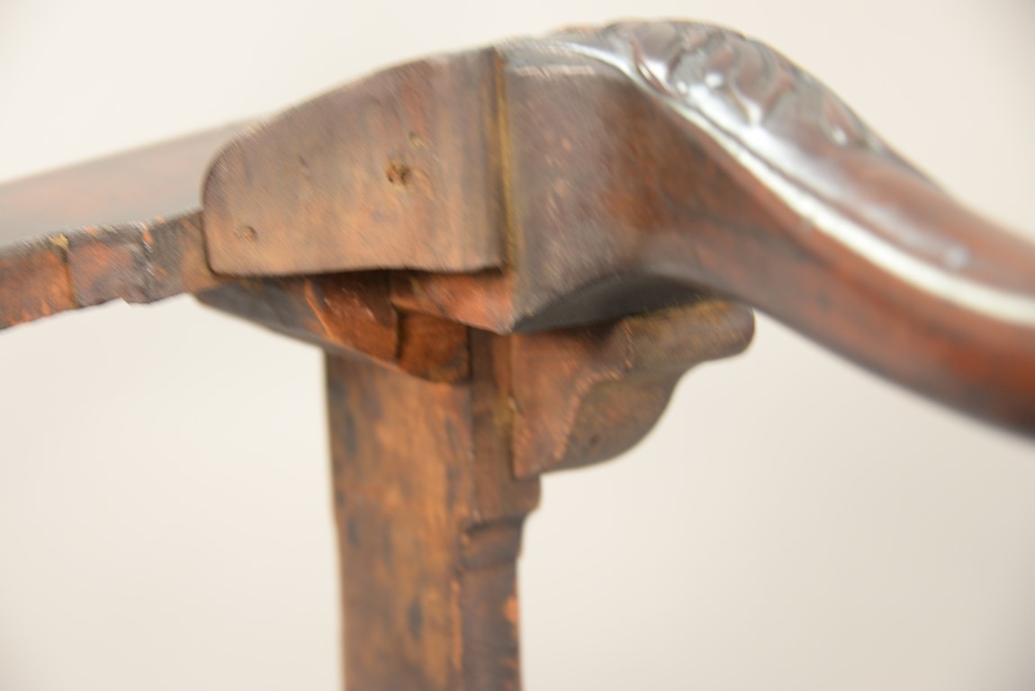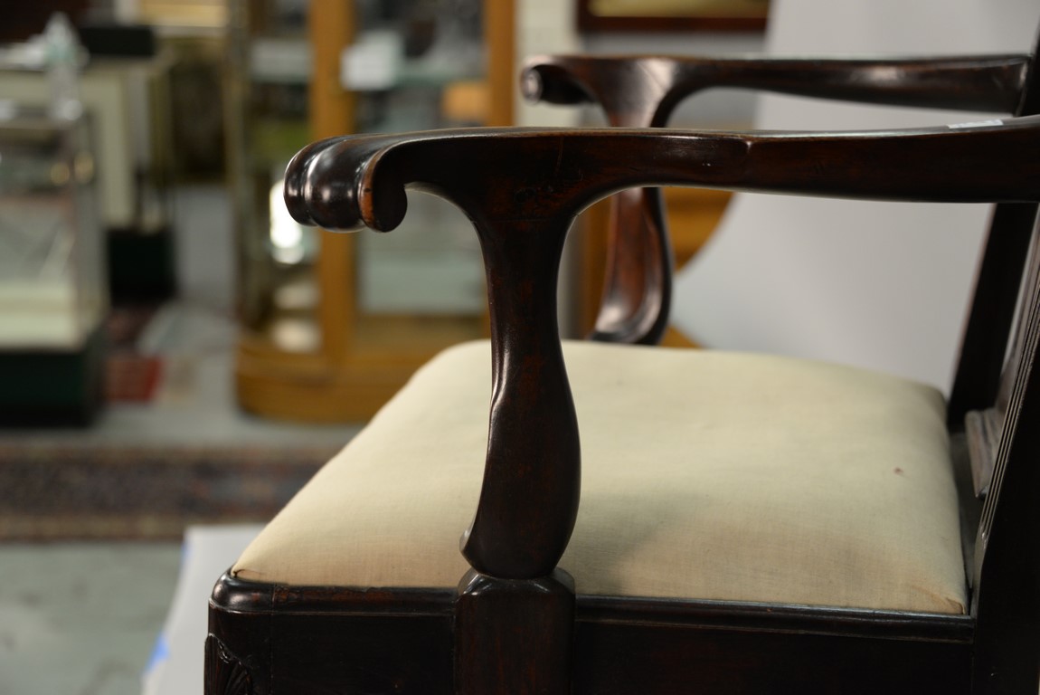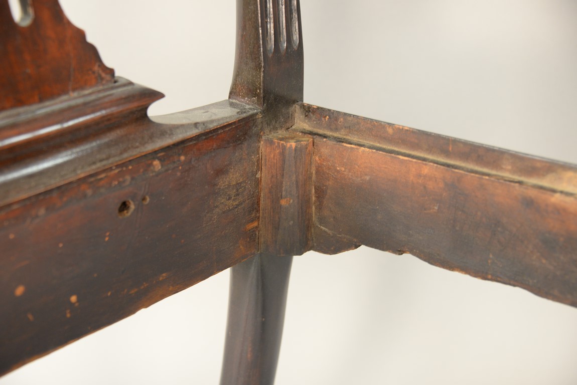 Lot 241: Mahogany Chippendale armchair having arched crest rail ornamented with carved rope and tassel motif and deeply scrolled ears with a center rocaille shell all over a pierced carved splat, the slip seat flanked by scrolled arms all set on cabriole legs
