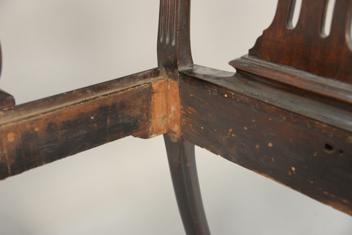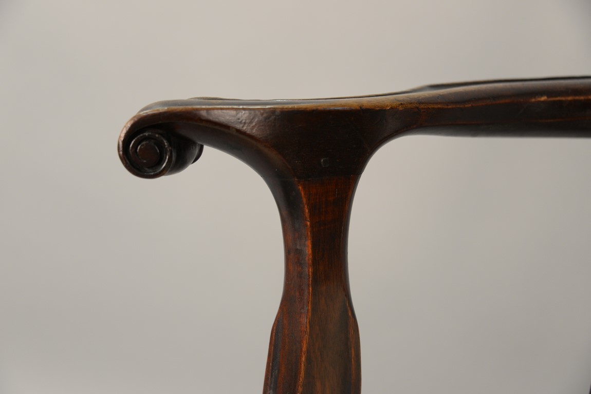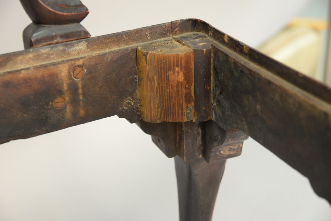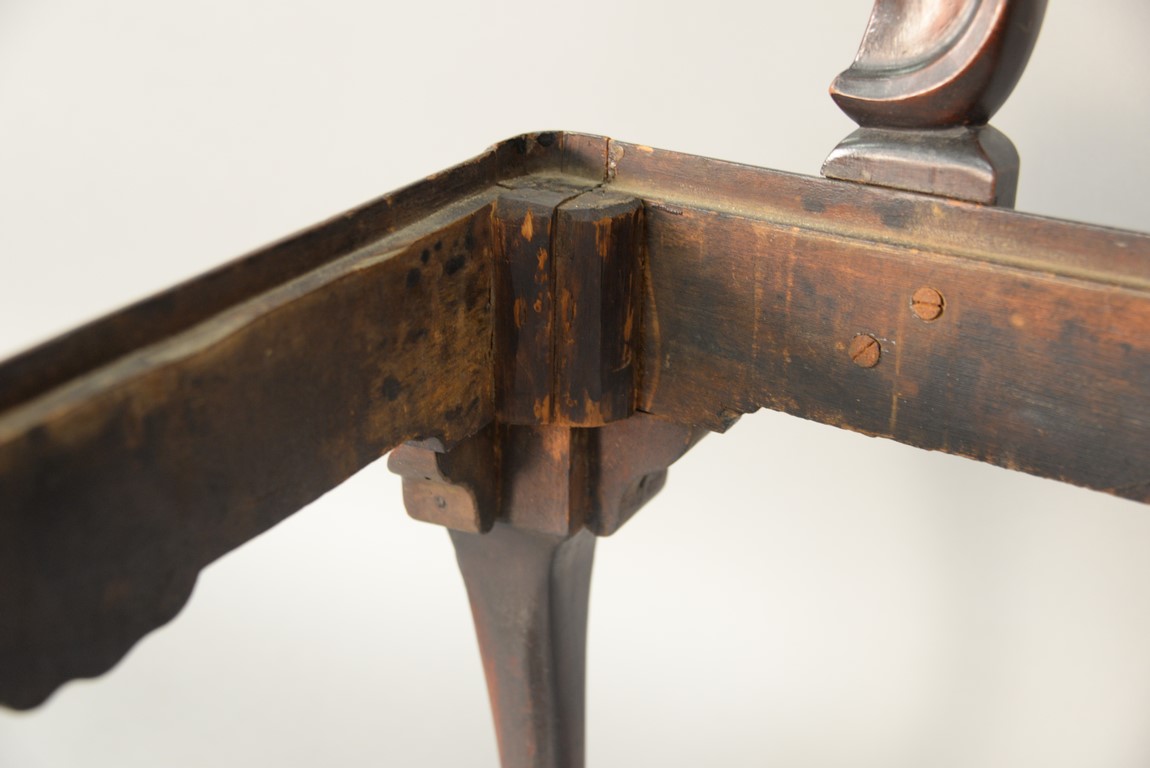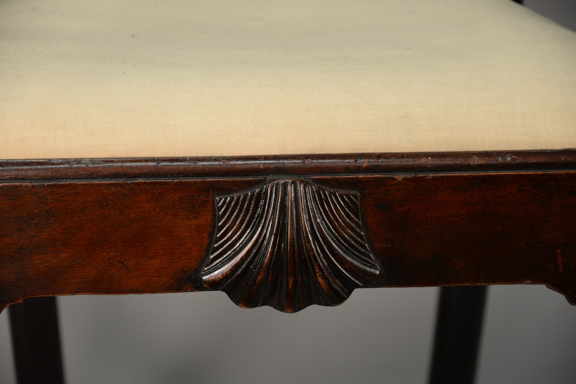 Lot 241: Mahogany Chippendale armchair having arched crest rail ornamented with carved rope and tassel motif and deeply scrolled ears with a center rocaille shell all over a pierced carved splat, the slip seat flanked by scrolled arms all set on cabriole legs