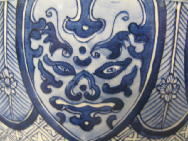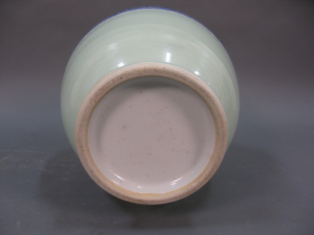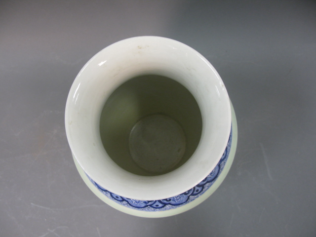 Oriental large celadon and blue vase having blue painted lappet collar.