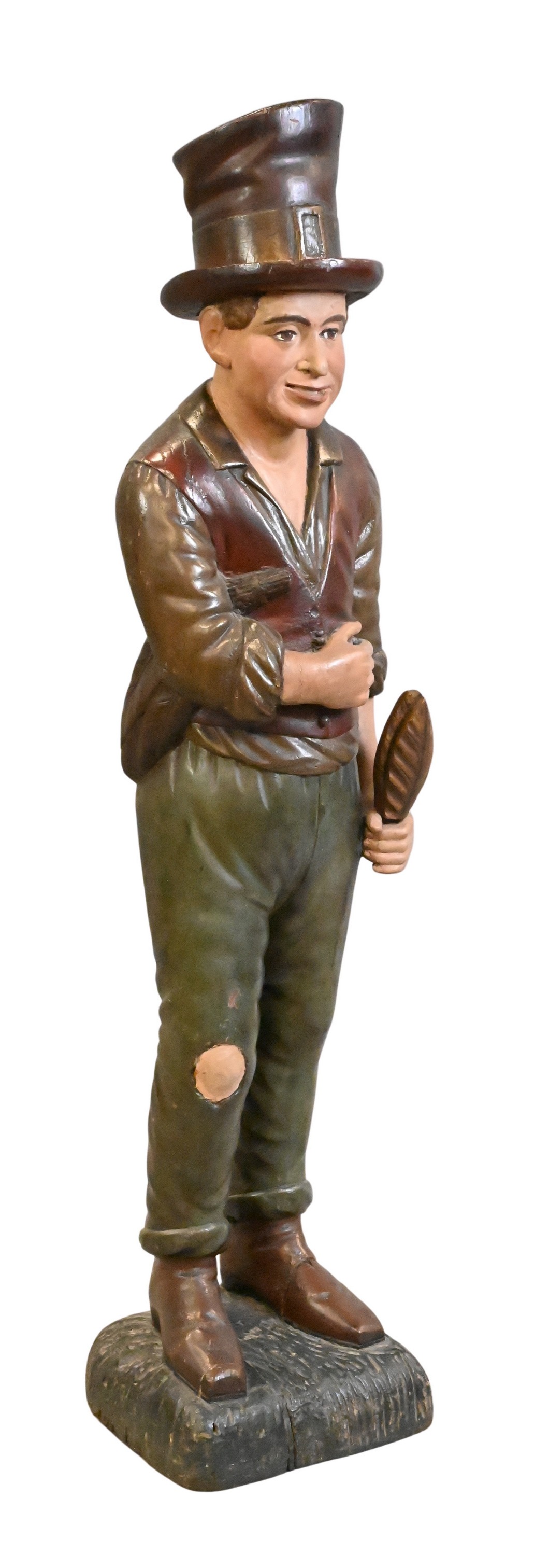 figure standing with left hand holding a tobacco leaf, right hand now lacking flag pole, retaining old paint, raised on a square base.